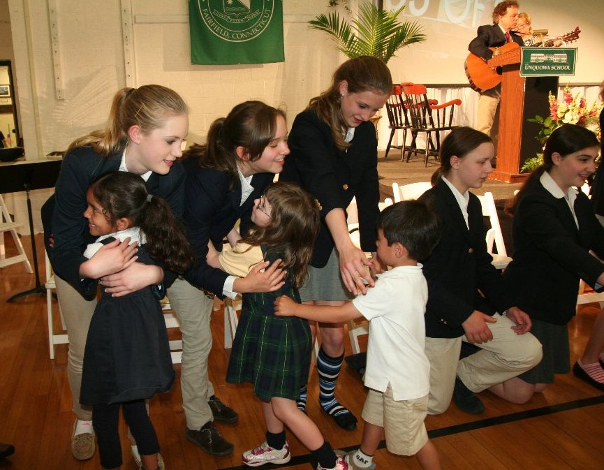 In the morning, the entire school gathered for our Closing Ceremonies – an event filled with traditions including the recognition of summer birthdays and the reading by faculty of tributes written collaboratively about each graduating class member’s most poignant time at Unquowa. After watching a special video tribute to the Class of 2014, the eighth graders formed a receiving line in the front of the gym and Ms. Lauer invited the seventh graders to “take the eighth grade seats.” This symbolic move marked the passing of the mantel of school leadership from the outgoing class to next year’s eighth graders, the Class of 2015.