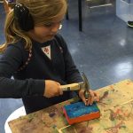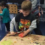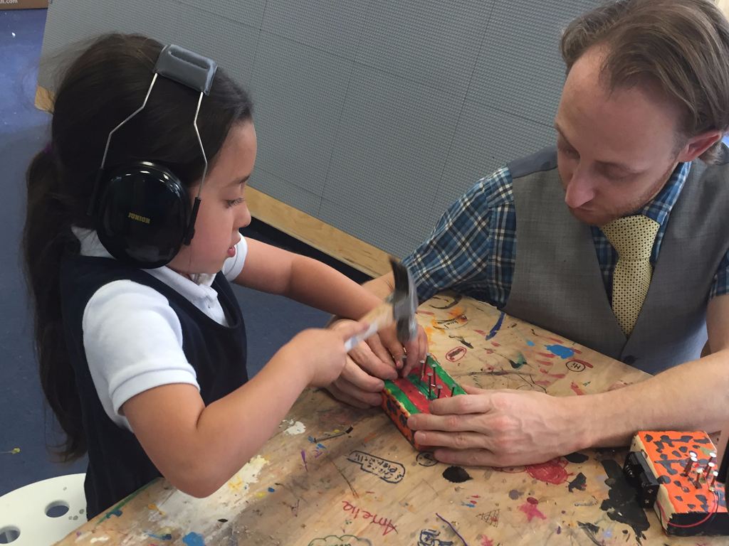 Posted by Faith BarbutoFor the past several months our kindergarten makers have been spending time working on a project that encompasses all the skills we have developed this year. First blocks of wood were measured and sawed, then sanded down and painted. Students used rulers to mark one inch intervals and carefully hammered holes into their blocks. Next came the time to use screwdrivers as we added a battery compartment to the side of each block. Moving on to our study of electricity students used wires and led lights to build real working circuits!