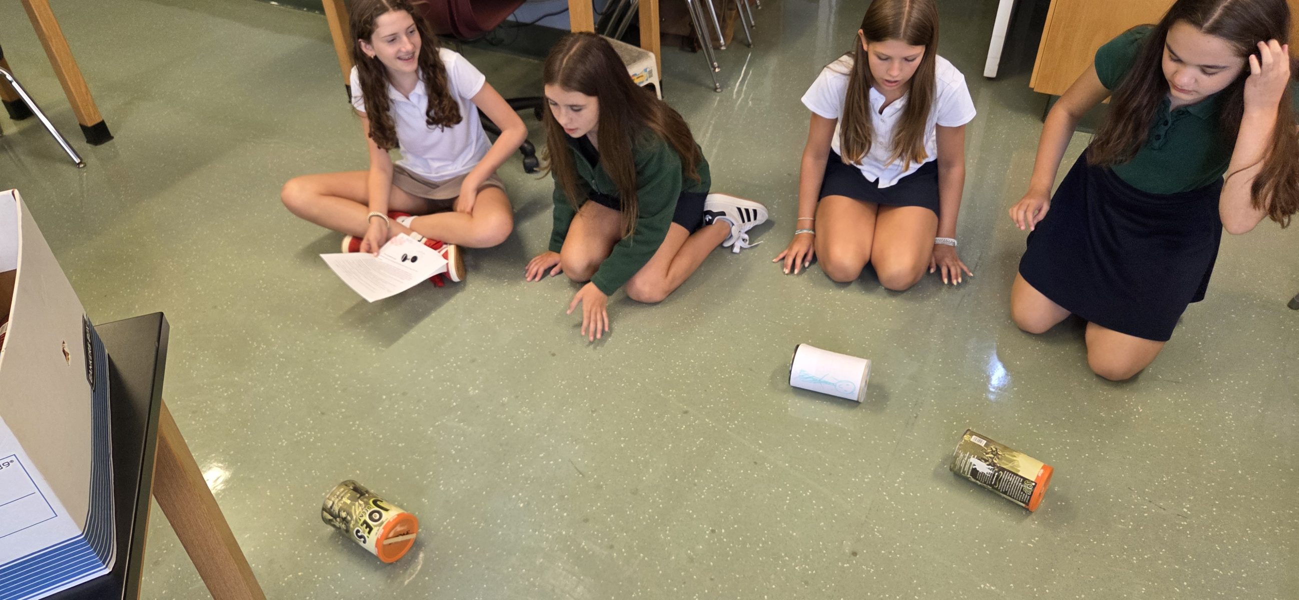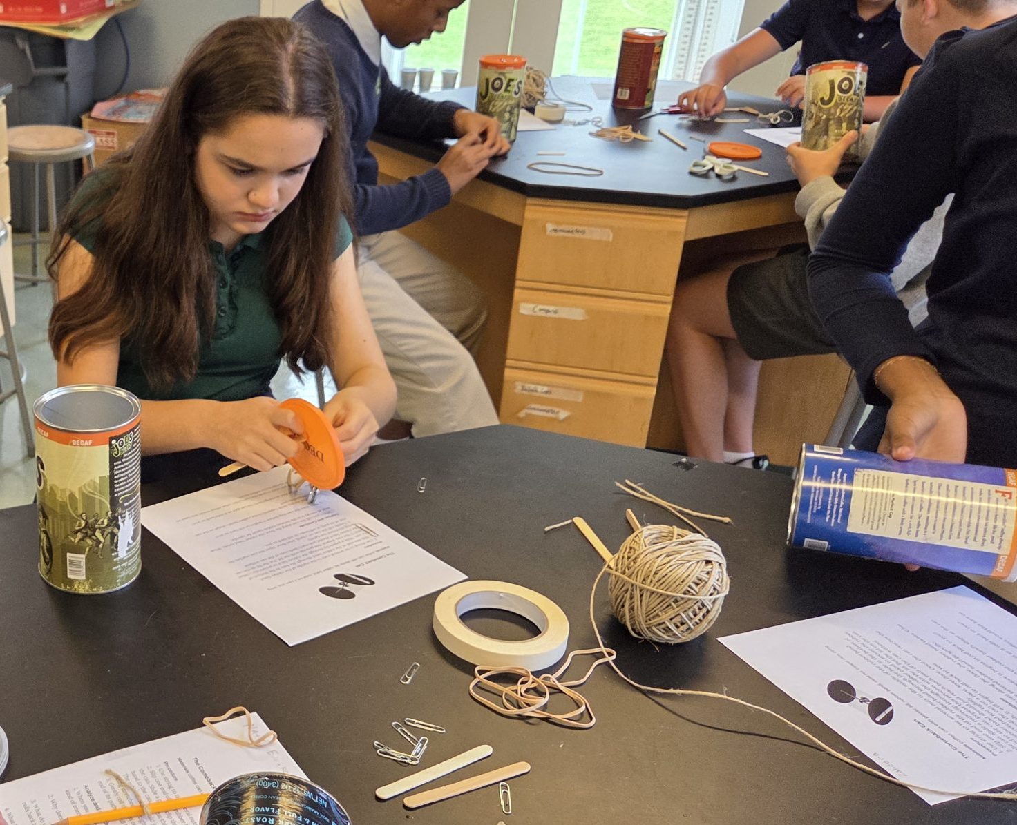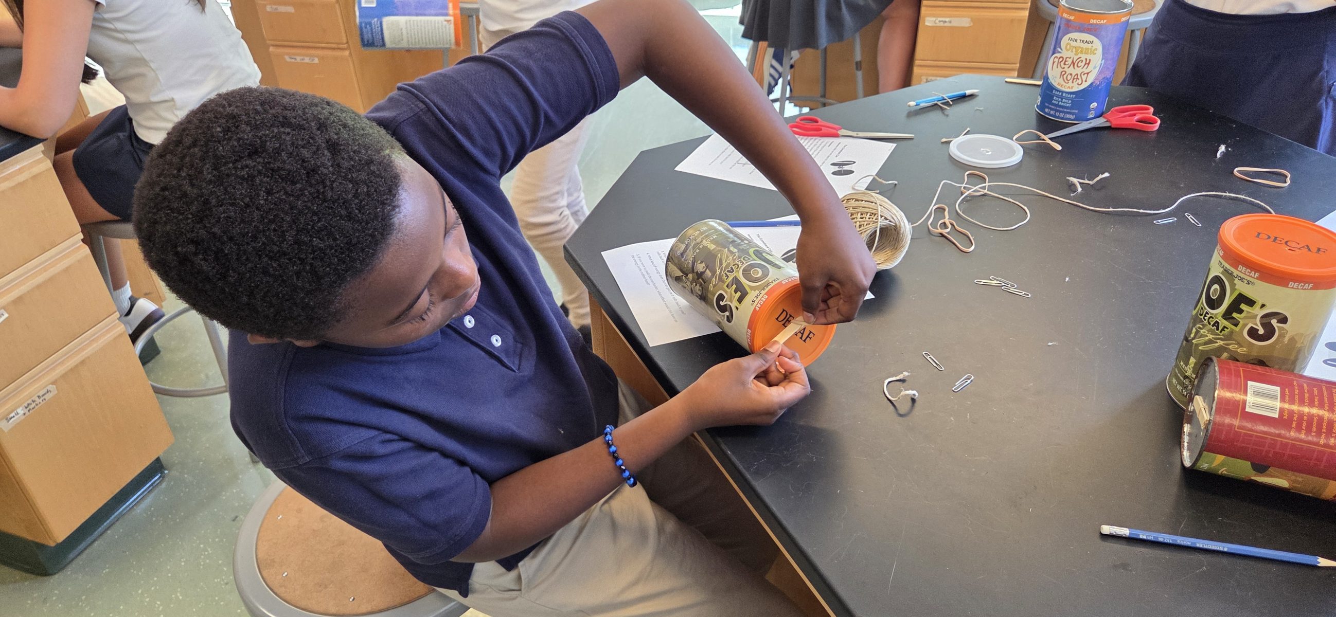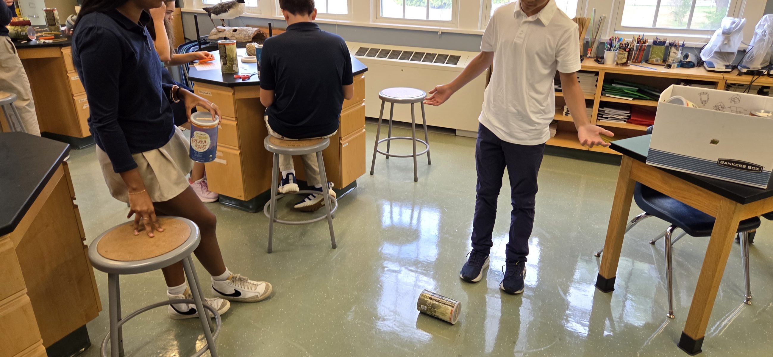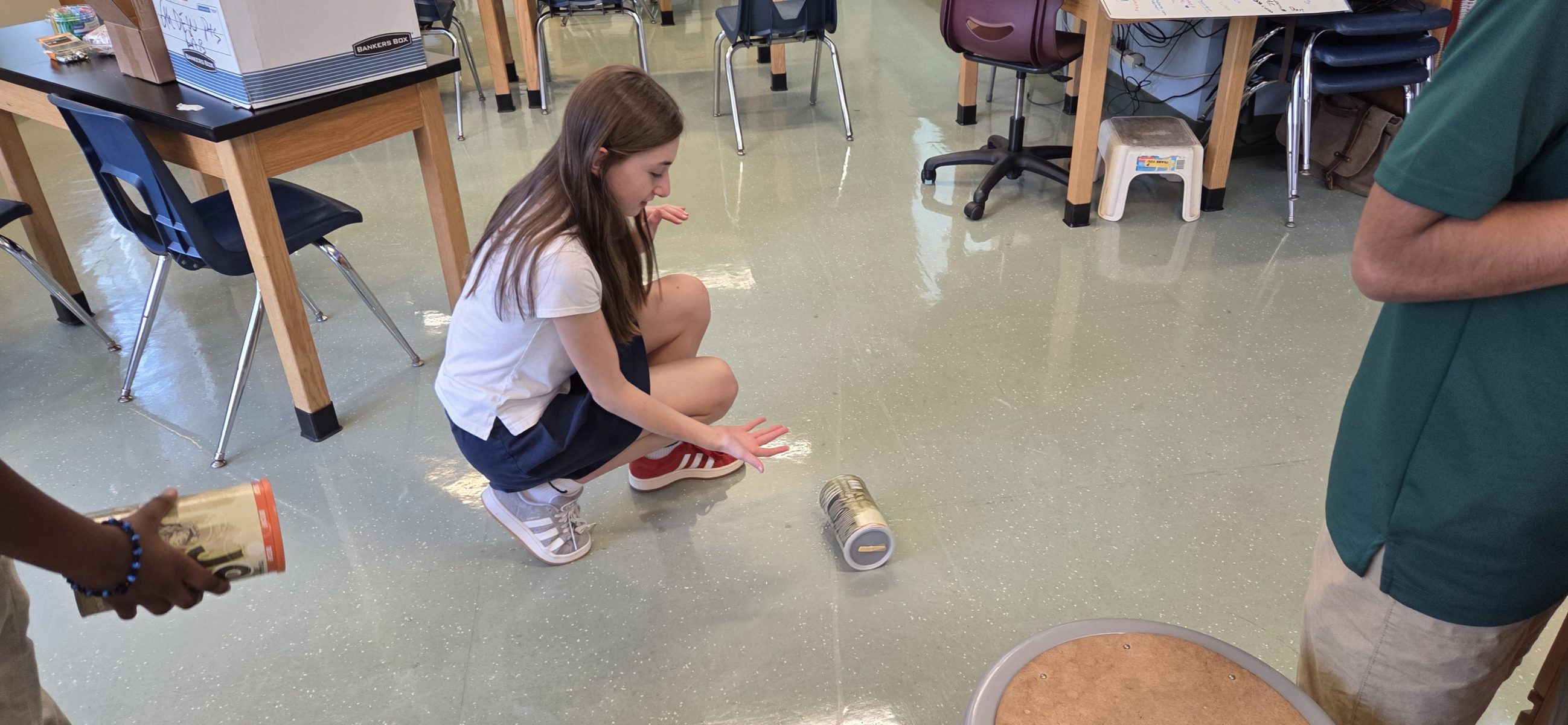 To kick off the year in science, our 8th graders started learning about forms of energy, energy transfer (when a specific type of energy stays the same through a system but is passed from one object to another) and energy transformation (when a type of energy changes to another type). Some types of energy we covered included Potential Energy (stored energy), Gravitational Potential Energy (energy due to gravity pulling down), Kinetic Energy (energy associated with movement), Chemical Energy (like batteries or gasoline), Sound Energy, Thermal Energy (energy from heat), Electromagnetic Energy (like light energy), Magnetic Energy, Electrical Energy, Elastic Potential Energy (like energy from stretching a rubber band), and Nuclear Energy. In this lab, our students built contraptions known as the “Comeback can” or the “rollback can”. This lab demonstrated a couple of different principles in which there was energy transfer (kinetic energy from the students hand to kinetic energy in the can) as well as energy transformation (kinetic energy in the can to elastic potential energy in the rubber band within the can, then back to kinetic energy in the can itself). If the students built the models correctly, when they roll the can away from them there is a rubber band with a weight tied to it on the inside of the can which causes the rubber band to twist as the can rolls. The can eventually will stop rolling because all of the kinetic energy transforms into elastic potential energy in the rubber band which very quickly unwinds causing the energy to transform back into kinetic energy and it rolls back to the student. In the end, students had a better understanding of energy transfer vs energy transformation all while having a blast!
