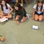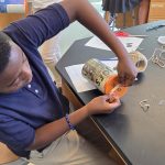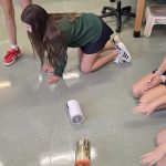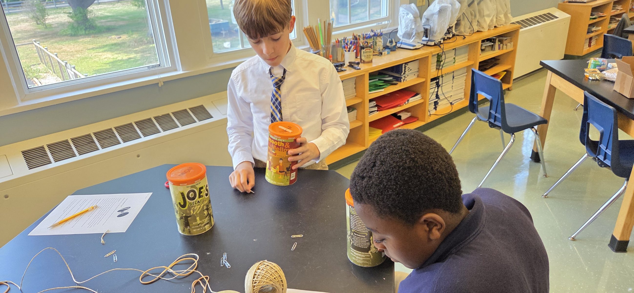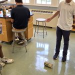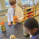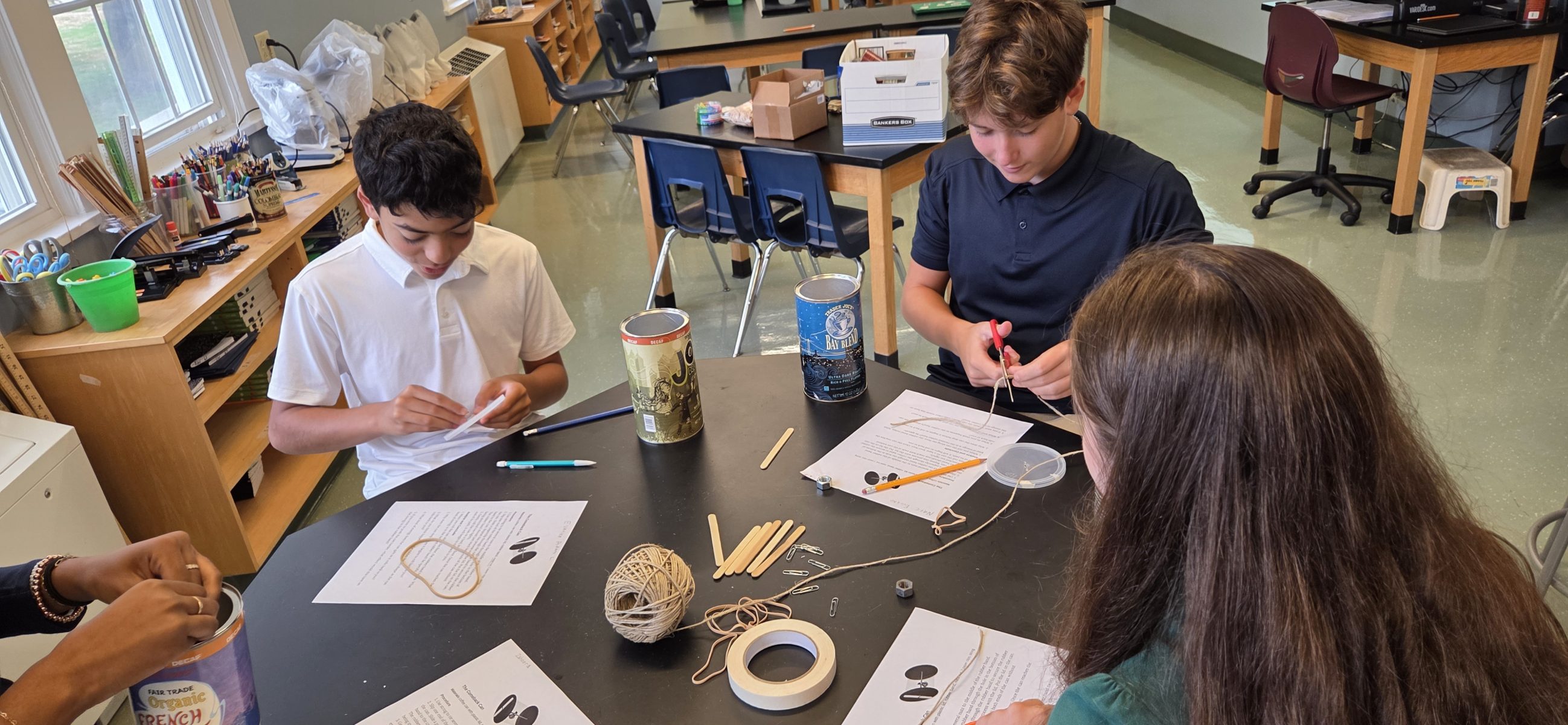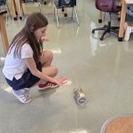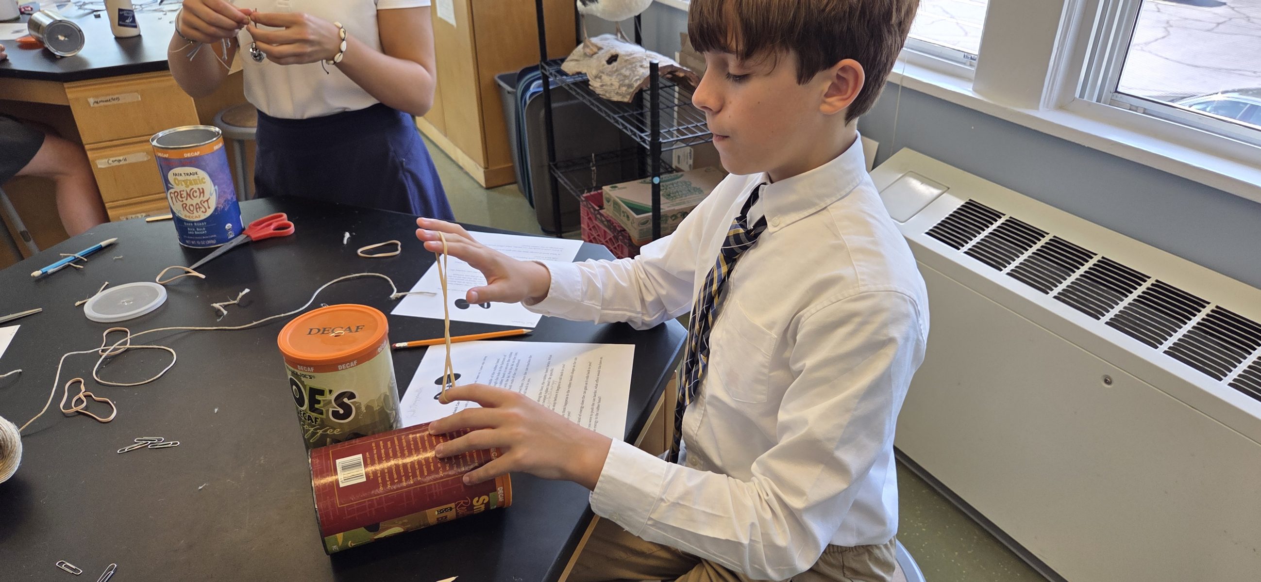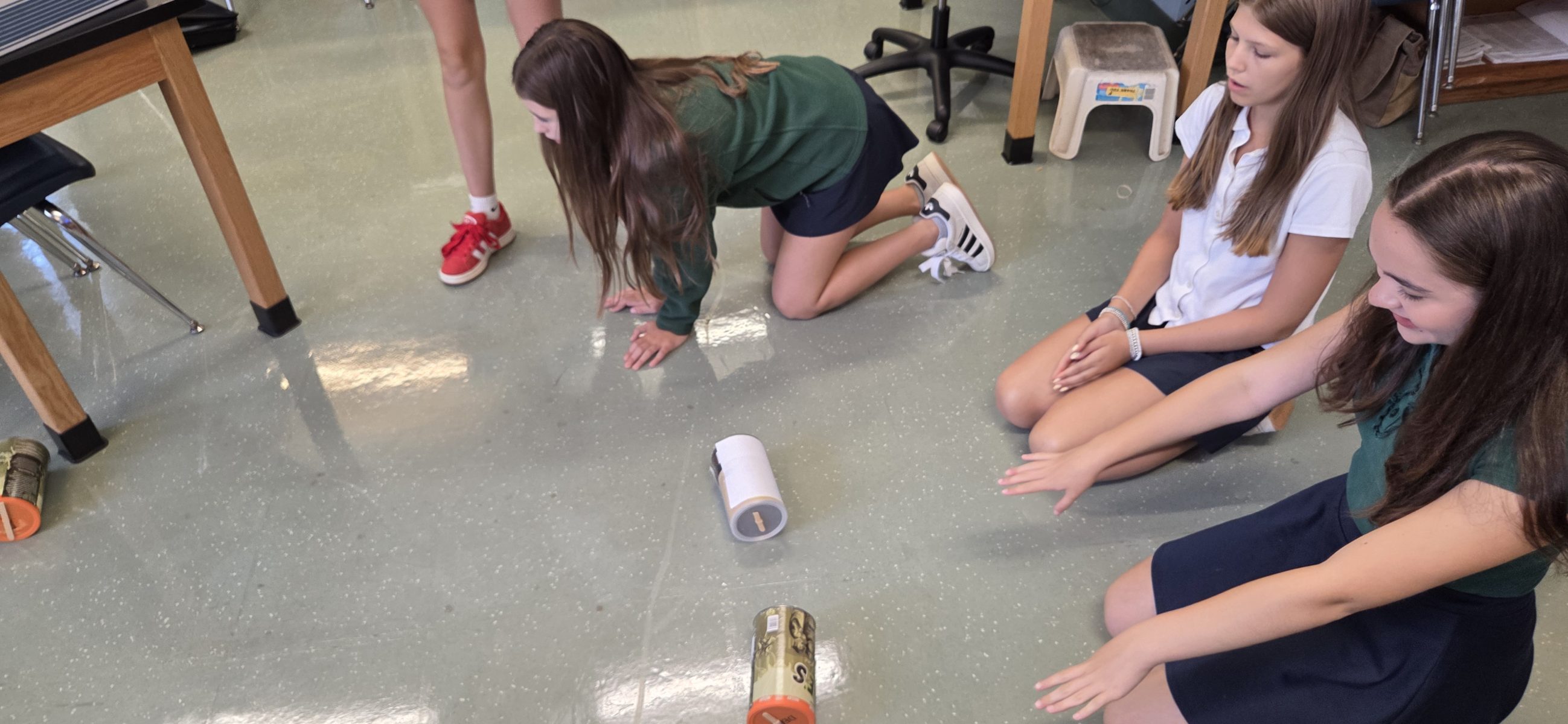 To kick off the year in science, our 8th graders started learning about forms of energy, energy transfer (when a specific type of energy stays the same through a system but is passed from one object to another) and energy transformation (when a type of energy changes to another type). Some types of energy we covered included Potential Energy (stored energy), Gravitational Potential Energy (energy due to gravity pulling down), Kinetic Energy (energy associated with movement), Chemical Energy (like batteries or gasoline), Sound Energy, Thermal Energy (energy from heat), Electromagnetic Energy (like light energy), Magnetic Energy, Electrical Energy, Elastic Potential Energy (like energy from stretching a rubber band), and Nuclear Energy. In this lab, our students built contraptions known as the “Comeback can” or the “rollback can”. This lab demonstrated a couple of different principles in which there was energy transfer (kinetic energy from the students hand to kinetic energy in the can) as well as energy transformation (kinetic energy in the can to elastic potential energy in the rubber band within the can, then back to kinetic energy in the can itself). If the students built the models correctly, when they roll the can away from them there is a rubber band with a weight tied to it on the inside of the can which causes the rubber band to twist as the can rolls. The can eventually will stop rolling because all of the kinetic energy transforms into elastic potential energy in the rubber band which very quickly unwinds causing the energy to transform back into kinetic energy and it rolls back to the student. In the end, students had a better understanding of energy transfer vs energy transformation all while having a blast!
