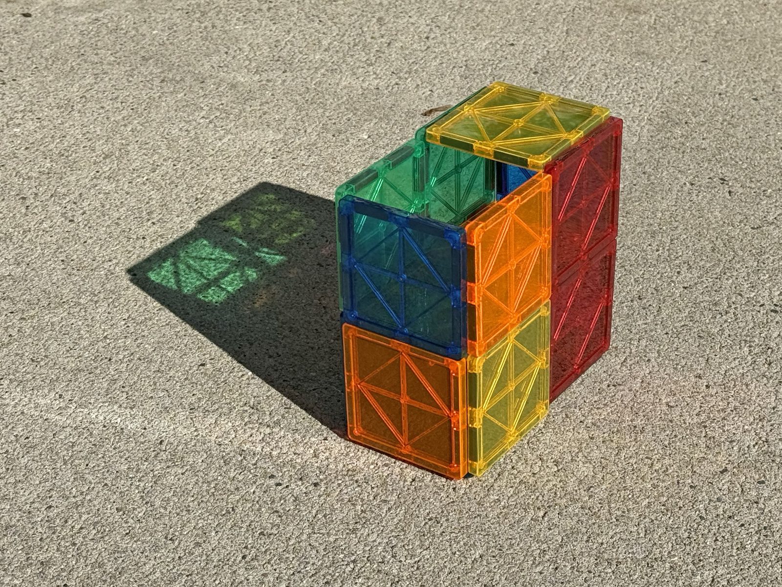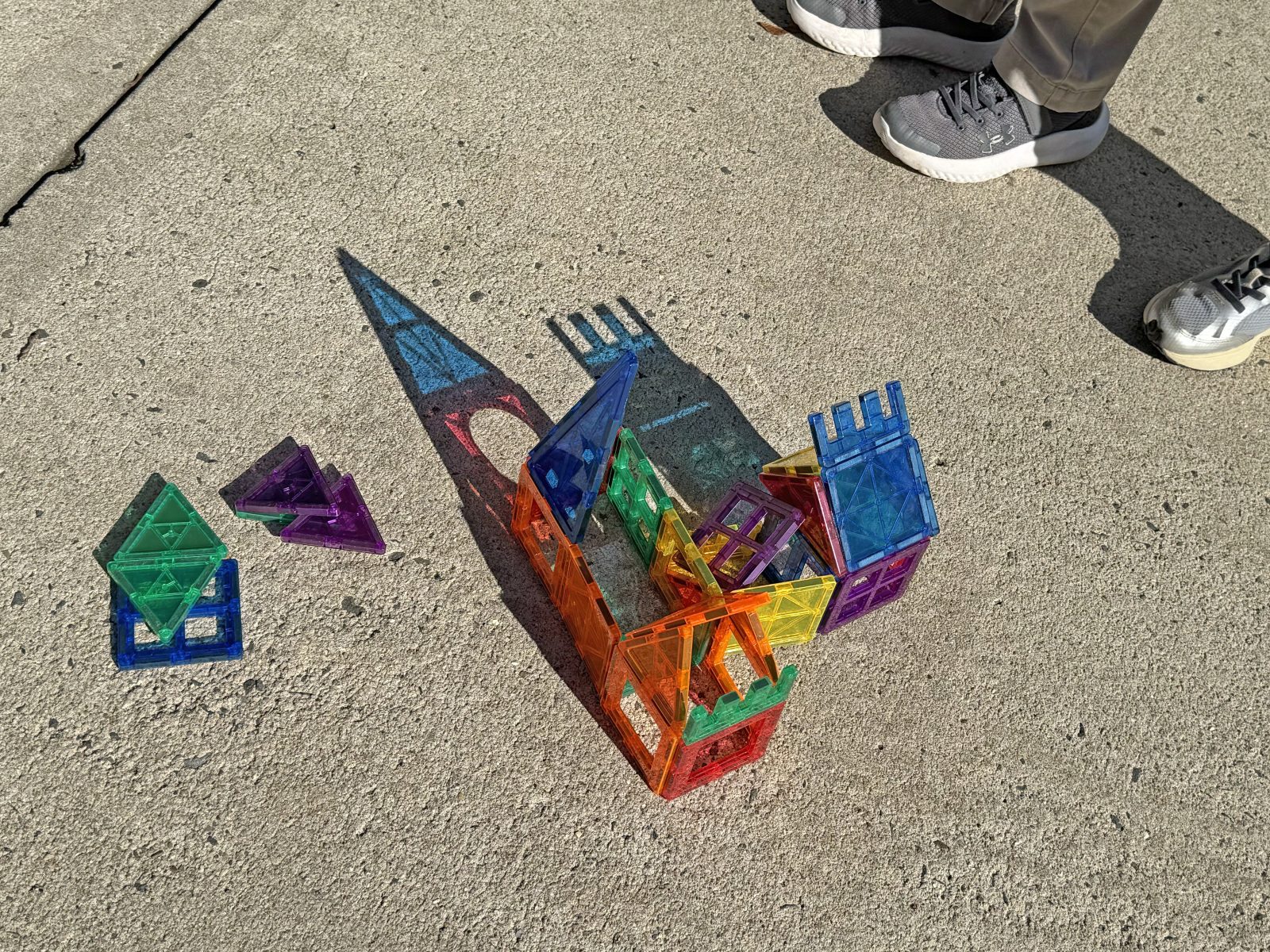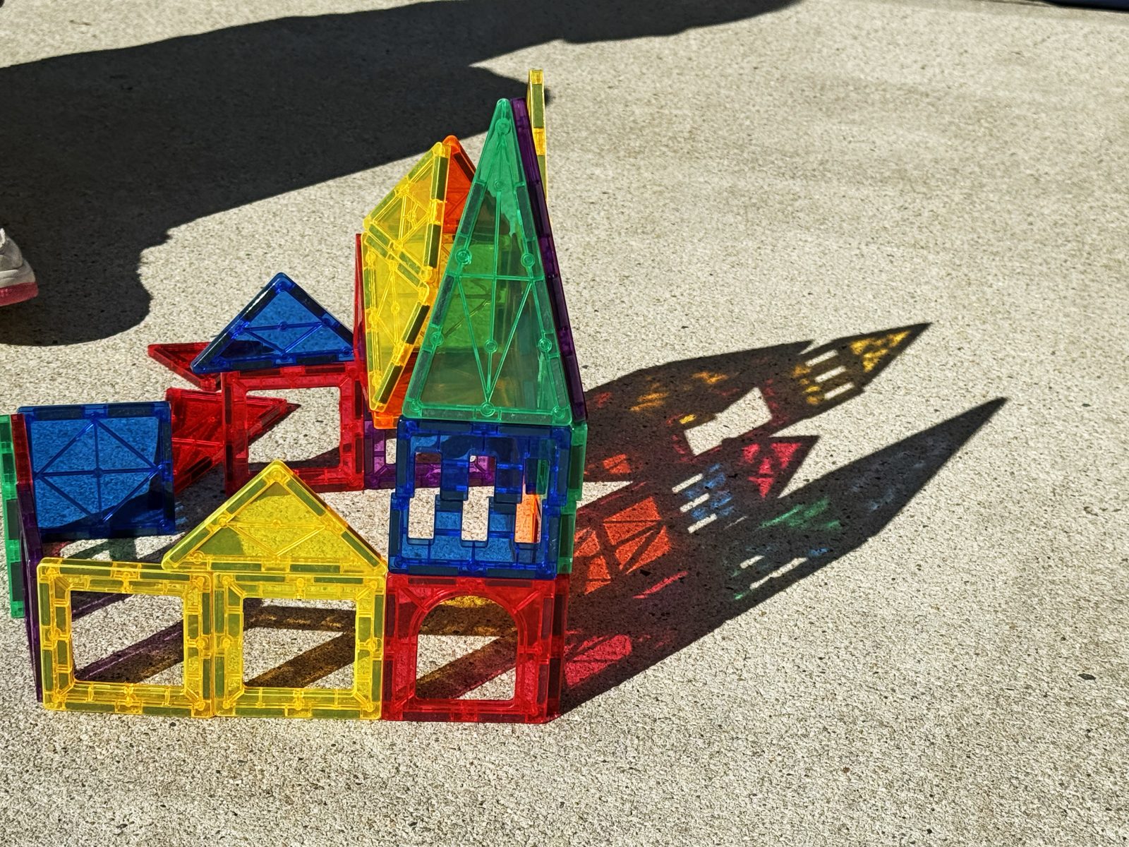 After testing different classroom objects, we took our learning outside to the courtyard! The students brought their Magna-Tiles to build colorful structures in the afternoon sunlight. Because Magna-Tiles are translucent, the sunlight was able to shine through them, creating beautiful, glowing reflections of color on the ground.