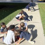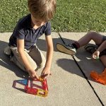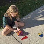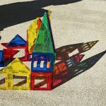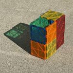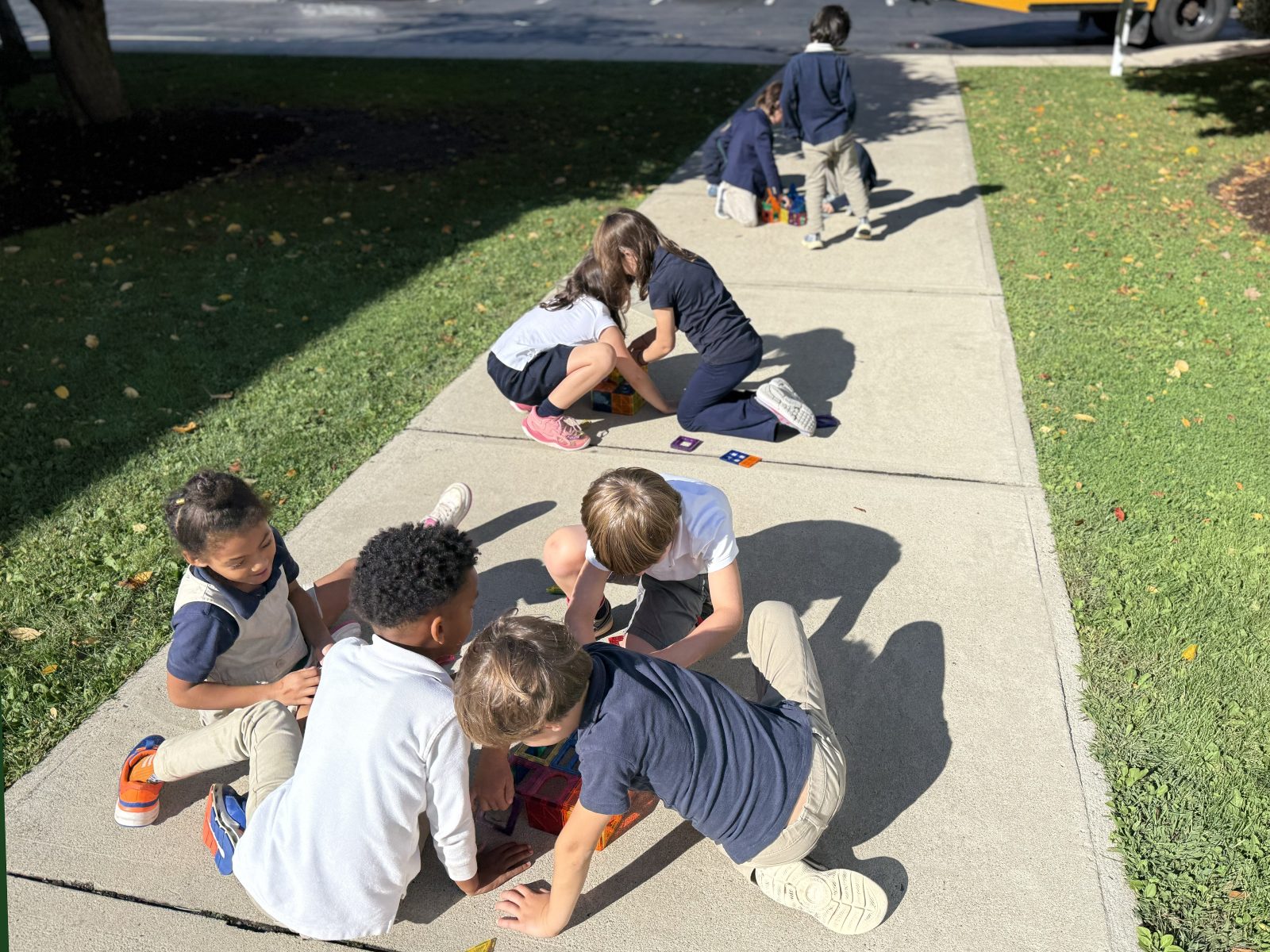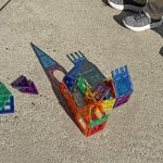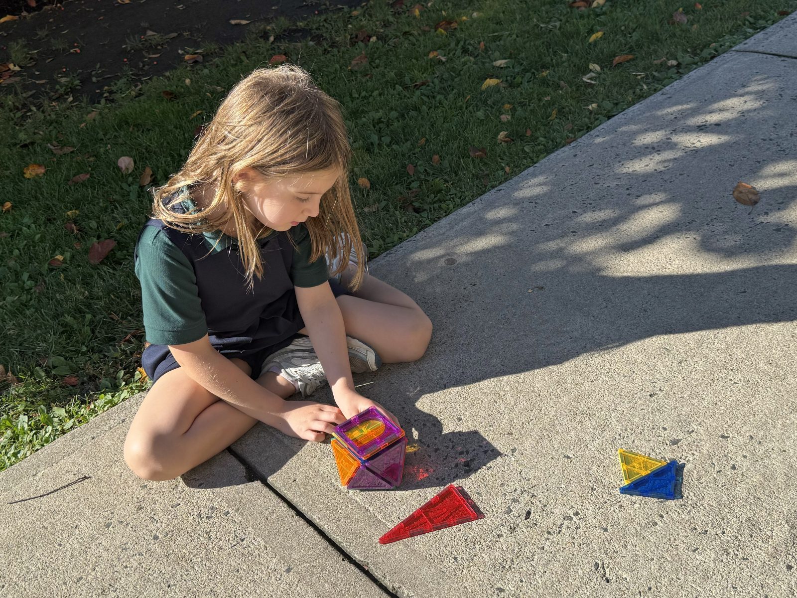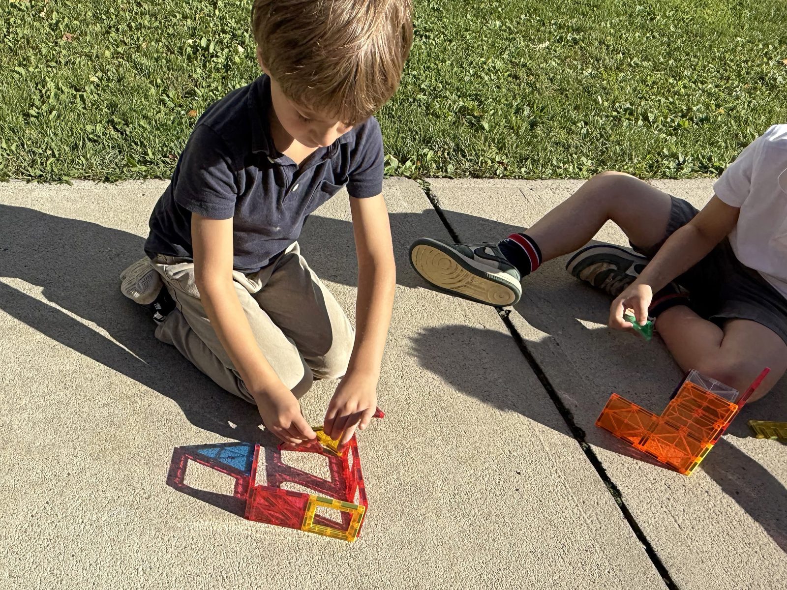 After testing different classroom objects, we took our learning outside to the courtyard! The students brought their Magna-Tiles to build colorful structures in the afternoon sunlight. Because Magna-Tiles are translucent, the sunlight was able to shine through them, creating beautiful, glowing reflections of color on the ground.