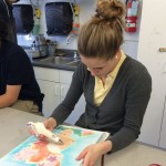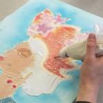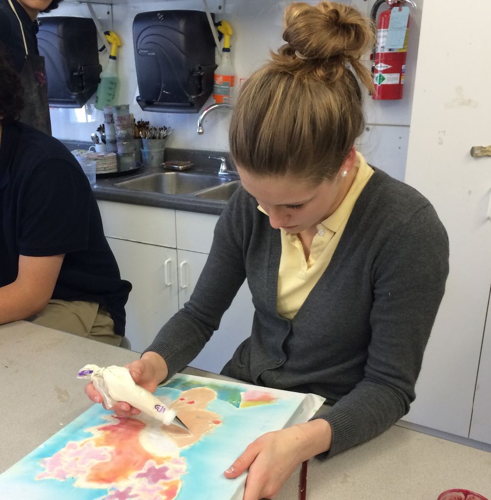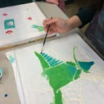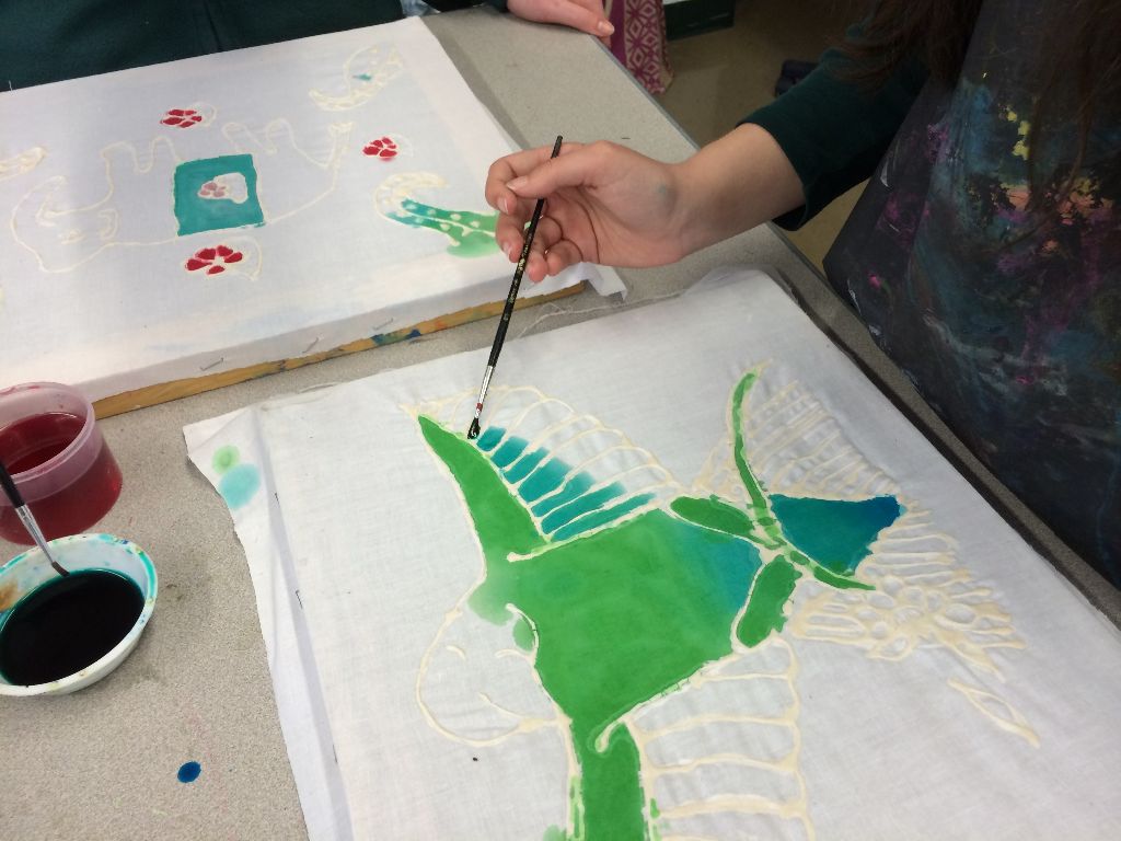 Posted by Krissy PondenAmong the many art forms that Bali is famous for, perhaps one of the most interesting is batik. Batik techniques have been practiced in Indonesia for over a thousand years, and today it is not only a way to decorate fabric for clothing and sarongs, but also a legitimate artistic medium. Originally the only colors used were indigo, brown, and white, which represented the major Hindu deities. The color palette has since expanded to include a vibrant rainbow of hues. Traditional Balinese batiking involves hot melted wax, which protects cloth fibers from colored dyes. This year we experimented with a different resist technique that is practiced in African countries: substituting flour paste for the wax. The students alternated between applying layers of paste and dye until their design was complete. The final step will be to remove the paste and reveal the finished image. We are excited to see the results of this unusual medium!