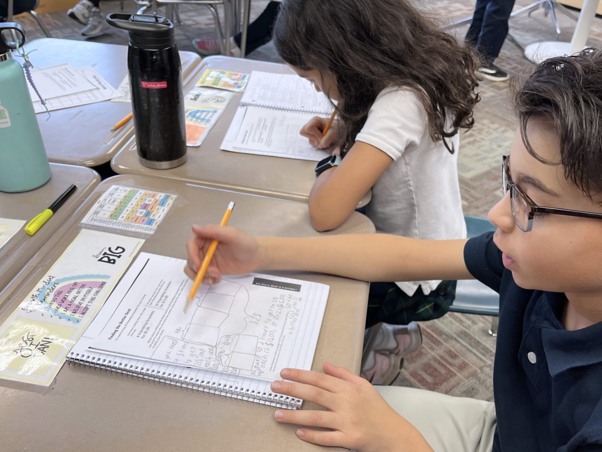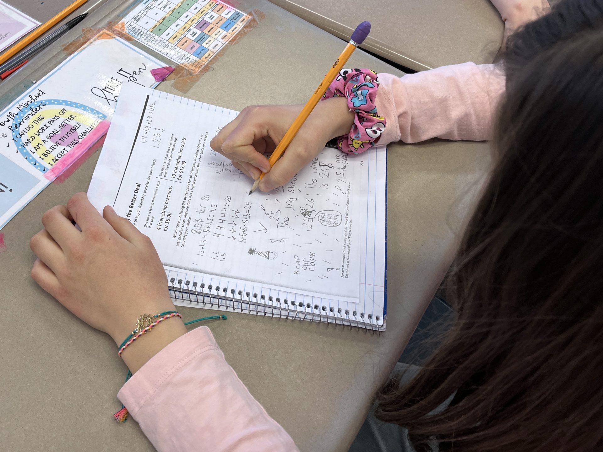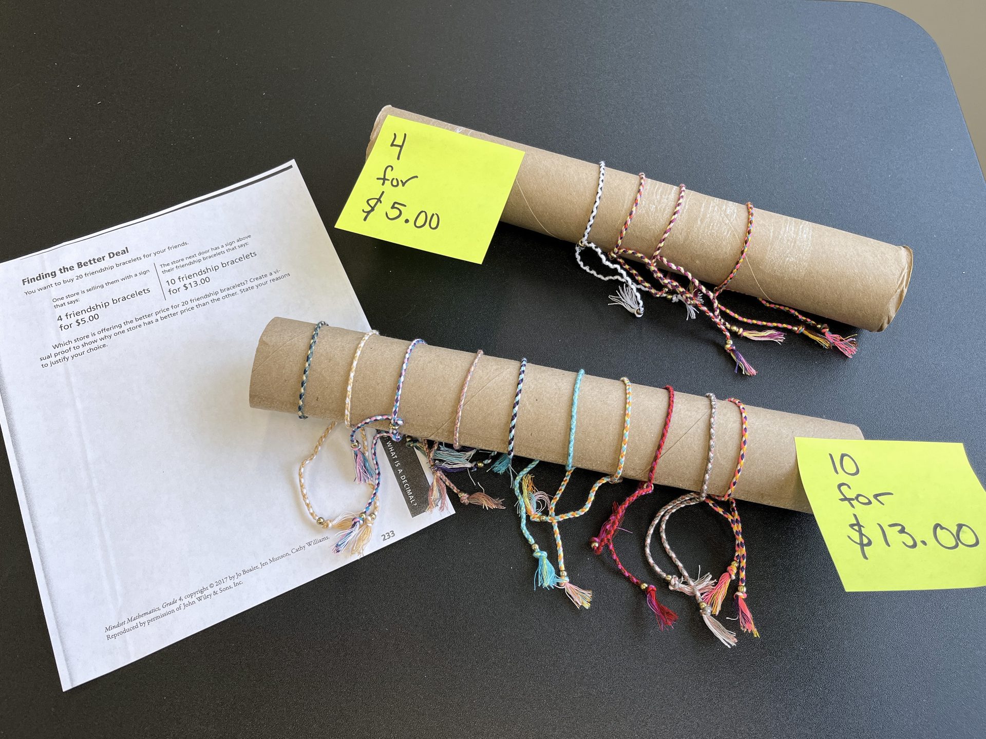 Posted by Karen EngelkeGrade 4 began their exploration of decimals by constructing visual proofs to determine which store has the better deal on friendship bracelets. Asking students to think visually about a situation that can be real for them offers them a helpful experience. Students used their understanding of money to support their thinking about decimal numbers.