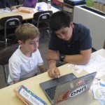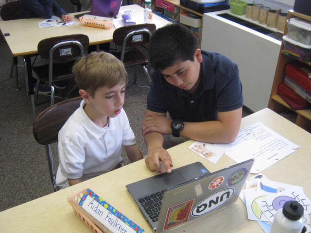 Posted by Katie BrennaSeventh graders recently put not only their Spanish skills to the test, but their teaching skills as well when they visited the kindergarten and first grade classrooms to work one-on-one sharing an interactive story on their Chromebooks. A seemingly simple task, seventh graders soon realized that this was a more challenging task than they had anticipated. They worked hard to develop strong pre-reading and post-reading activities and to create meaningful props to bring the story to life. The fruits of their labor really paid off too. Young learners enjoyed learning about Miau the cat and others, but perhaps what they loved the most was watching seventh graders act like the cats in the story! Especially Rodolfo, as he likes to play with rolls of toilet paper!