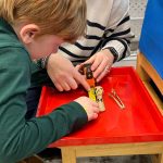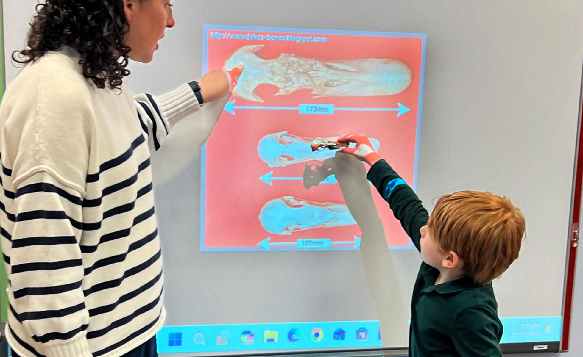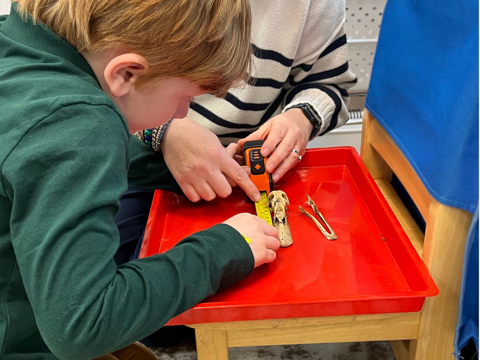 Building upon this excitement and to find the answer to some of our many questions, the next day our Kindergarten scientists took a closer look at our now cleaned skull, and did some research. We knew the skull had to belong to a billed bird, but we weren’t sure it wasn’t a goose or swan instead of a duck. We quickly ruled out swan because our bird’s bill did not have a sharp point on the end. We then measured the length of the skull, and discovered it was indeed duck…a mallard duck skull! We learned about the distinct features of mallard ducks, their habitats and their diets. We hypothesized that the mallard may have been looking for some of the small insects we uncovered or for acorns, as they are known to eat both. We may never know what happened to the duck, but we are so grateful we were the ones that found it and are keeping it safe in the newly designated, “Kindergarten Museum.”