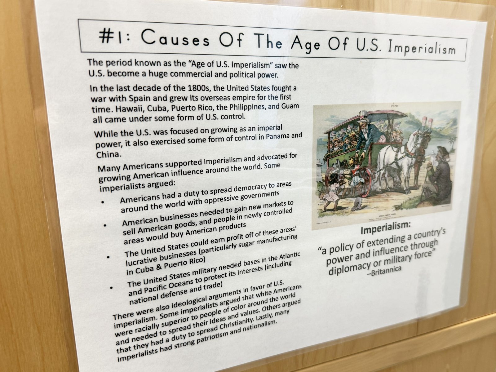Students rotated around the classroom to different stations, where they found a variety of primary and secondary sources. At each station, they worked to interpret evidence, answer guiding questions, and wrestle with competing perspectives as they analyzed political cartoons, speeches, historical documents, and data. Some sources highlighted arguments for U.S. imperialism, such as economic growth, national security, and global influence, while others powerfully revealed the human cost and ethical concerns tied to these policies.