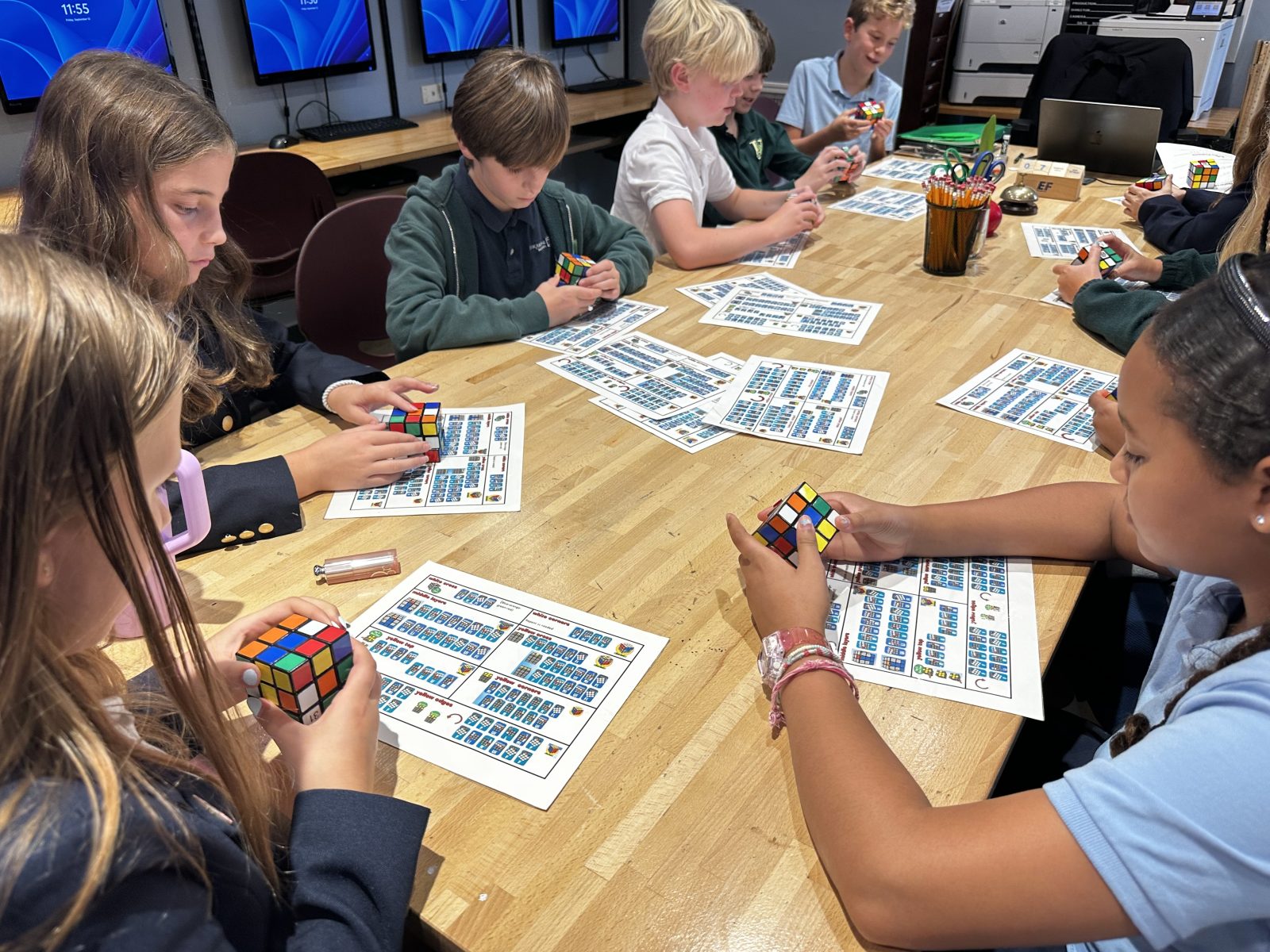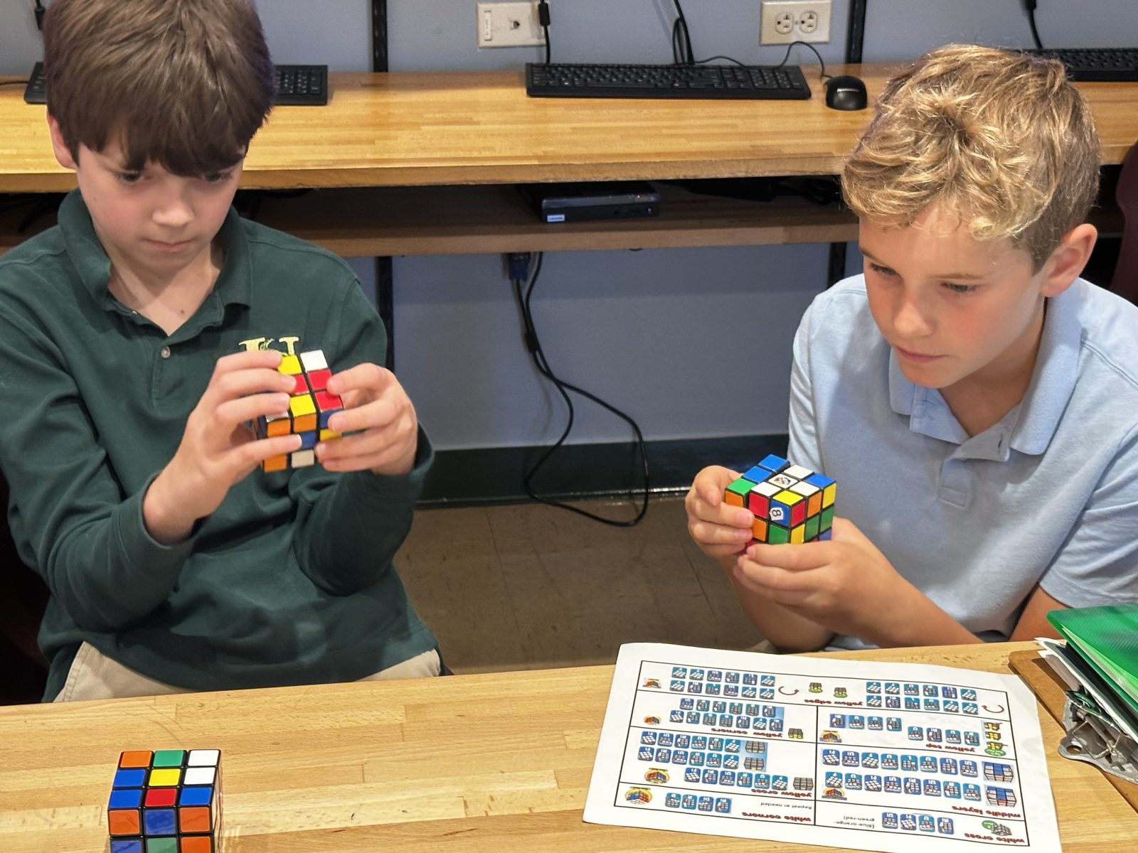 Posted by Lloyd MitchellIn 5th and 6th grade classes, we’ve been tackling an “unplugged” tech challenge: solving the Rubik’s Cube. It’s an activity that, at first glance, seems like a puzzle only for geniuses, but it’s really a fantastic lesson in computer science. We learn that what appears to be a magical, random jumble is actually a system governed by algorithms – just like the programs that make our phones and computers work. By memorizing and executing a series of specific, repeatable directions, my students discover that they can manipulate the cube to reach a desired outcome. This teaches them a fundamental principle: with the right set of instructions, even the most complex problems can be broken down and solved logically, demystifying the power of both technology and their own problem-solving skills.
