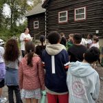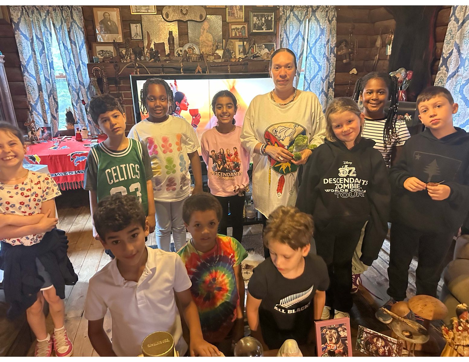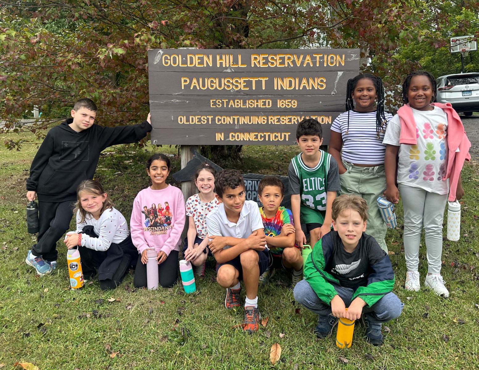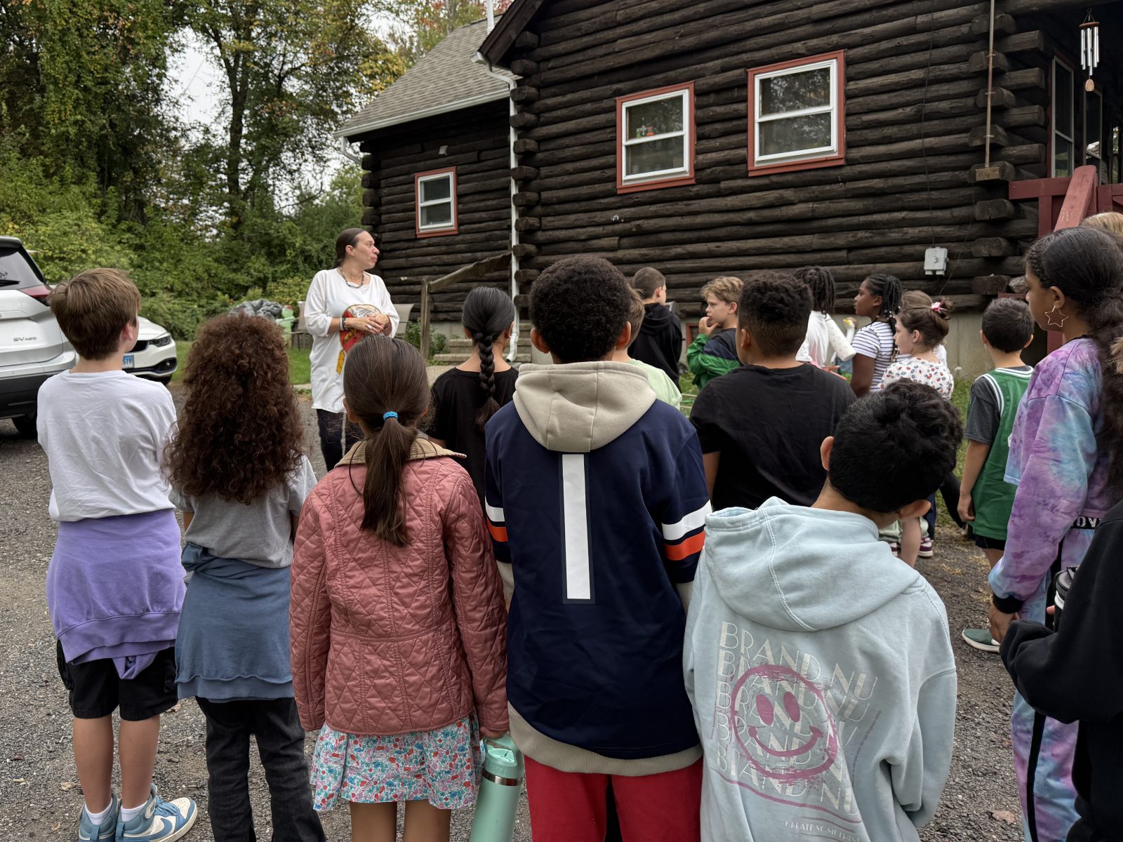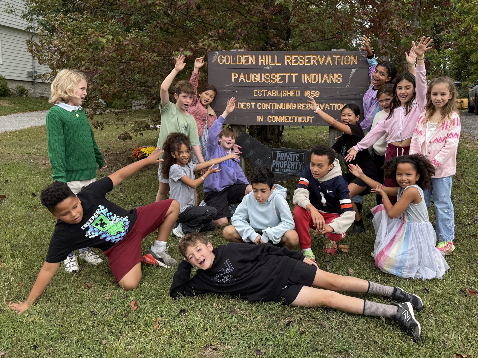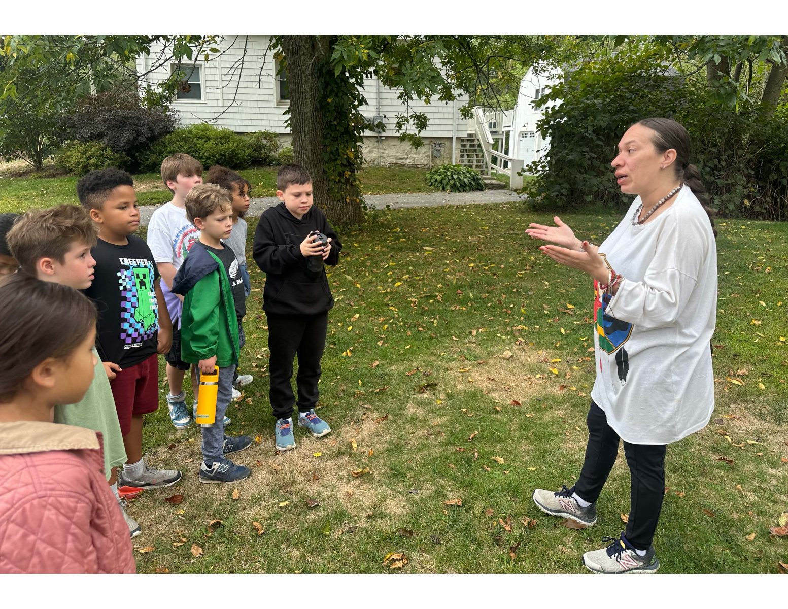 This week the Third & Fourth Graders had a chance to visit this small but mighty reservation, and meet Clan Mother and Tribal Head Leader of the Golden Hill Paugussett Tribe, Shoran Waupatukuay Piper. She kindly guided us around the grounds and welcomed us into her home. Students had a chance to see the perimeter of the log house and hear how native plants are used for medicine, food, salves, and teas. Inside, she shared ceremonial items like the drum, tools made from antlers & hooves, arrows and photographs of her ancestors and fellow clan members.