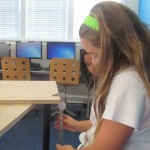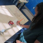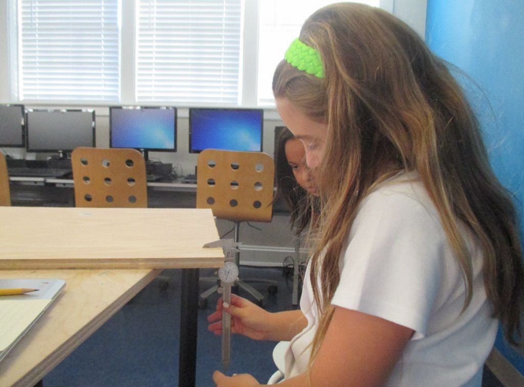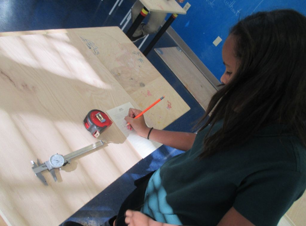 The second step – ongoing as the students come down in small groups during social studies and flex time – is to measure the dimensions of their piece of plywood. The most important dimension, as students have learned, is the thickness of the material, which they measure using a caliper. When using the CNC router, the cut depth must be set about .002 deeper than the thickness of the material to ensure a clean cut all the way through: accuracy and precision matter! Students record their measurements on a sheet of paper they will use in the next step.