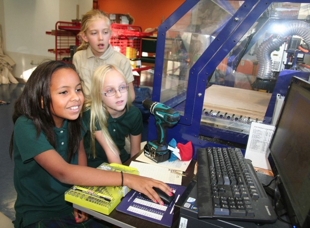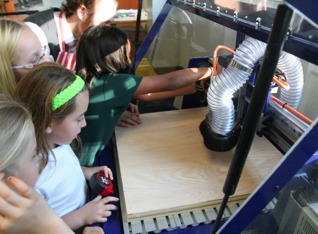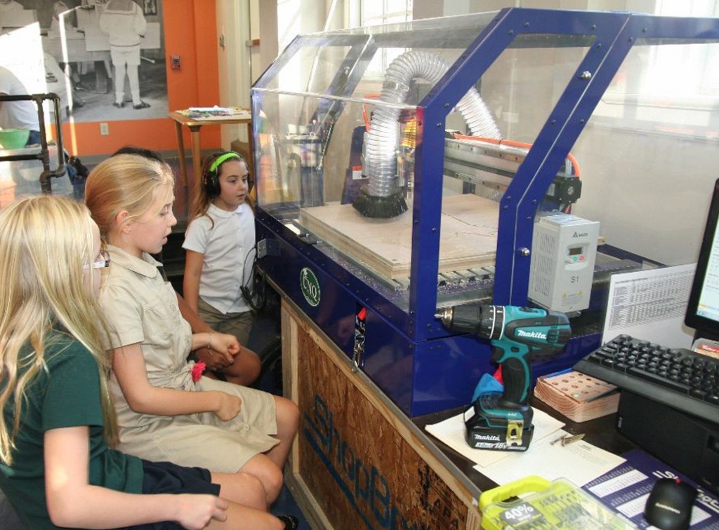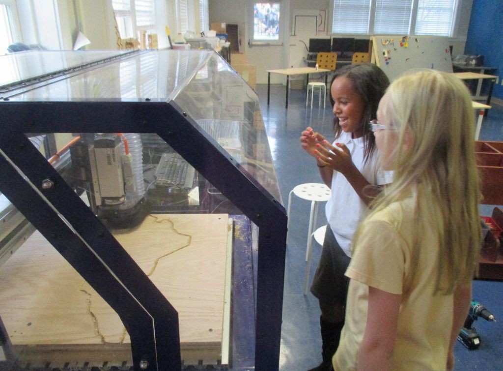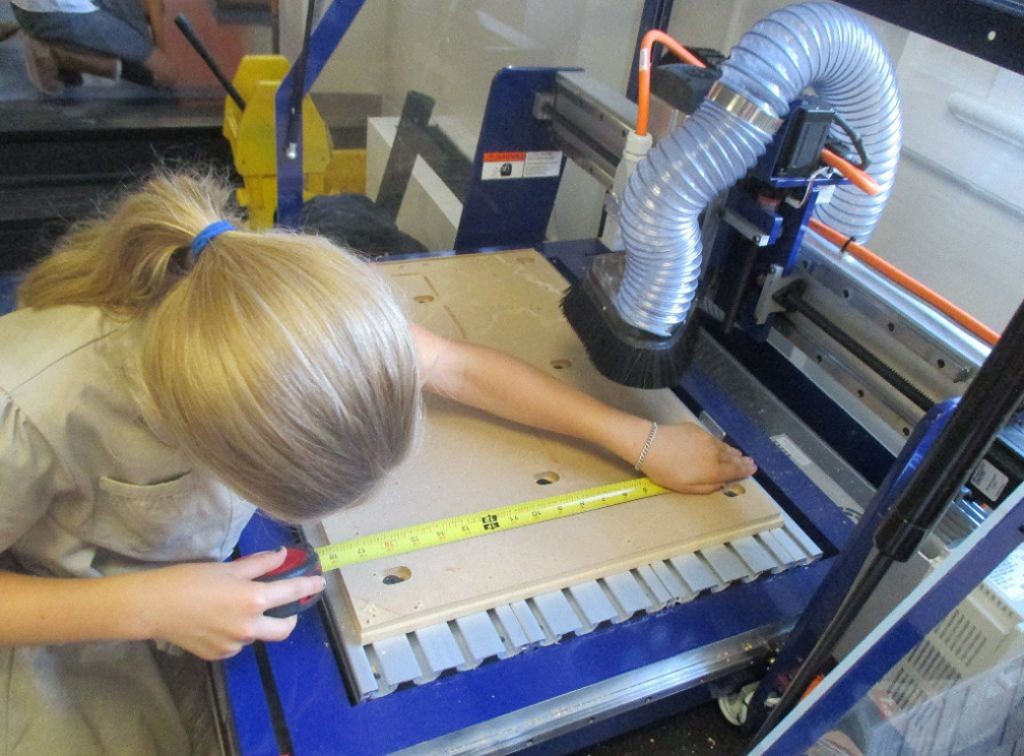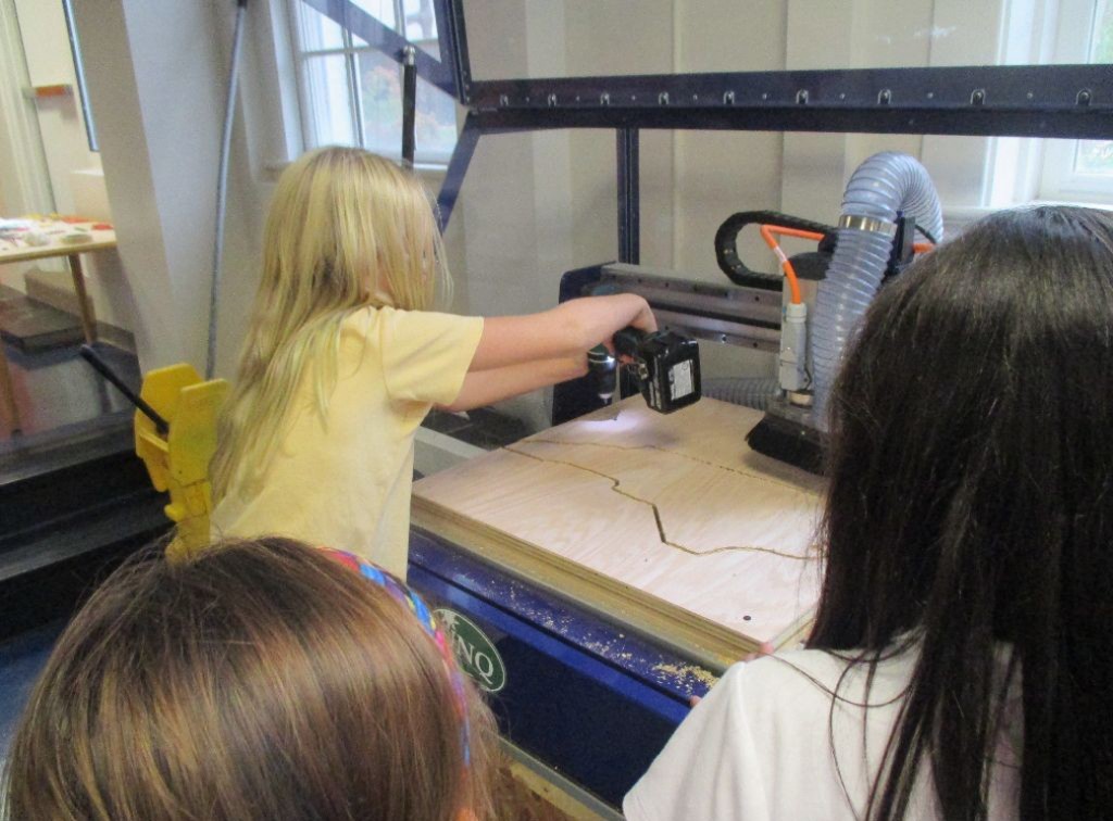 Posted by Jamie BartelsWhen fourth graders come down to the makerspace to cut out new state lines, it isn’t for politics — they’re here to measure their pieces of plywood and program the CNC router to carve a chosen state for social studies.