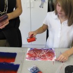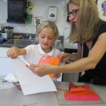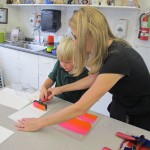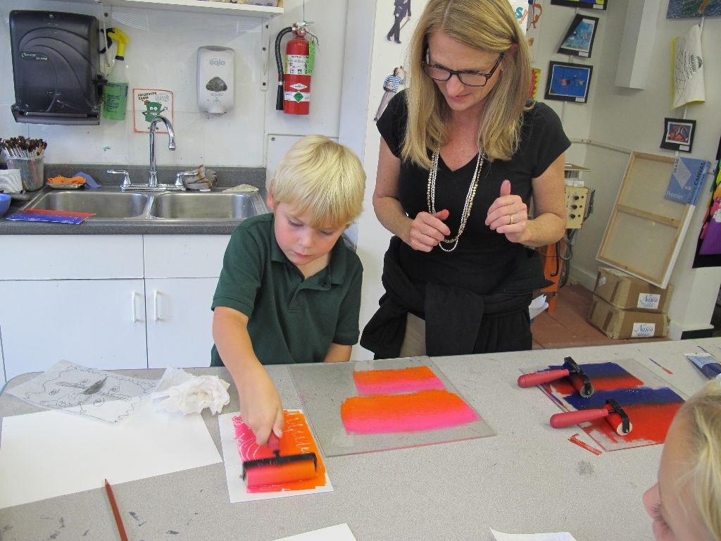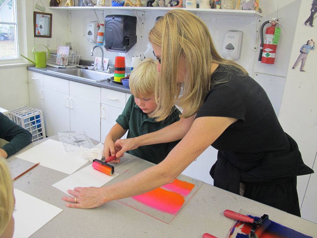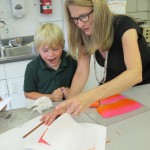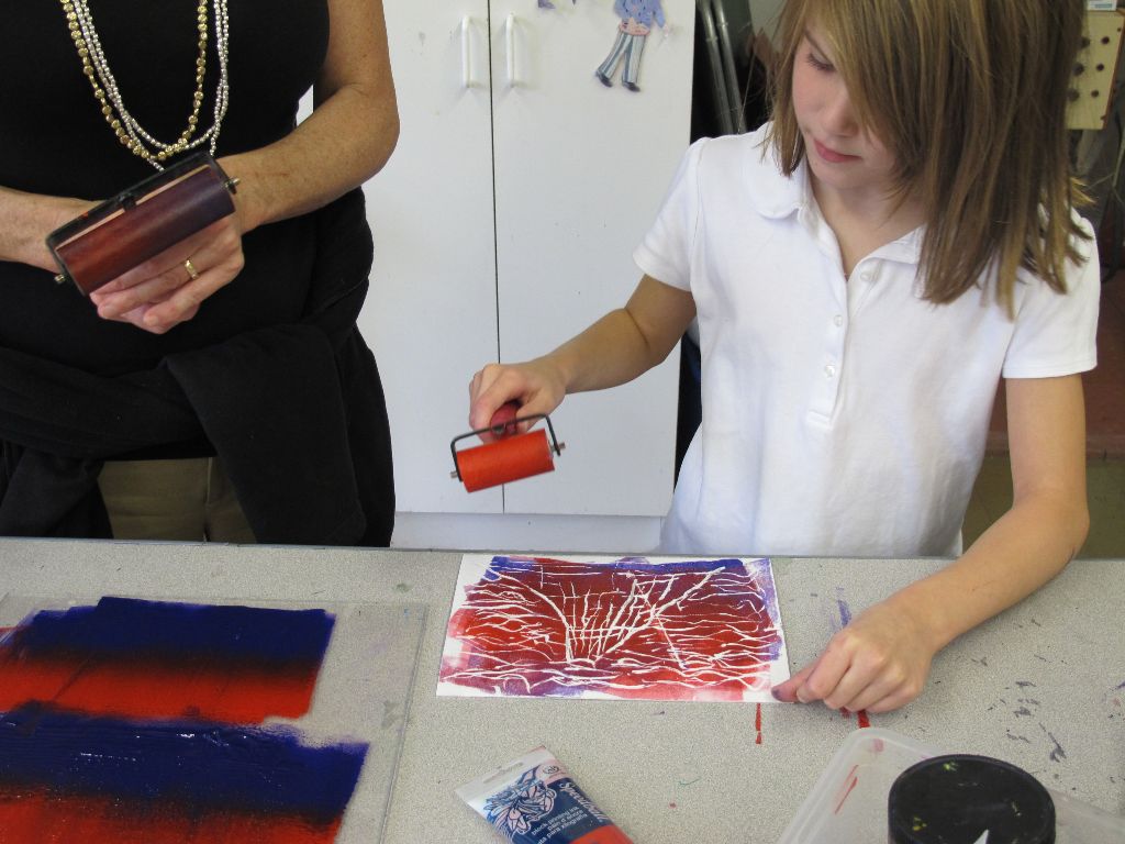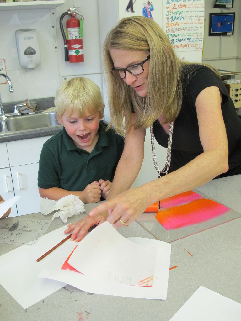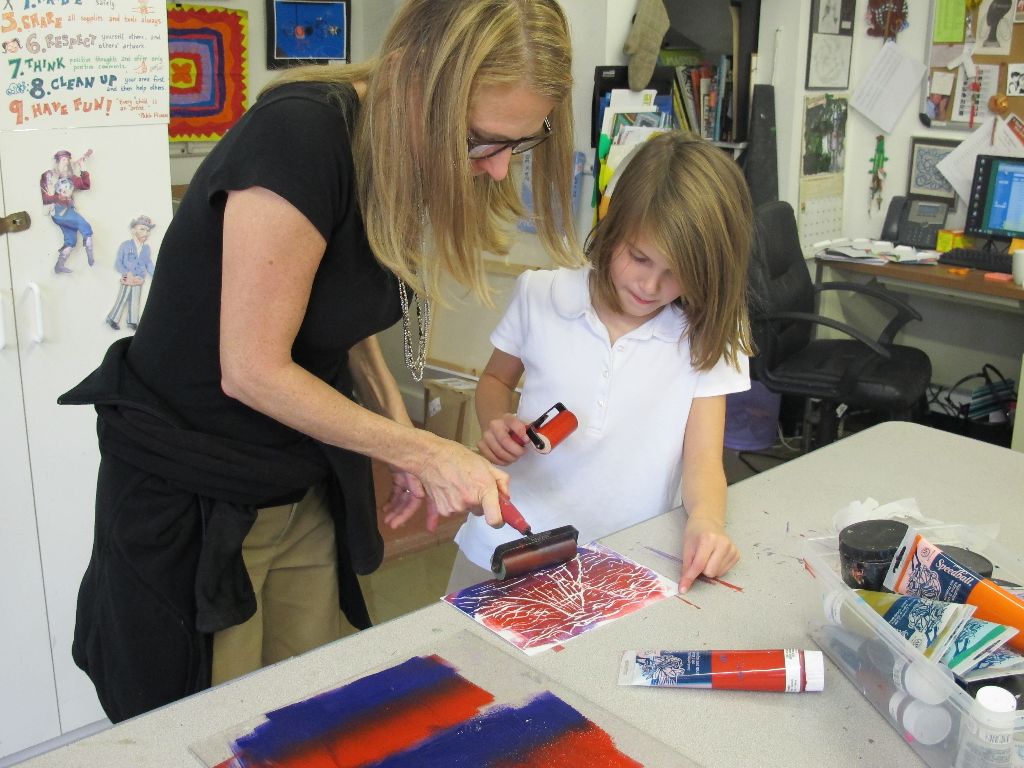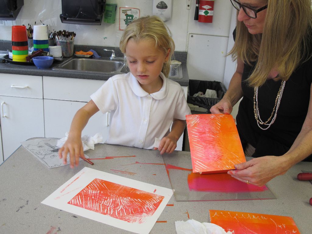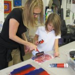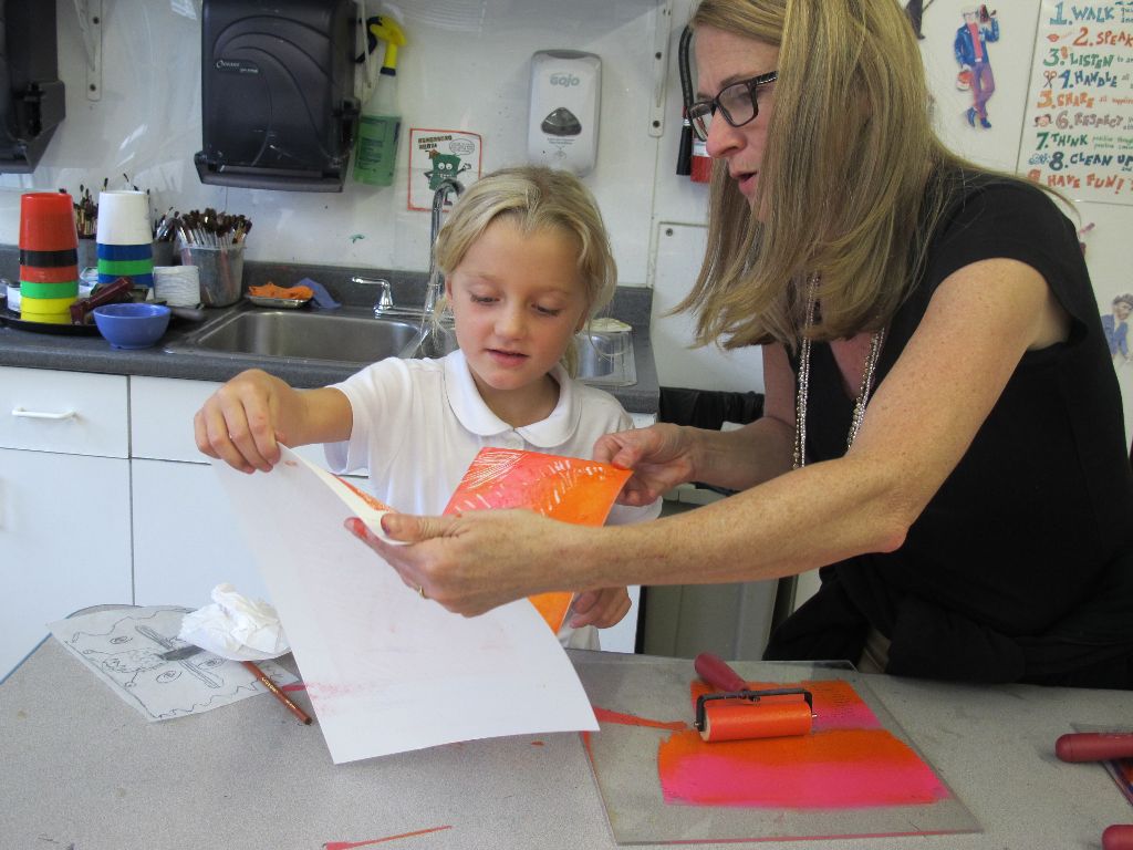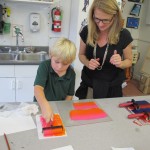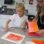 The first grade class studied Hokusai’s Ukiyo-e wood block printing methods and then designed and carved their own beautiful prints using foam board.