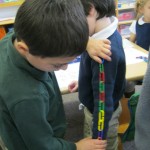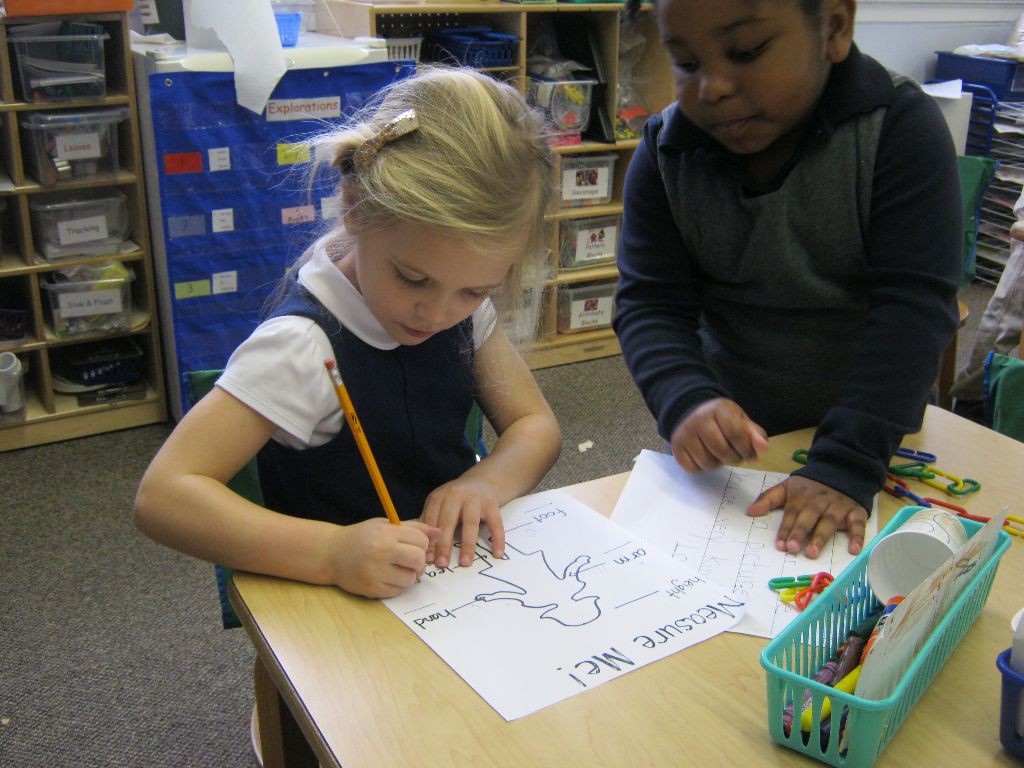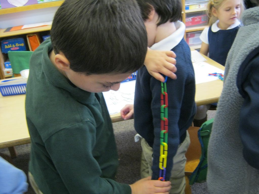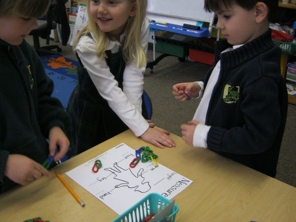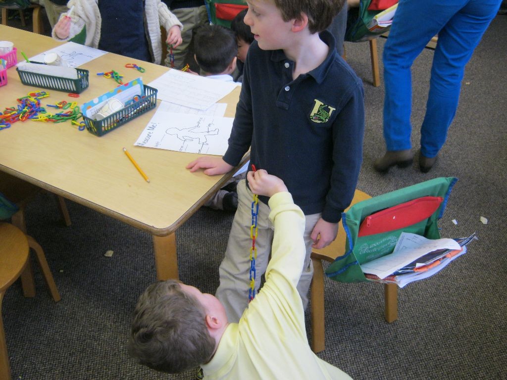 Posted by Faith BarbutoKindergarteners have been learning to measure using nonstandard units of measure such as plastic links and tiles. We have measured objects, pictures and even ourselves! Last week, we got the chance to teach our new measuring skills to the PreK-4 kids! Each kindergarten student was given a PreK-4 buddy to measure and help record data. Students measured their partners’ hands, arms, legs and height with plastic links and assisted them in writing the results.
