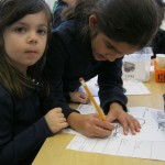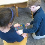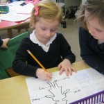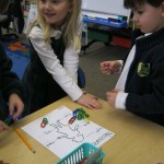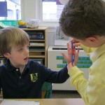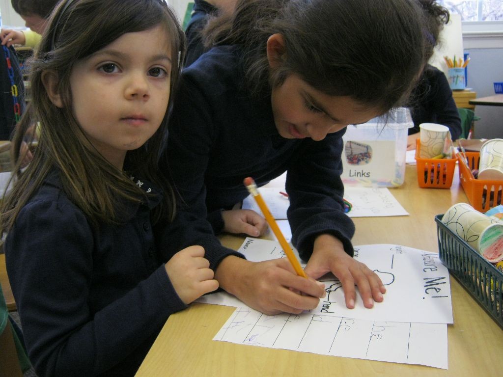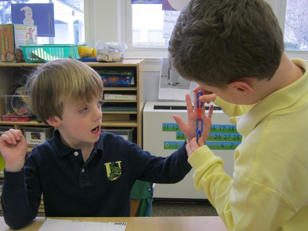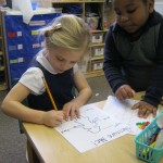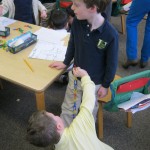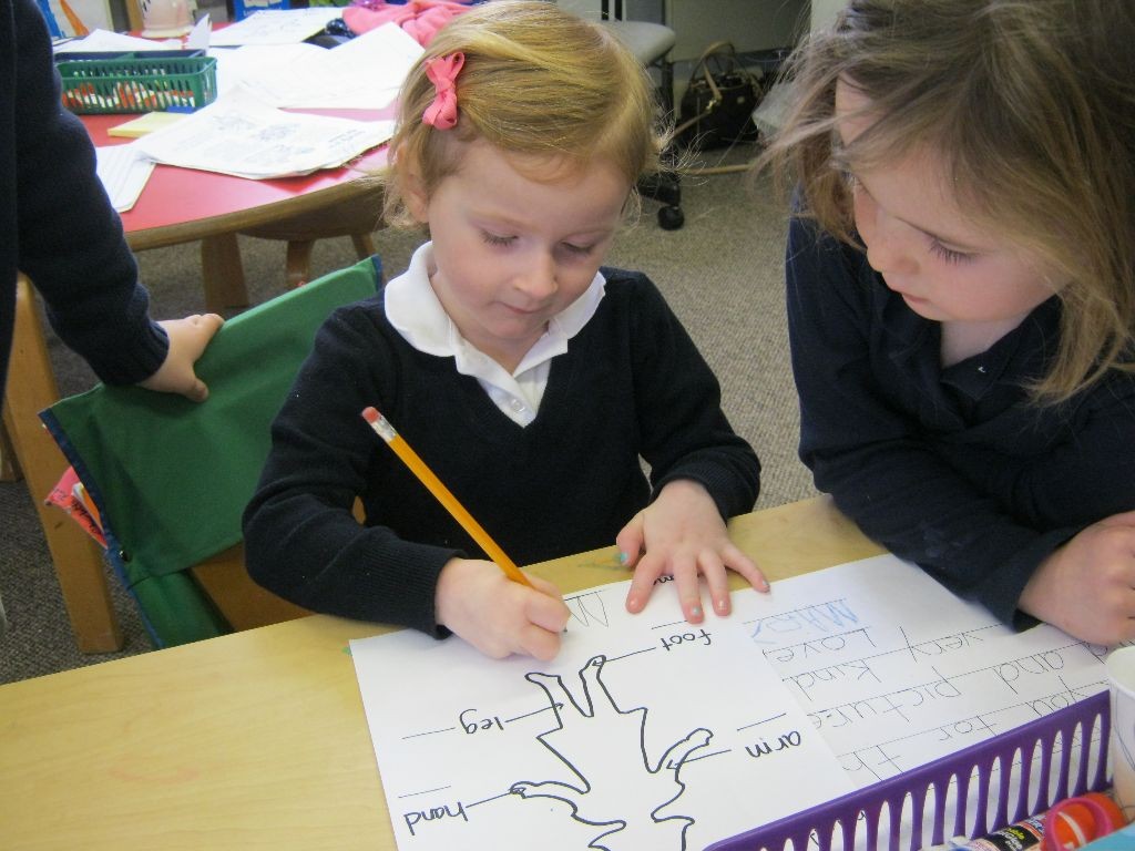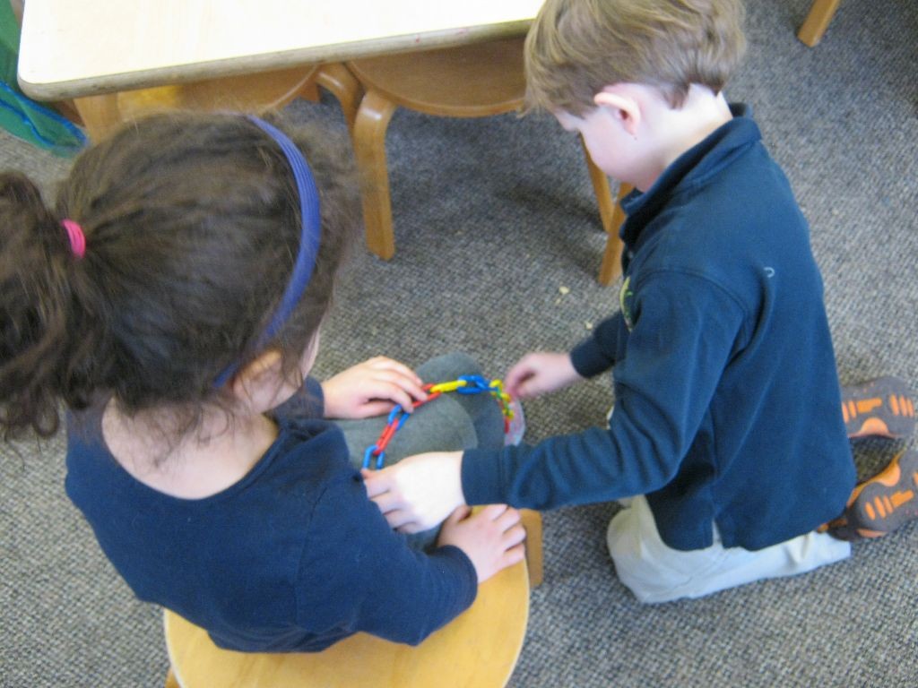 Posted by Faith BarbutoKindergarteners have been learning to measure using nonstandard units of measure such as plastic links and tiles. We have measured objects, pictures and even ourselves! Last week, we got the chance to teach our new measuring skills to the PreK-4 kids! Each kindergarten student was given a PreK-4 buddy to measure and help record data. Students measured their partners’ hands, arms, legs and height with plastic links and assisted them in writing the results.