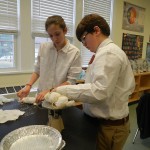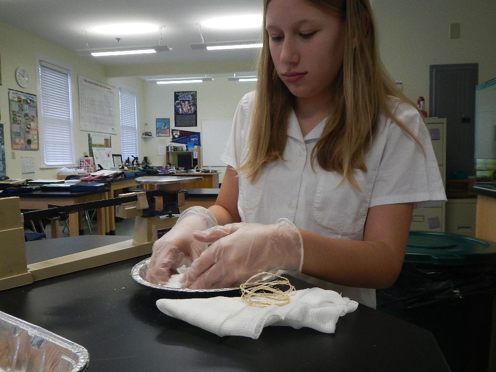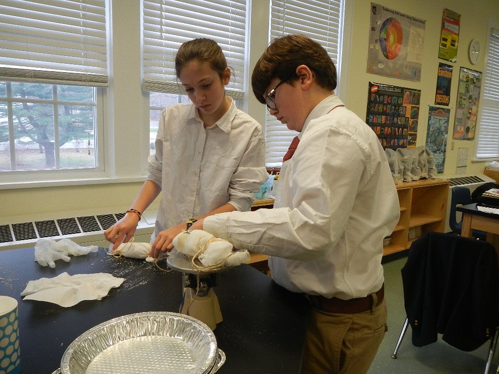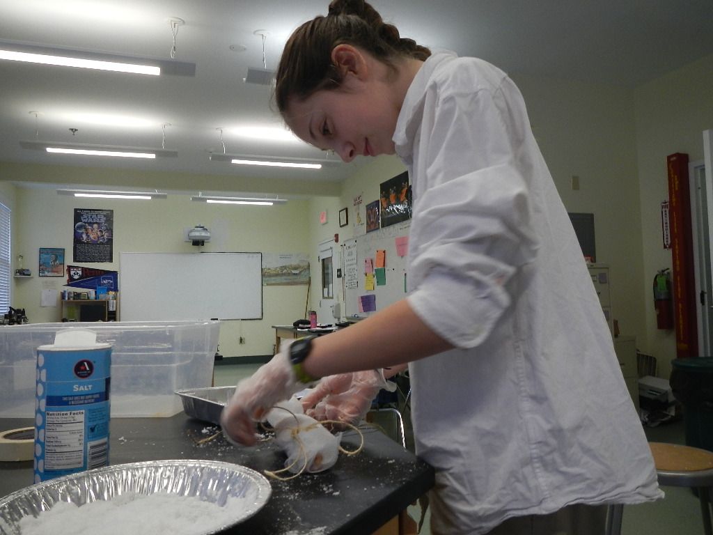 Posted by Craig KnebelDr. Rasti’s sixth grade social studies class worked with me in science to explore the many historical uses of the mineral salt. The class learned that salt was very valuable in ancient times as it was used to preserve many foods in an era without refrigeration. Salt tends to absorb moisture and the class explored ancient mummifying techniques using this property of salt. Students rolled chicken legs in salt, covered them in cheesecloth bandages, and tied off the ends to seal the “chicken leg mummies.” The class will examine how things after progressed after five weeks at the end of winter break. As of week two, the average leg had lost about 18% of its mass. Interestingly, the legs have no rotten smell, but only the smell of cloves and star anise, spice used to cover any potential scents deemed offensive.