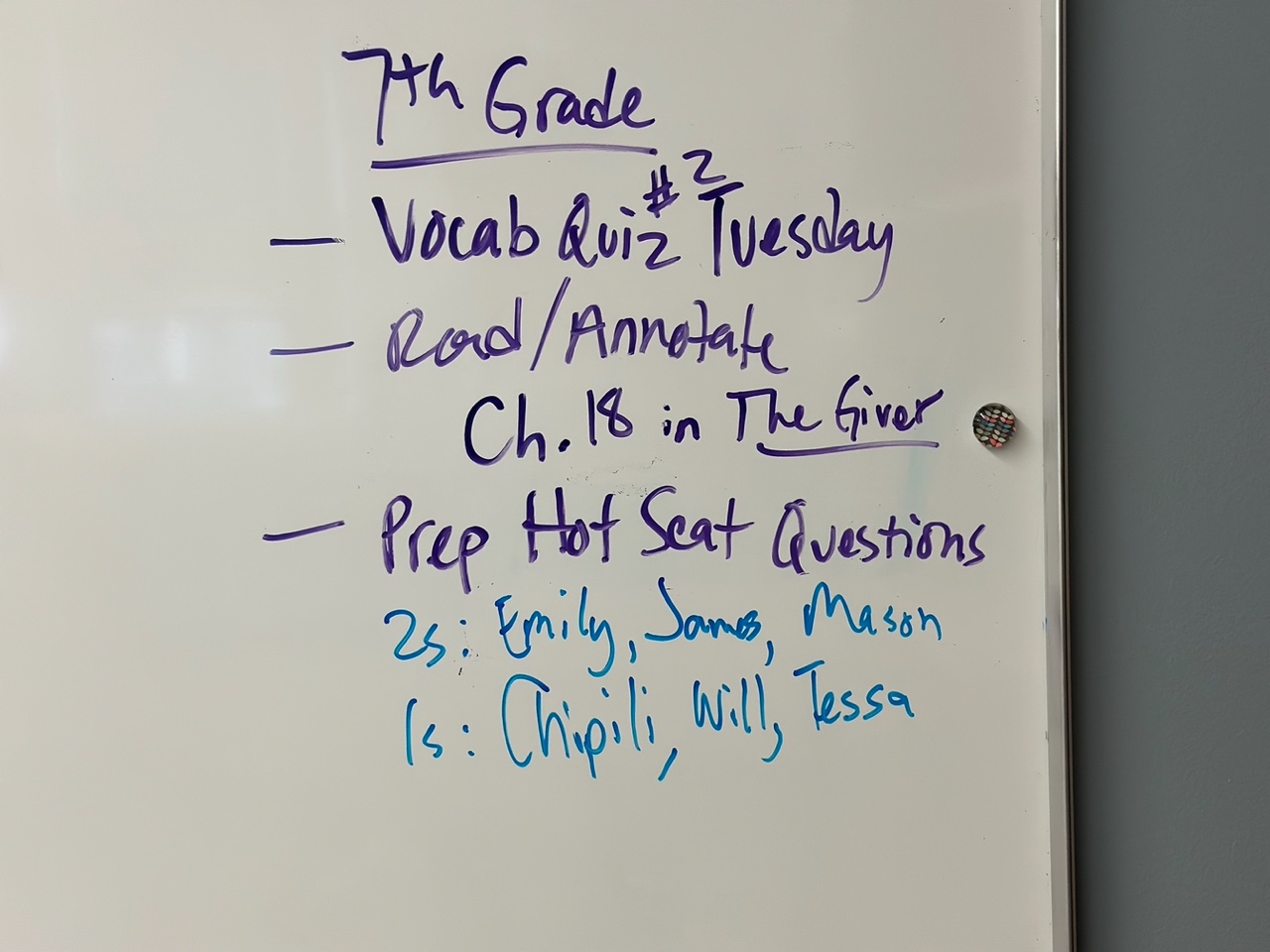 Posted by Eric SnowPart of the goal of the Humanities curriculum is to foster leadership and aid students in engaging in constructive dialogue. One of the ways that we do this in 7th and 8th Grade is to engage in “Hot Seat” discussion days for the text passages we read together. Currently, 7th Grade students are reading The Giver by Lois Lowry and prior to class, three students are responsible for creating discussion questions for their classmates. During class, they then lead conversation in a Socratic seminar-style dialogue. Students experience both sides of the Hot Seat: (1) coming up with robust, open-ended questions that foster discussion, and (2) respectfully offering their ideas to the group for refinement and mutual inquiry. Through this process, students gain listening and speaking skills and experience others building off of their ideas as they collectively build knowledge about our texts. Great job, 7th Graders!