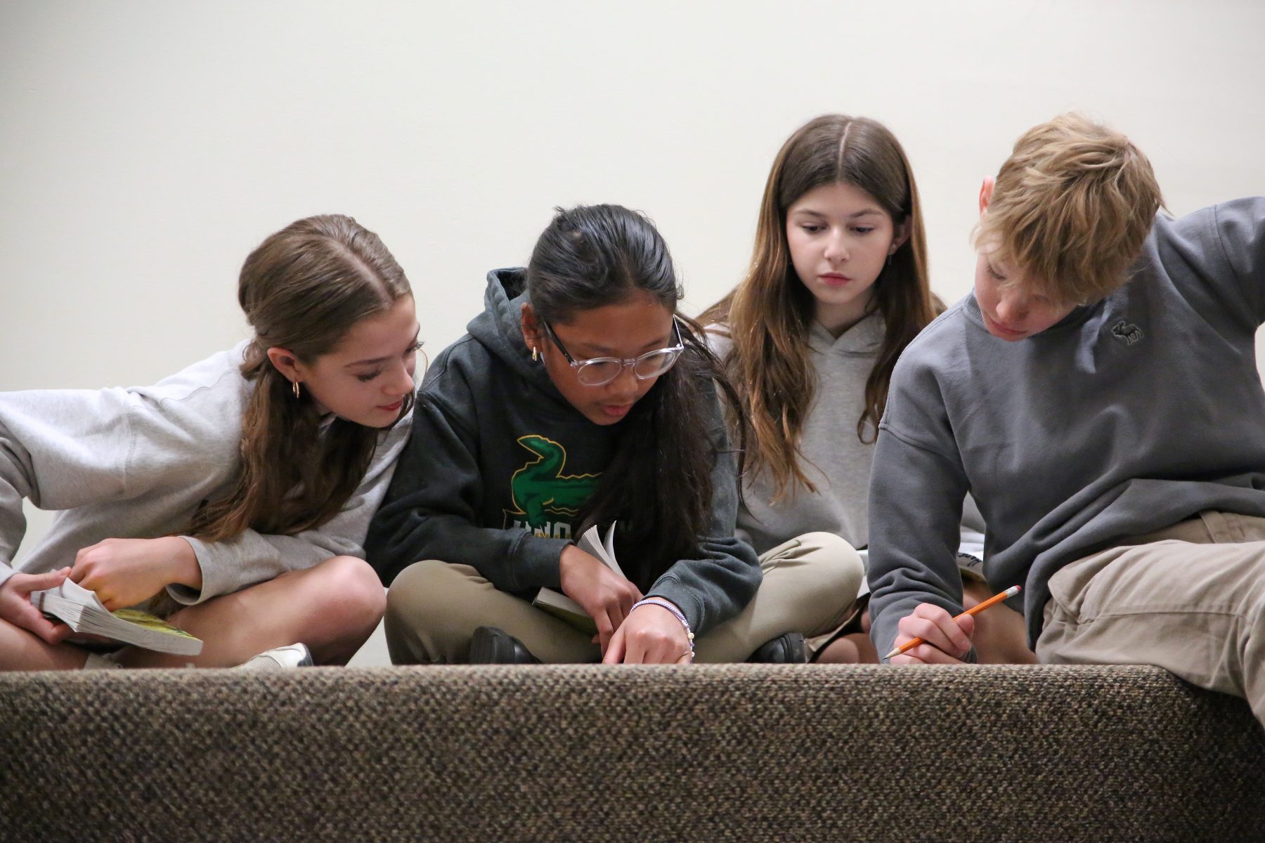 One effective method for improving reading comprehension and understanding is SQ3RâSurvey, Question, Read, Recite, and Reviewâa time-tested approach from the 40s that encourages students to engage deeply with a text. By first surveying a book and formulating questions, students set the stage for a meaningful reading experience. Recitingâthrough summarization, annotation, and discussionâreinforces comprehension, preparing them for the final stage: review. At Unquowa, this process is embedded into the curriculum through engaging activities like no-stakes competitions (like the passage-search competition in these pictures) that encourage students to revisit key passages multiple times, strengthening their connection to the text in a natural, collaborative way.