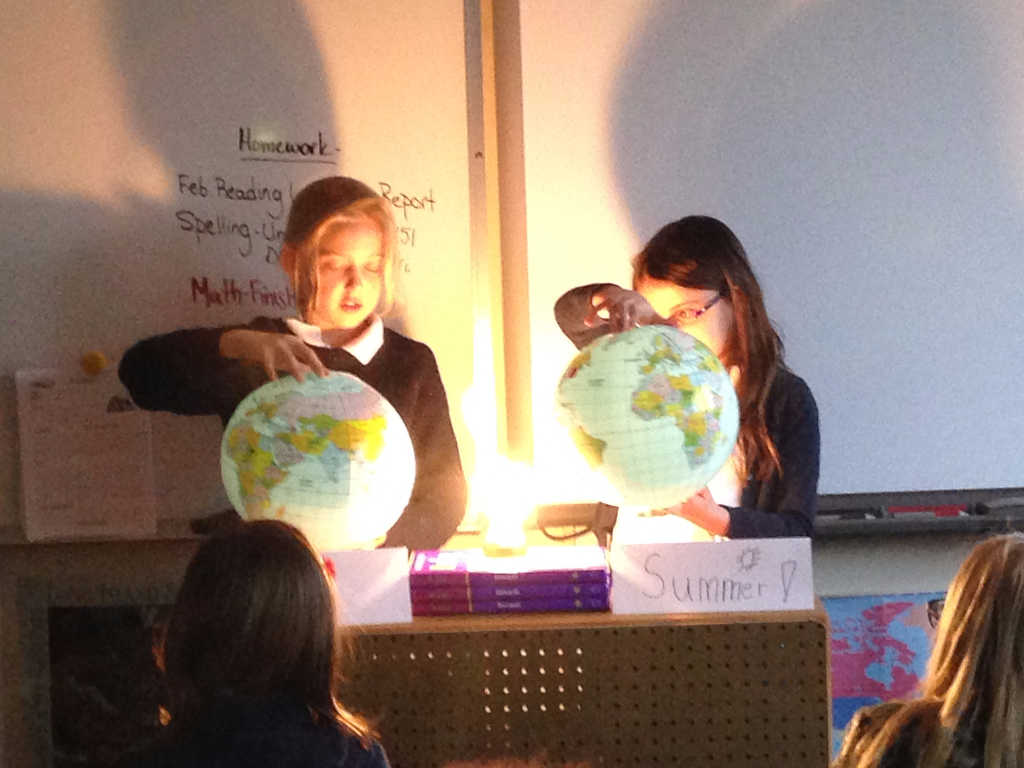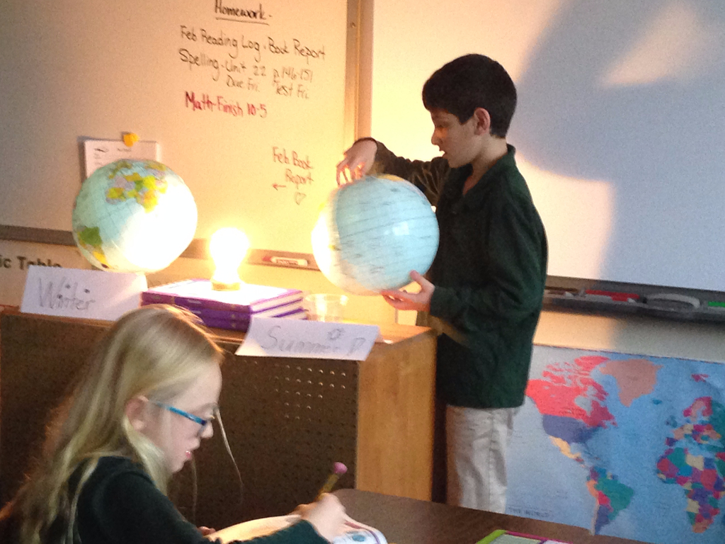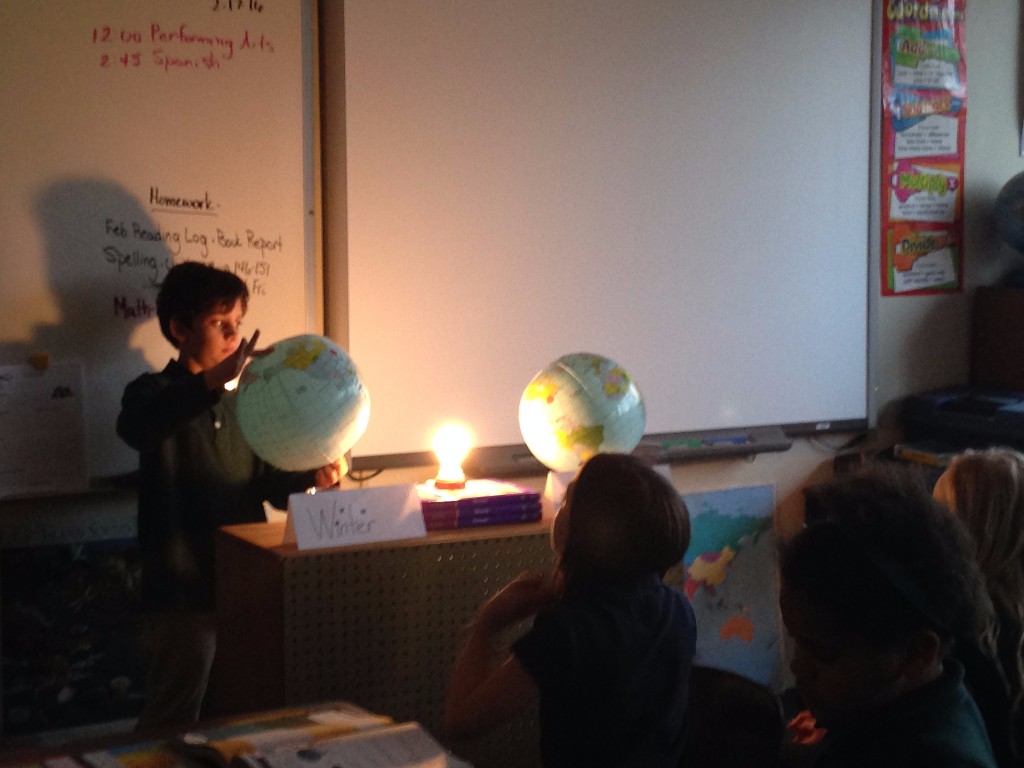 Posted by Carlene GordonWhy do we have seasons? Why do we have day and night? These questions drove a recent investigation in fourth grade. Students were provided with the materials and given a brief introduction of Earth’s axis before hand. Then, with models presented, students were asked to make a hypothesis to answer these questions. Fourth graders discussed, experimented, evaluated and finally made and supported their conclusions, as I stood by for guidance. Students could soon clearly “see” what causes seasons… Due to the Earth rotating on its axis at an angle of 23.5 degrees while it revolves around the sun, at times, we, in the northern hemisphere, are angled towards the sun (summer) and at other times, we are angled away from the sun (winter). In turn, the constant spinning of Earth causes day and night.