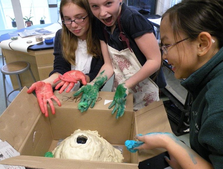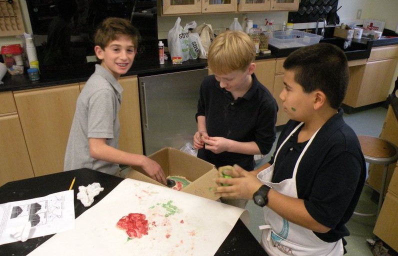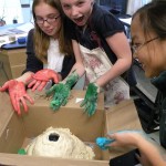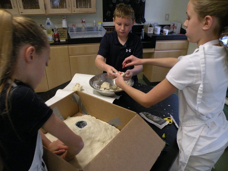 Posted by Craig KnebelThe 6th grade made models of volcanoes to understand the differences between shield, cone, and composite types. To construct the volcanoes we used a very salty dough recipe. Volcano models had to be accurate, so students put lava streams only on shield and composite volcanoes. We blew up the shield with a slow yellow baking soda vinegar substance, the cone with a bubbly froth from hydrogen peroxide and yeast, and the composite with a Mentos fountain.