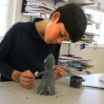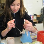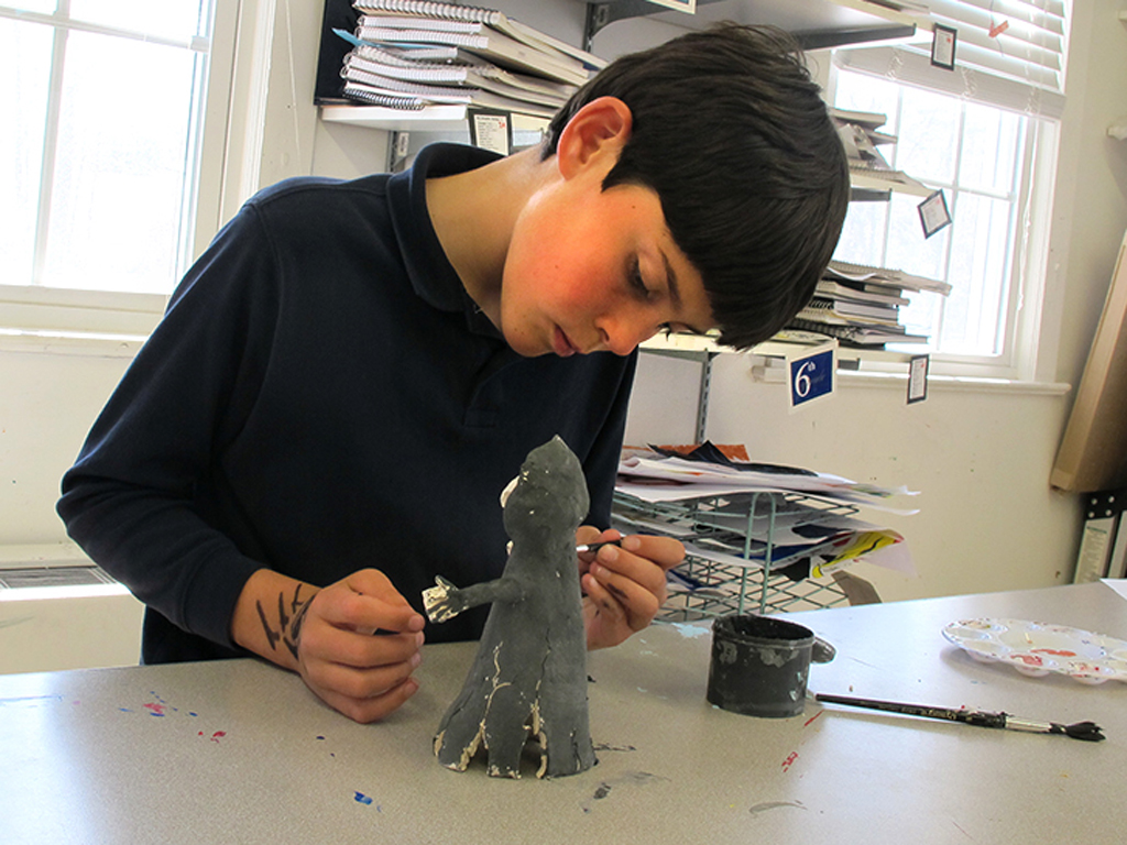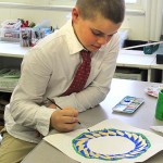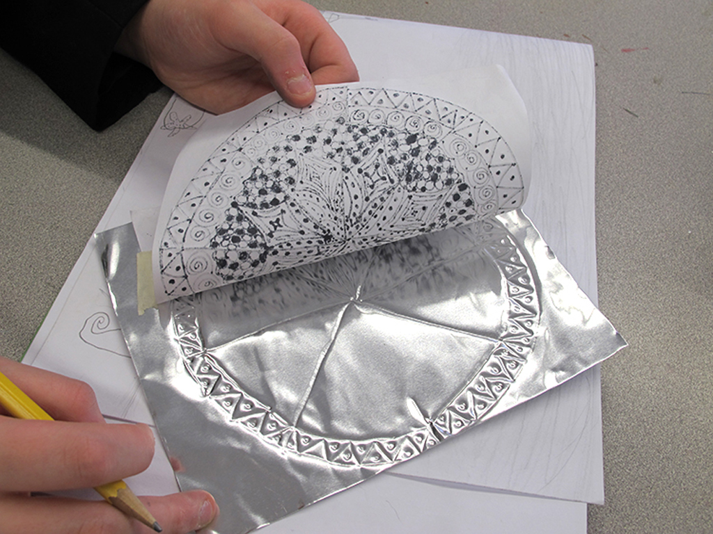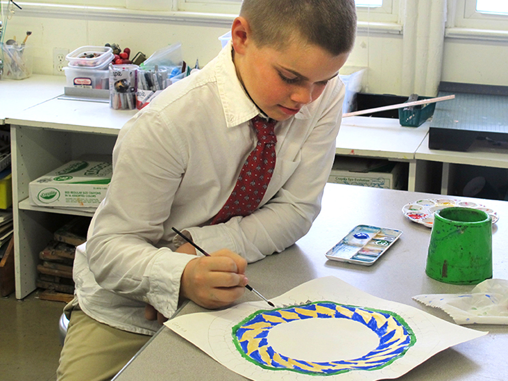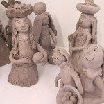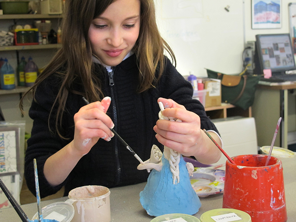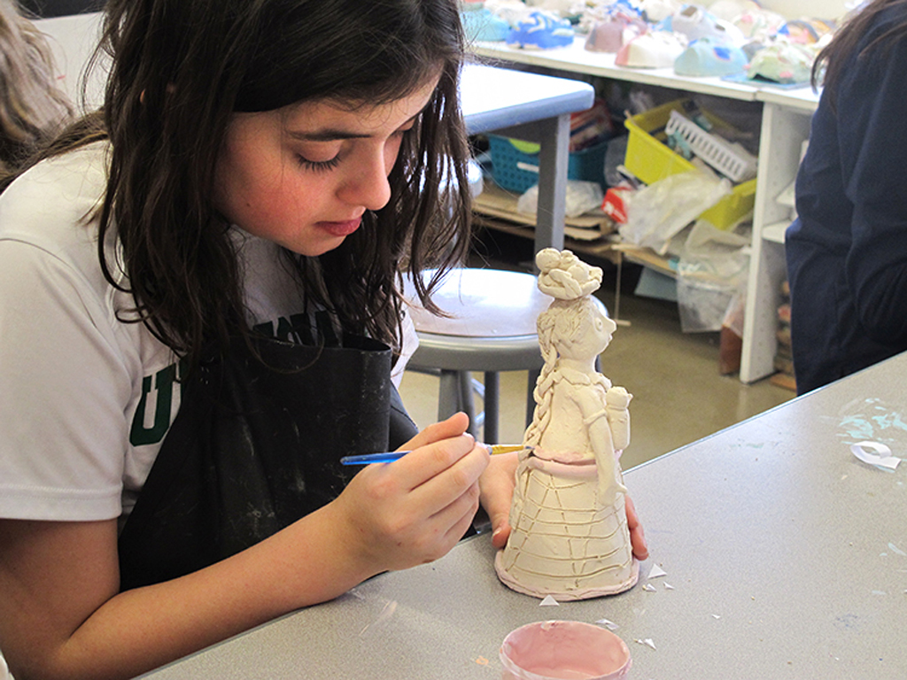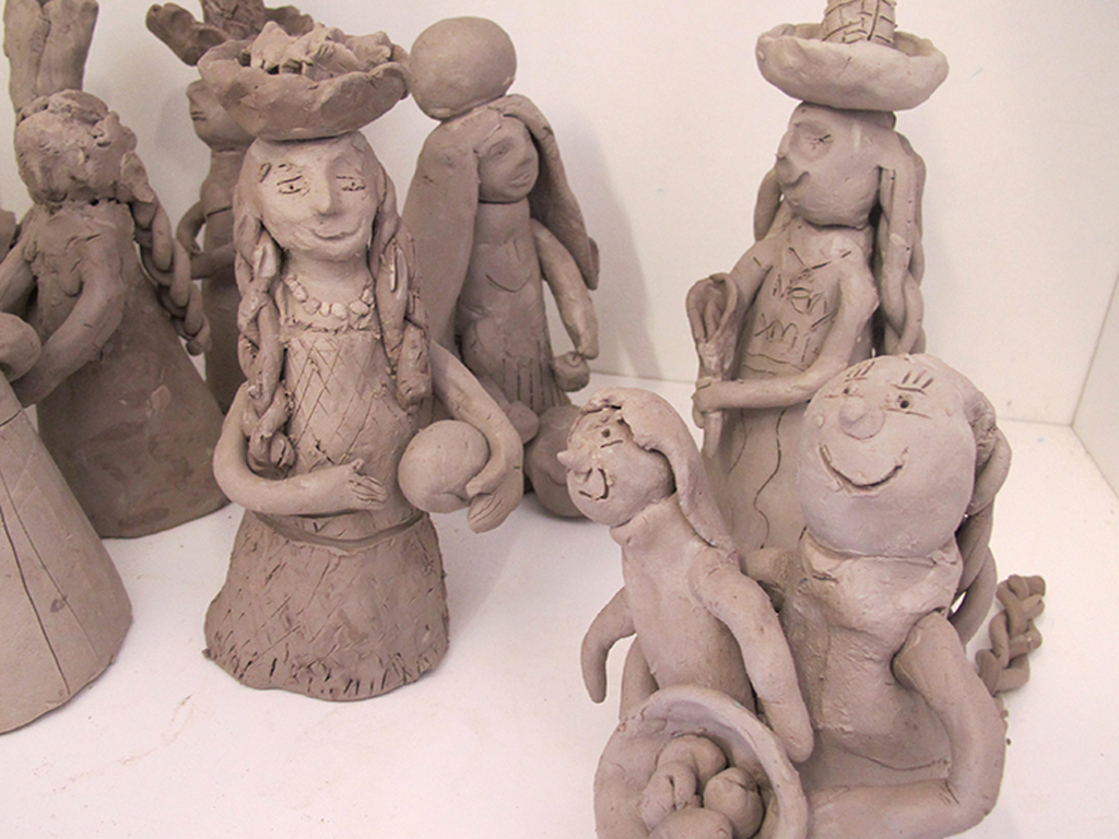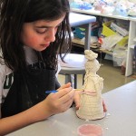 Posted by Krissy PondenThe fifth grade has been learning about the folk art of Oaxaca, Mexico, a region known for its rich culture and vibrantly colorful crafts. We created radial designs in metal tooling foil in the style of the intricate tin mirrors that are famous in the area; the students then painted beautiful frames to complement their designs. We also studied the work of Josefina Aguilar, an artisan who creates detailed clay figures called market women. Using ceramic techniques similar to Josefina’s, the students sculpted their own figures and added intricate elements such braids and baskets. The figures were fired in the kiln and then painted and glazed in bright colors. Be sure to stop by our Mexican folk art exhibit in the student art show in May!
