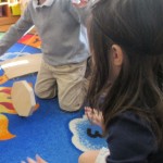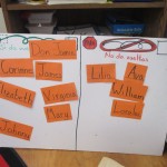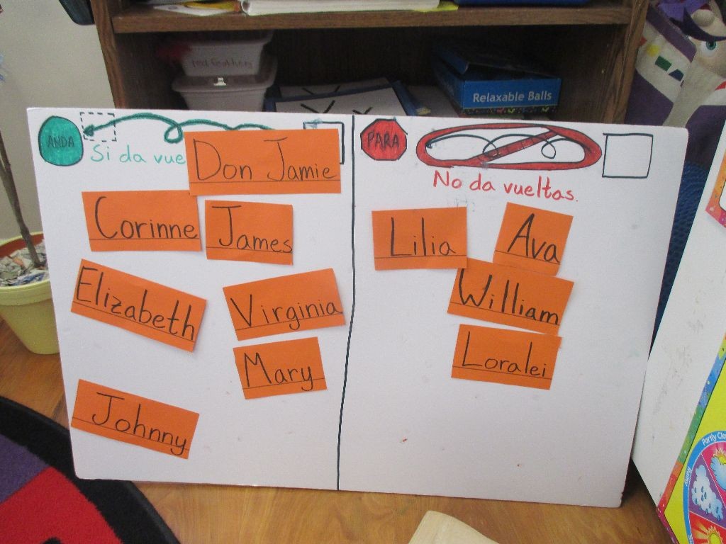 To experiment with wheel shapes, first we charted who thought different shapes would go around (sí da vueltas) or not (no da vueltas). Then we took turns rolling the different shapes and revising our hypotheses!