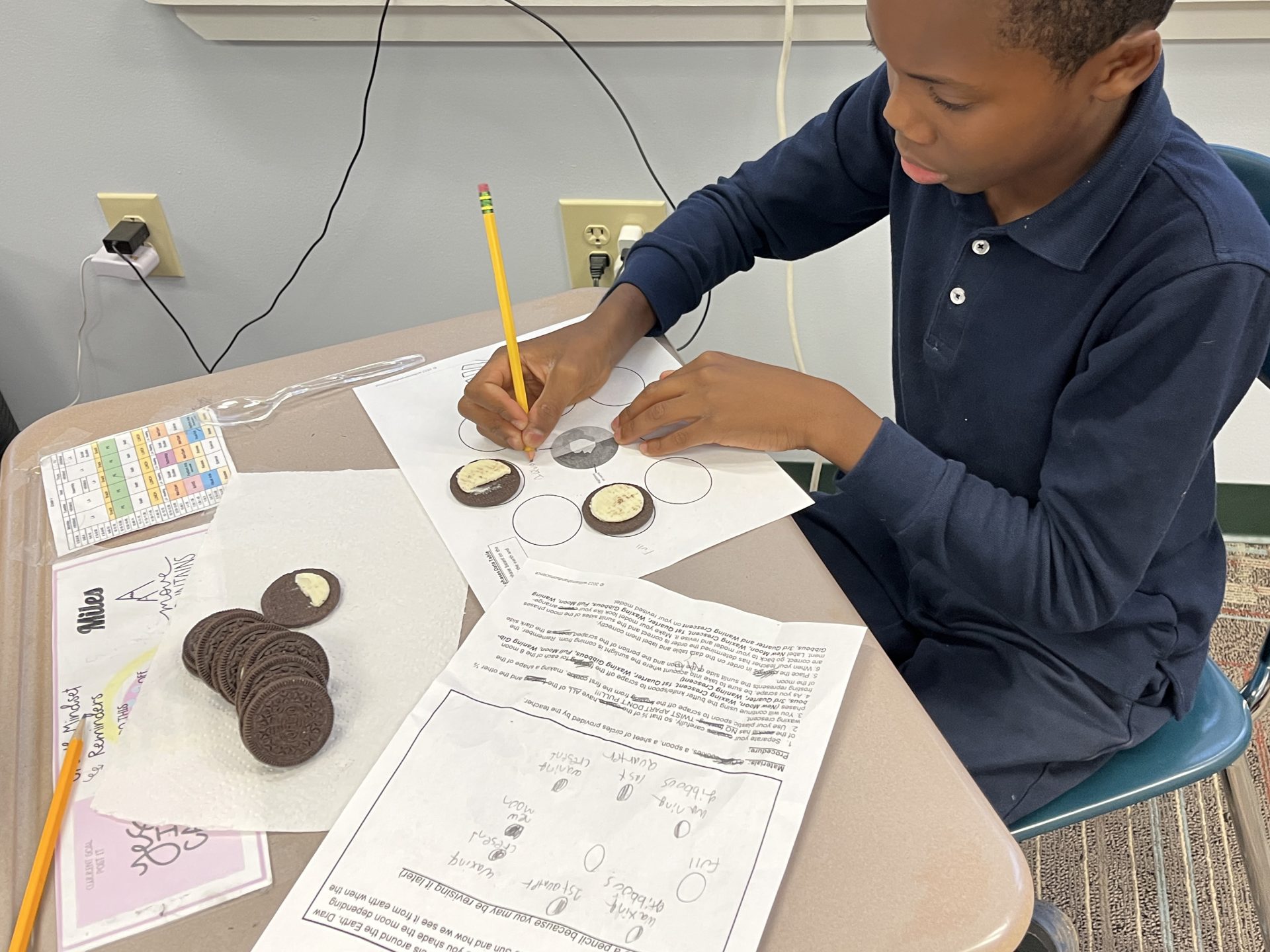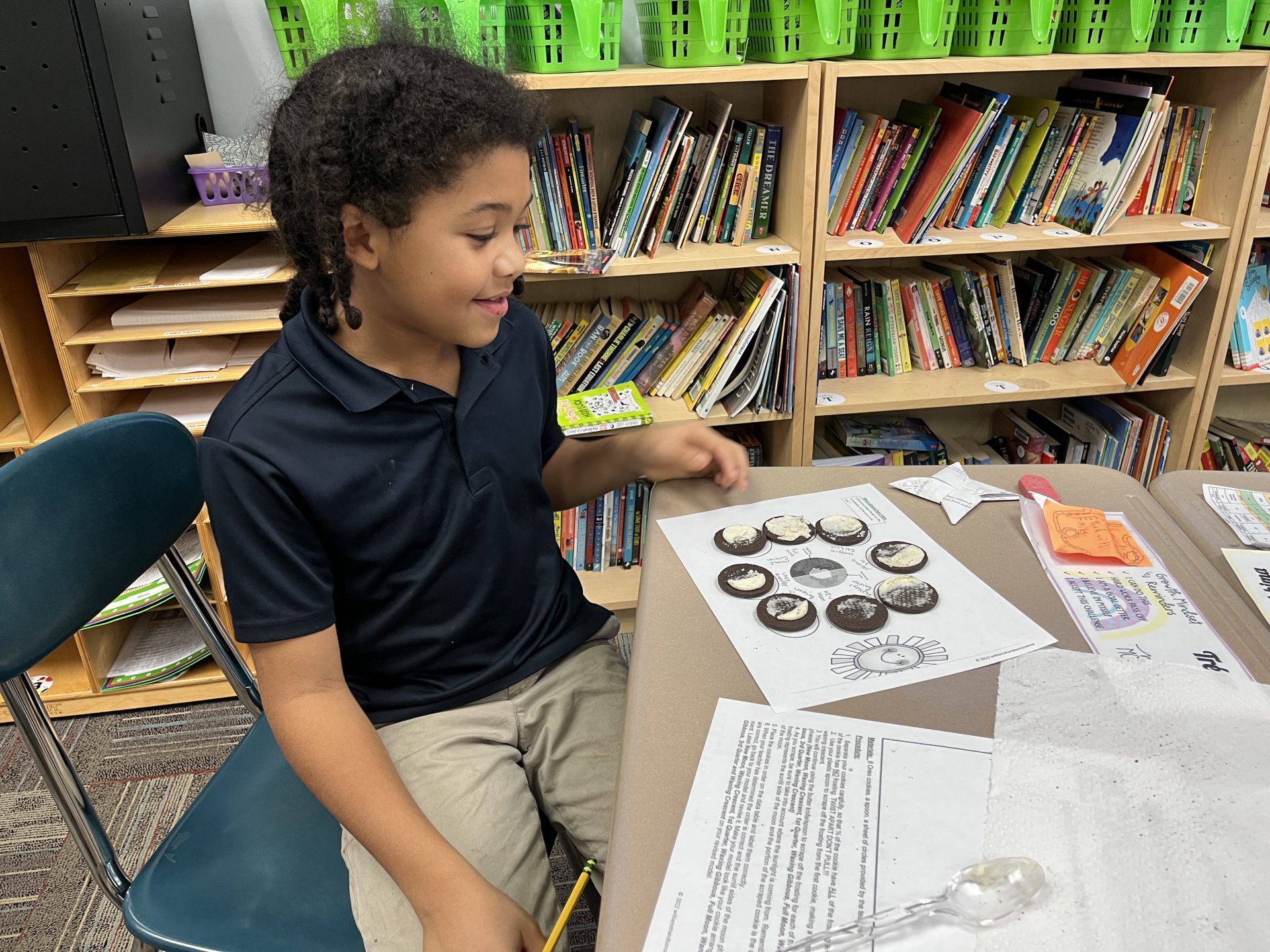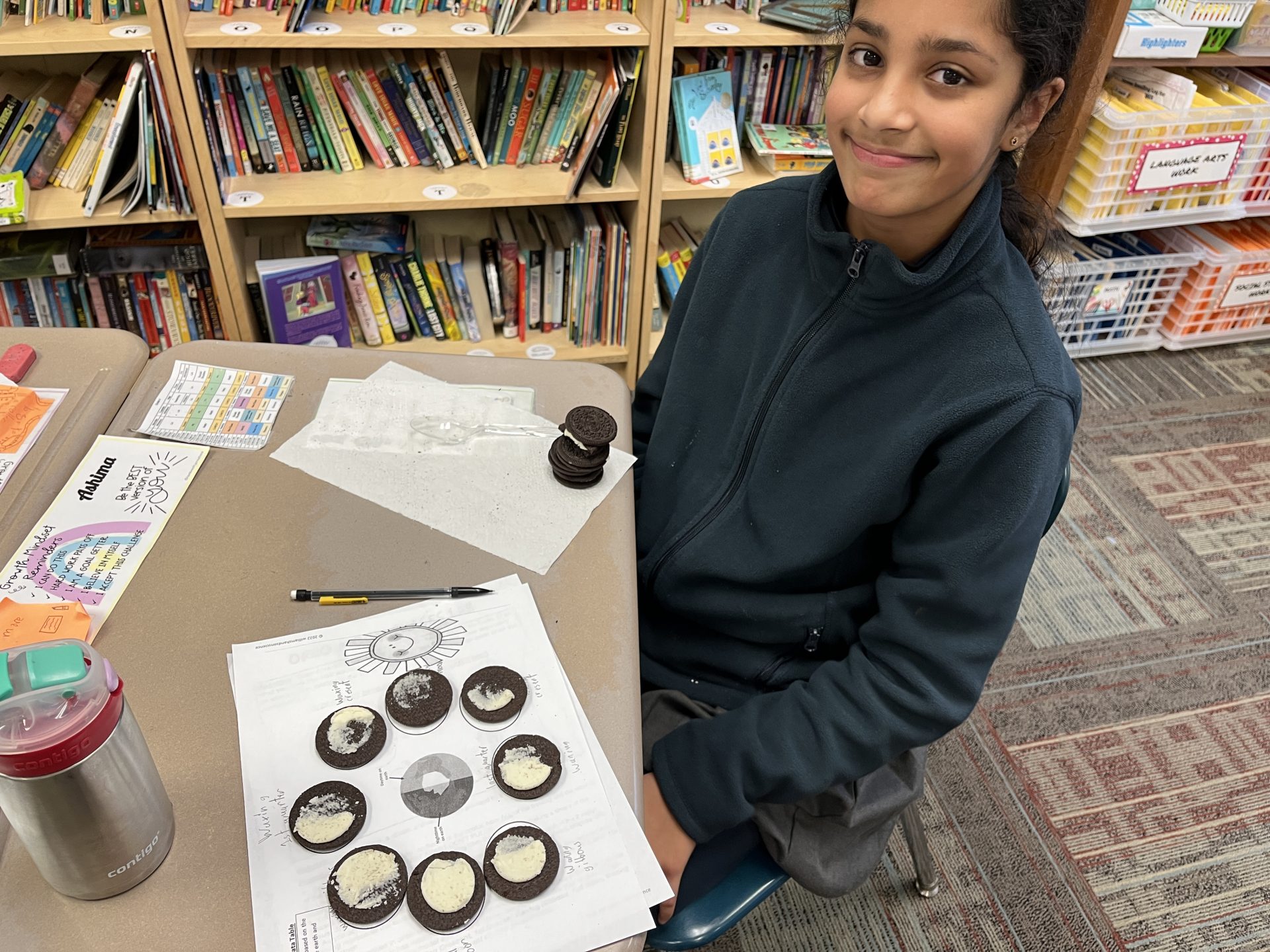 Posted by Karen EngelkeGrade 4 explored the 8 phases of the moon by utilizing Oreo cookies. Students manipulated the frosting in Oreo cookies to visualize the phases of the moon, using the contrast of the frosting and the cookie to represent light and shadows on the surface of the moon as seen from Earth. It was hard work twisting the Oreos open to reveal a fully intact circular piece of white frosting. Even more challenging was not eating them before all 8 phases were complete!