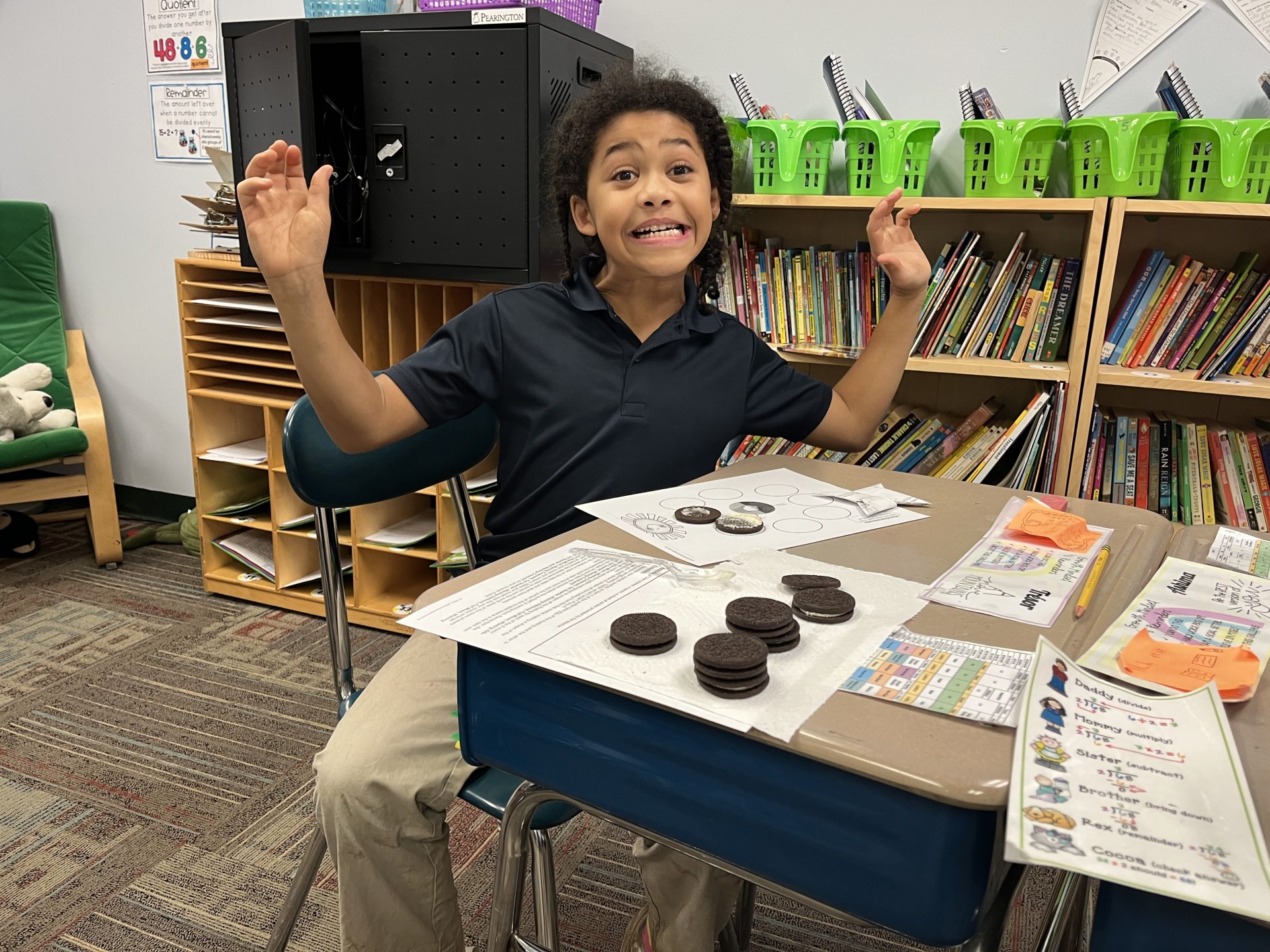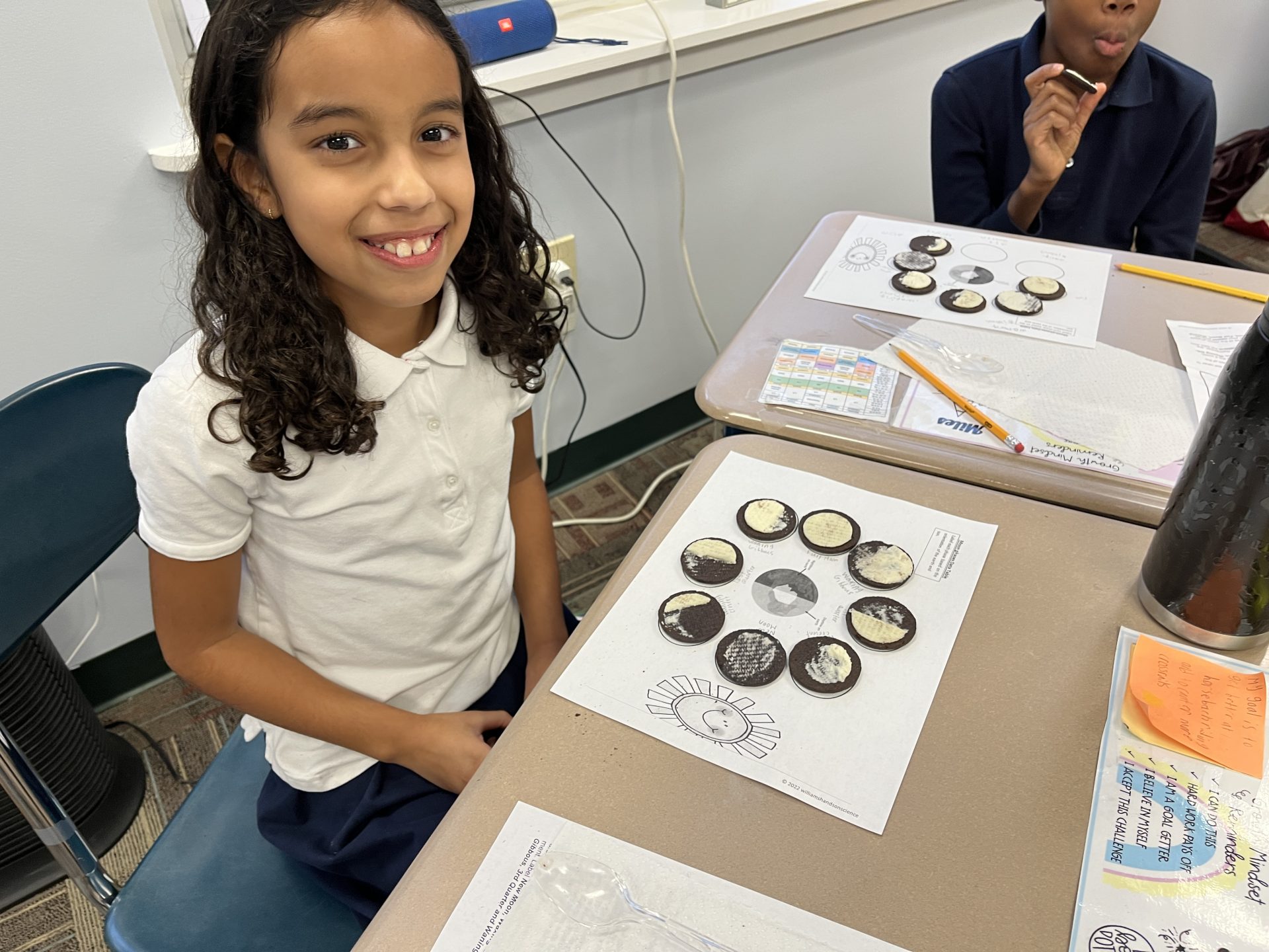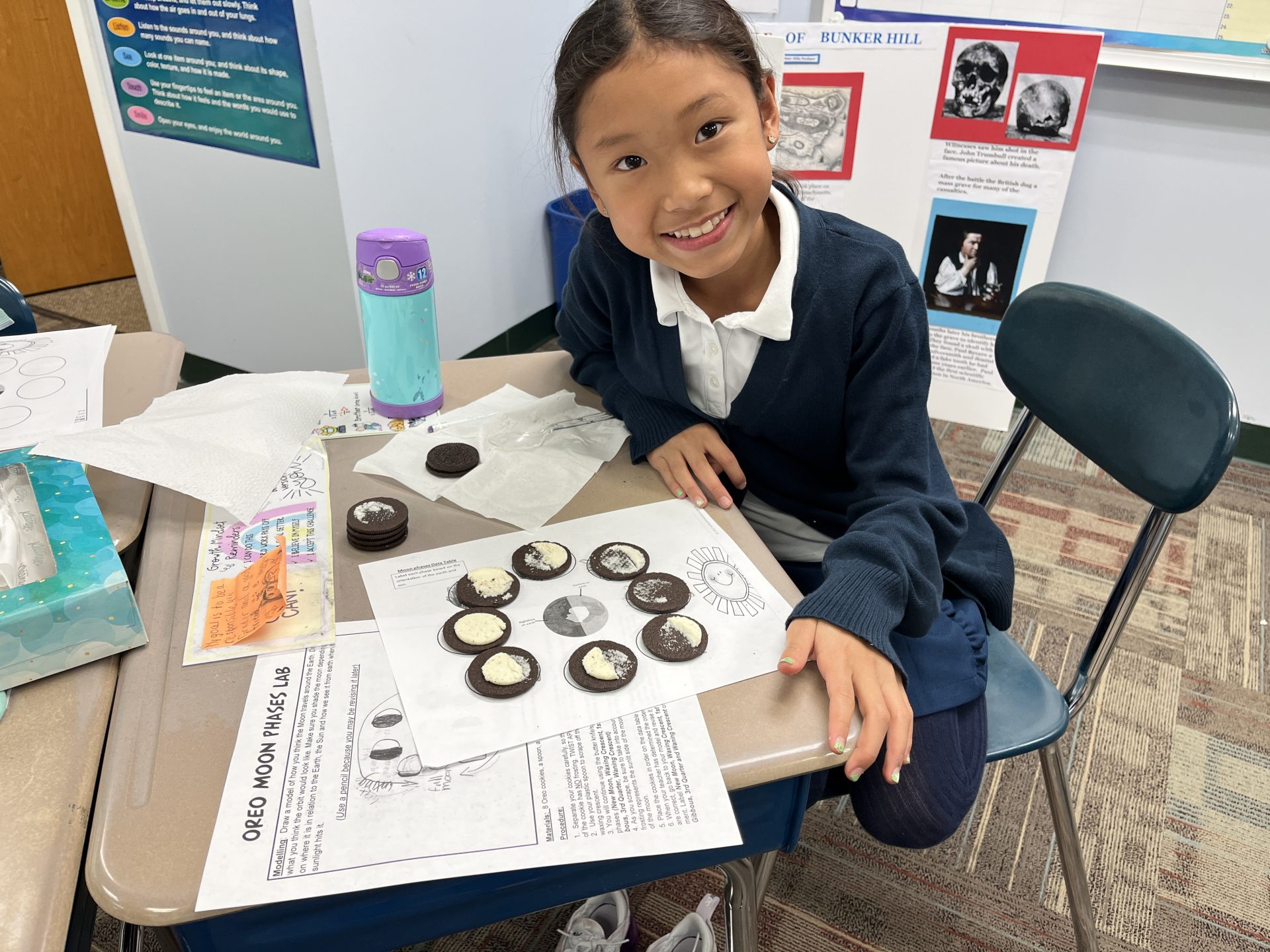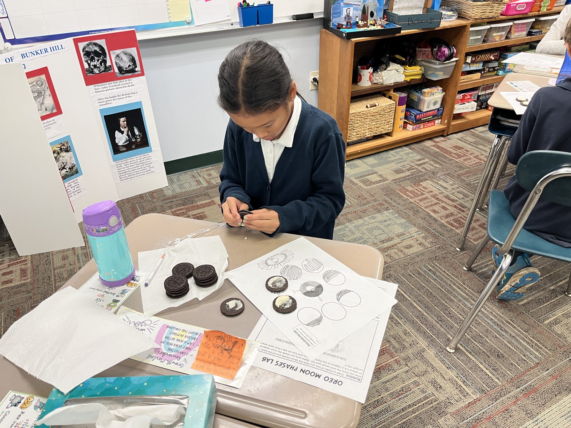 Posted by Karen EngelkeGrade 4 explored the 8 phases of the moon by utilizing Oreo cookies. Students manipulated the frosting in Oreo cookies to visualize the phases of the moon, using the contrast of the frosting and the cookie to represent light and shadows on the surface of the moon as seen from Earth. It was hard work twisting the Oreos open to reveal a fully intact circular piece of white frosting. Even more challenging was not eating them before all 8 phases were complete!