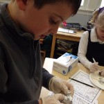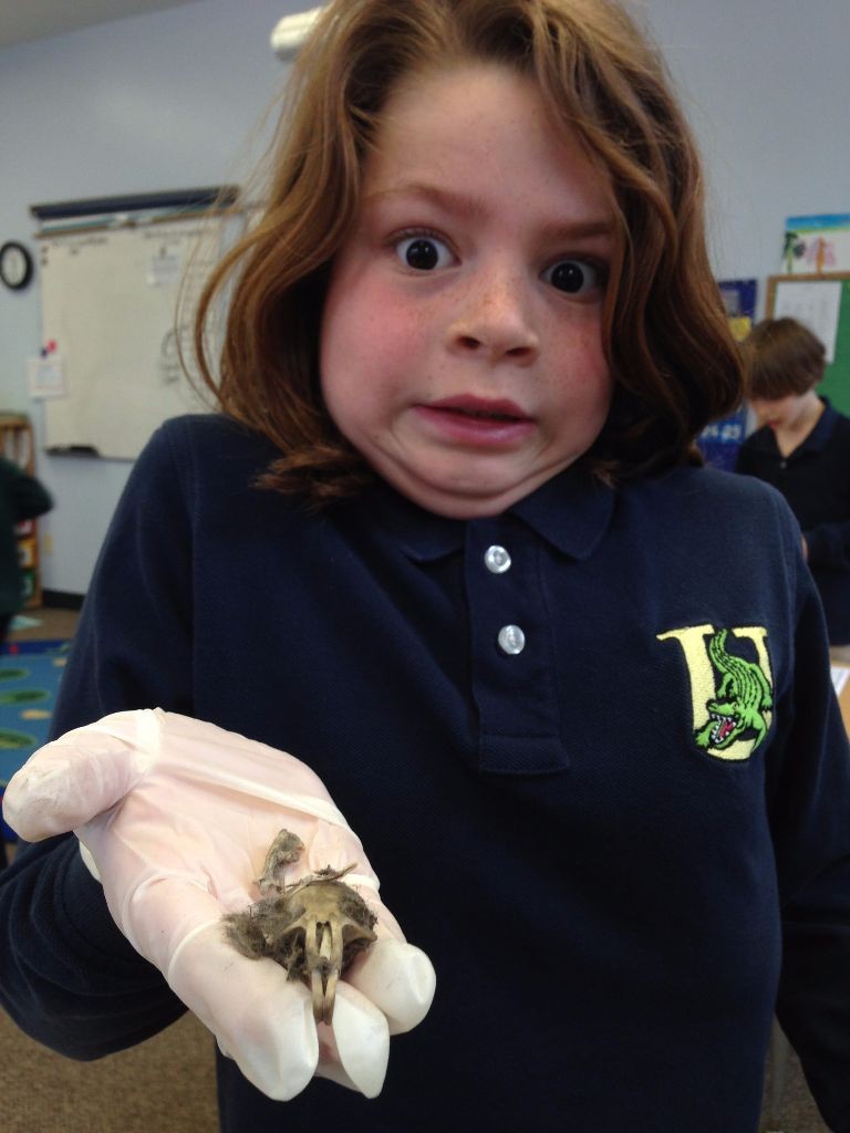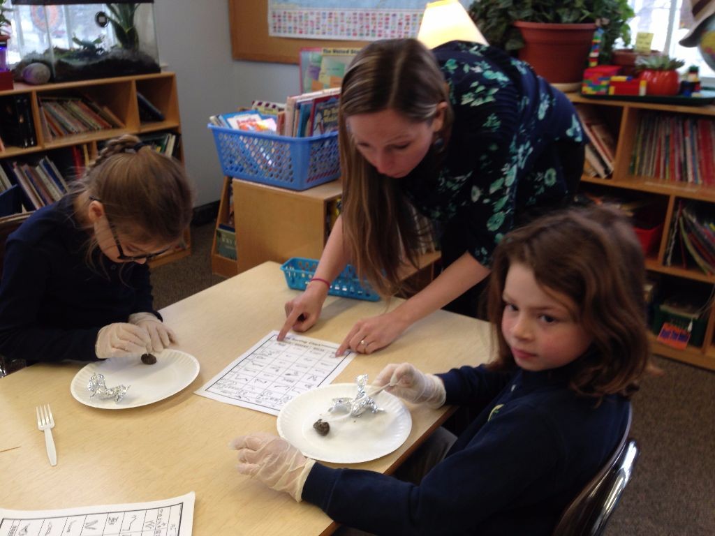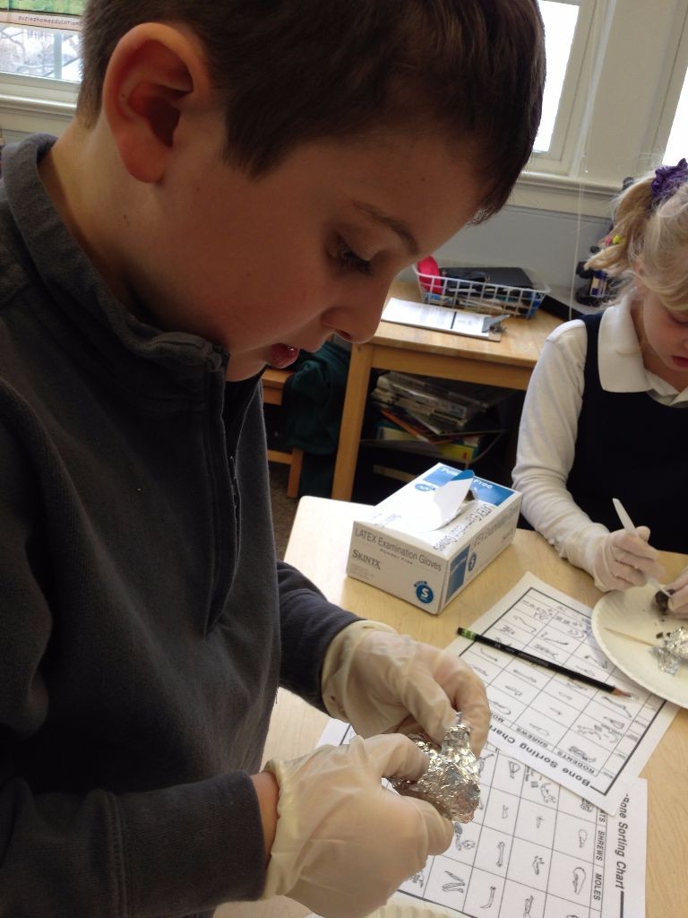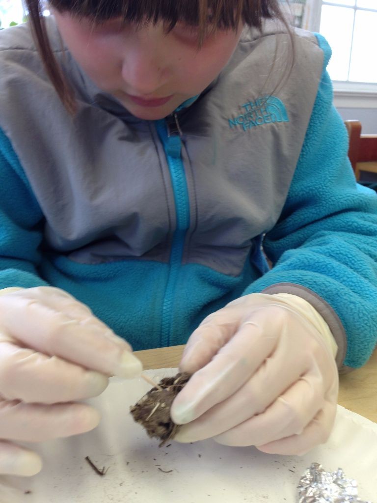 Posted by Cameron Ross-MacCormackAunt Kristin, Mrs. Barbuto’s sister, is a high school science teacher and she came to visit. She brought guides for each child and a real owl pellet for each as well. Children were elated as they eagerly and carefully broke apart each pellet to discover what the owl had been eating. Using forks and toothpicks second graders picked through and found a wide array of bones and textures of fur. We found skulls, teeth, ribs and more!