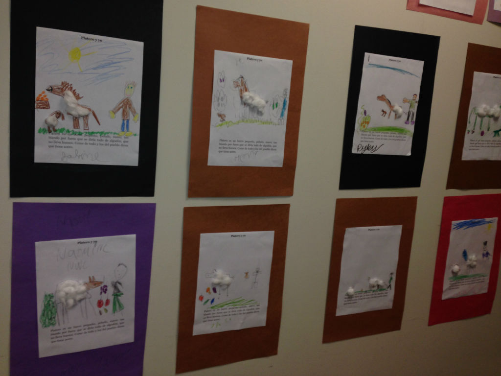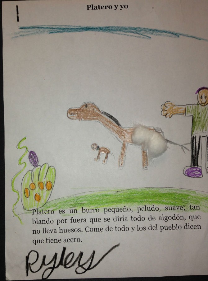 Posted by Isabel TapiaFirst graders learned different kinds of adjectives and how they change in Spanish according to the gender of the person they describe. To help reinforce these concepts we read Platero y Yo by Juan Ramon Jimenez, a famous Spanish writer. Then, they were challenged to describe Platero, who is a sweet donkey and the writerโs best friend. The students loved the story. Finally, they drew Platero using phrases such as: suave como el algodon (soft like the cotton), dulce como la miel (sweet like the honey), etc. Great job first graders!!!