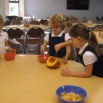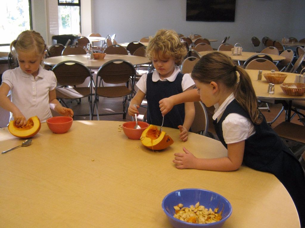 Posted by Ann PalmDuring the Farm unit, with the help of Mrs. Curran and Chef Dave, the PreK-4 children had another opportunity to taste a vegetable that grows on a farm. Chef Dave explained that not all pumpkins are made into Jack-O-Lanterns -some you can eat! The children were surprised to learn you can eat both the seeds and the inside of a pumpkin. After the children seeded the pumpkins, Chef Dave cooked the pumpkins with butter and maple syrup. It made a delicious snack. Thank you Mrs. Curran and Chef Dave!
