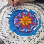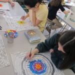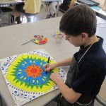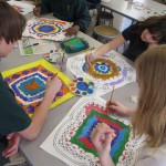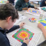 Posted by lauradowlingSeventh grade students are in the process of creating these beautiful mandalas with sharpie marker and tempera paint. The initial design is traced through their paper eight times using the windows as a light source, and then their designs are painted, carrying symmetry throughout. Students are honing their design and fine motor skills in creating these highly detailed paintings and I am thrilled with their progress so far. Great job!