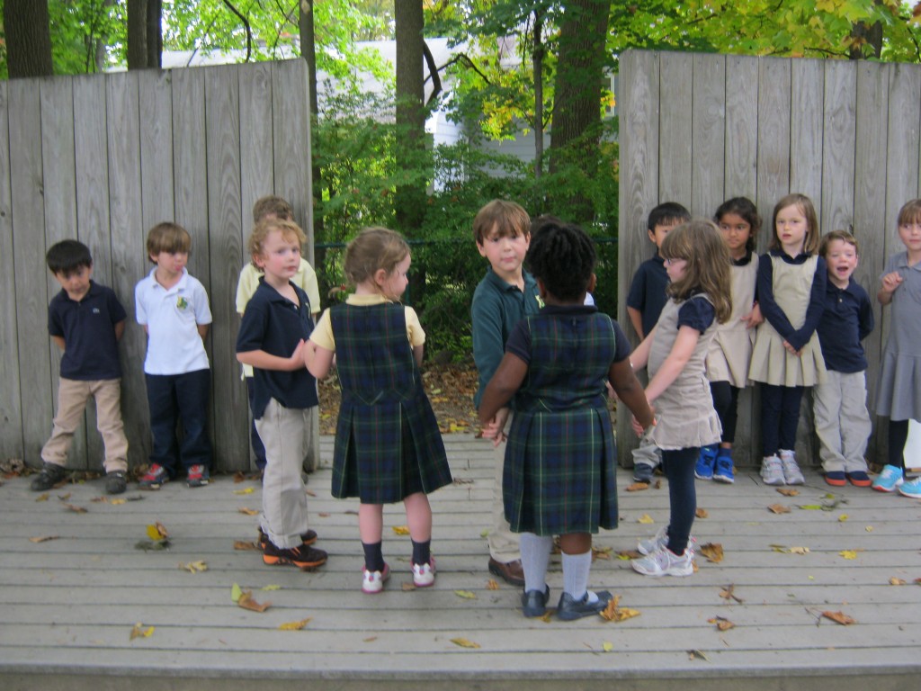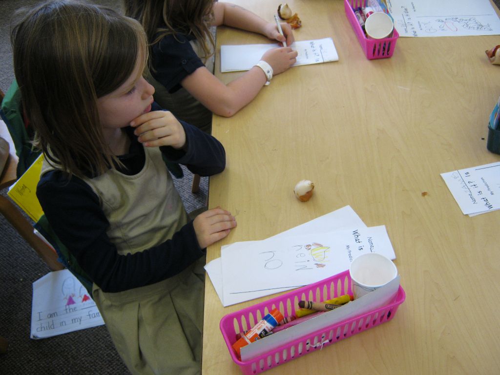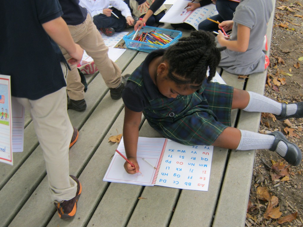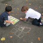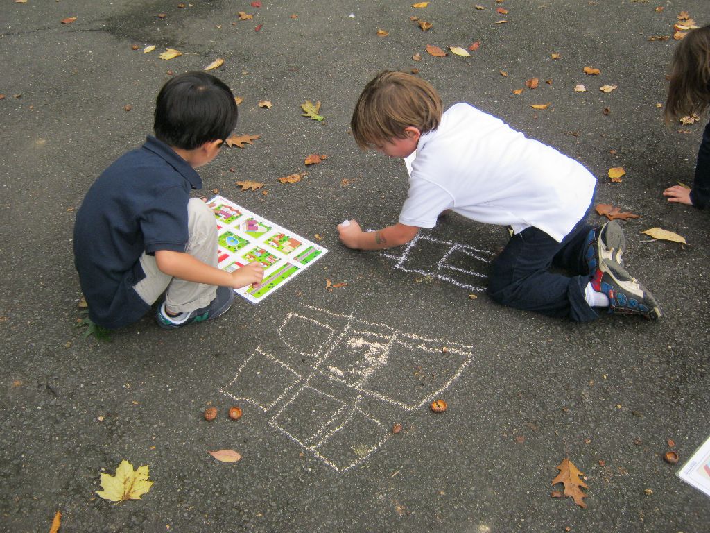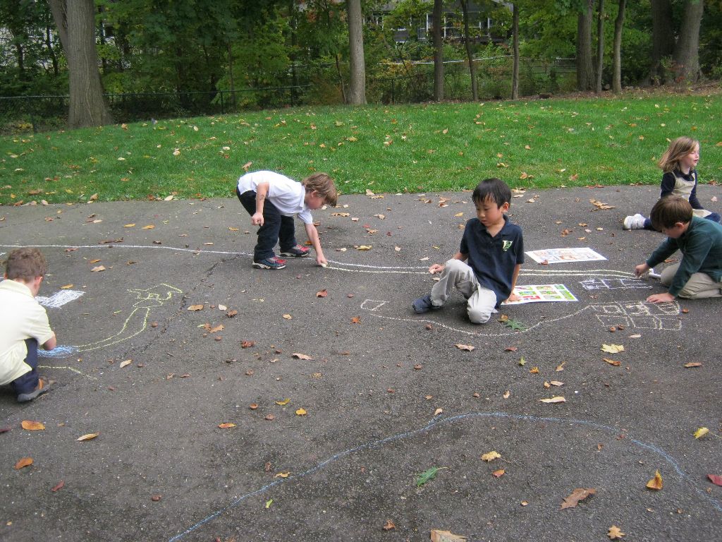 Posted by Faith BarbutoTaking full advantage of the Indian summer temperatures, we set a goal to have as many of our academic lessons outside as possible! First up was a mindful math activity where students were told to put themselves into groups- without talking! Each time the rules of the group changed, like each group must have the same number or nobody could have the same first initial. We counted the members of each group and used that information to make addition sentences like 7+7=14. We stayed out on the stage for writer’s workshop where we used our brand new journals to express our feelings, look for a more indepth blog on this activity coming soon. For social studies we introduced maps of communities and listed the buildings and geographical features that are shown on these maps. Armed with sidewalk chalk we went back outside to create our own community map on the black top. Students enthusiastically added houses, stores, roads and even ponds to create a neighborhood! As part of our study of living and nonliving things, our science investigation focused on bulbs. Each child was given a tulip bulb and asked to predict what it was and if it was alive. After many thoughtful predictions (like garlic) and a heated debate on whether these objects were alive, I finally announced the bulbs’ true identity and explained that they are dormant, not measurably living but waiting for the right circumstances! The last outdoor activity of the day was the kindergarten tradition of planting tulip bulbs along the front walkway. Look out for these heralds of spring to pop up later this year!