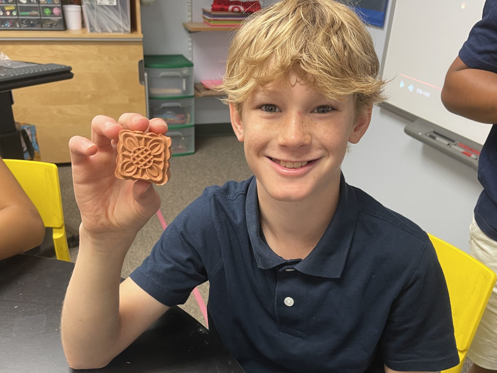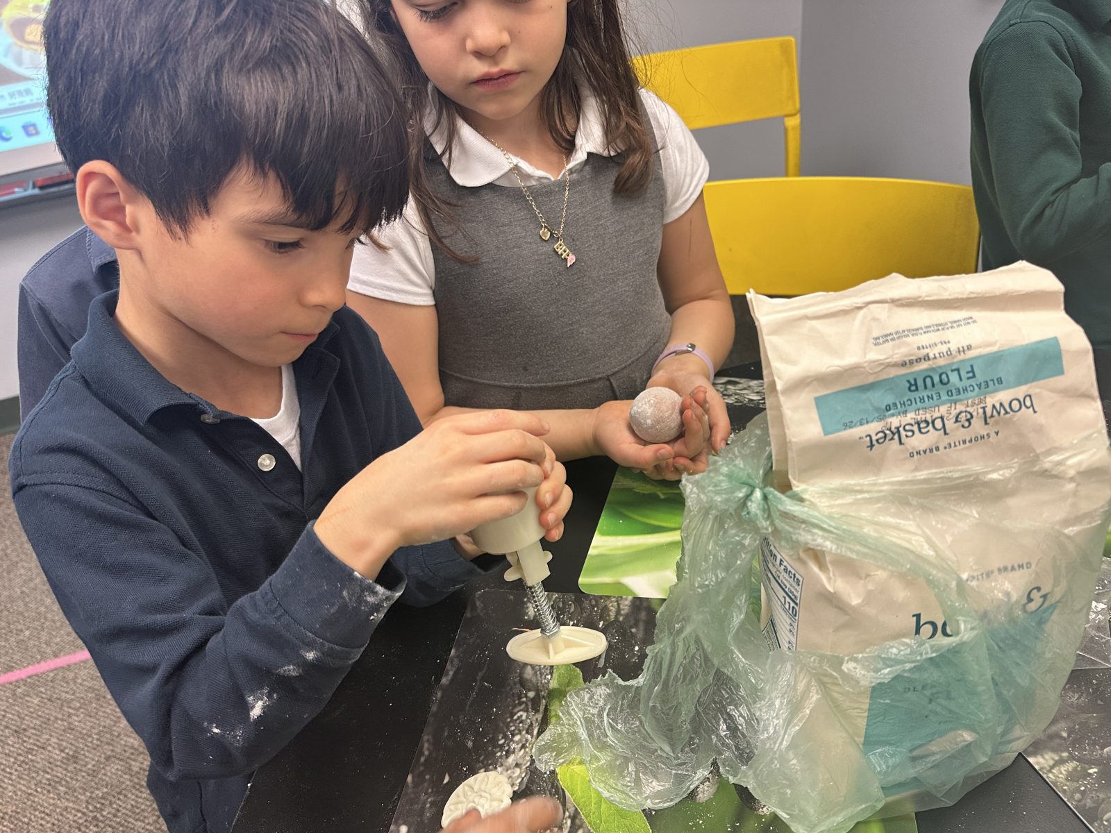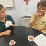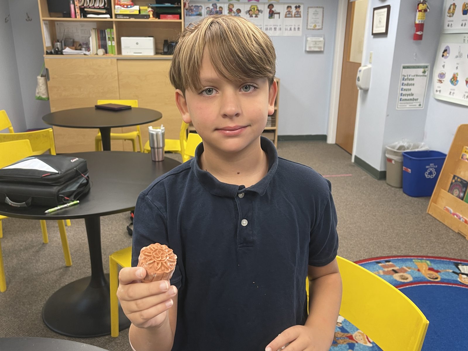 This year, students used clay instead of real dough to press into the mooncake molds. They could choose from two shapes — square or round — and everyone was excited to see their own creations emerge from the mold. They loved this cultural class and hands-on activity. Some students even said they were going to bring their clay mooncakes home to trick their siblings and parents into taking a bite!