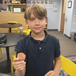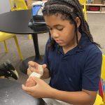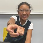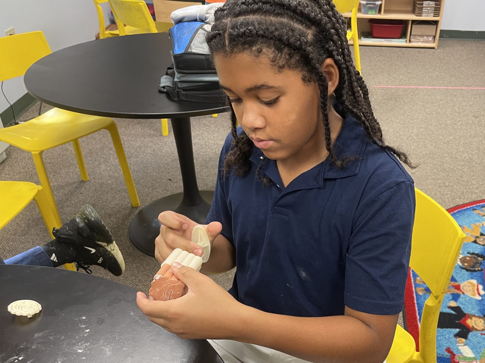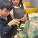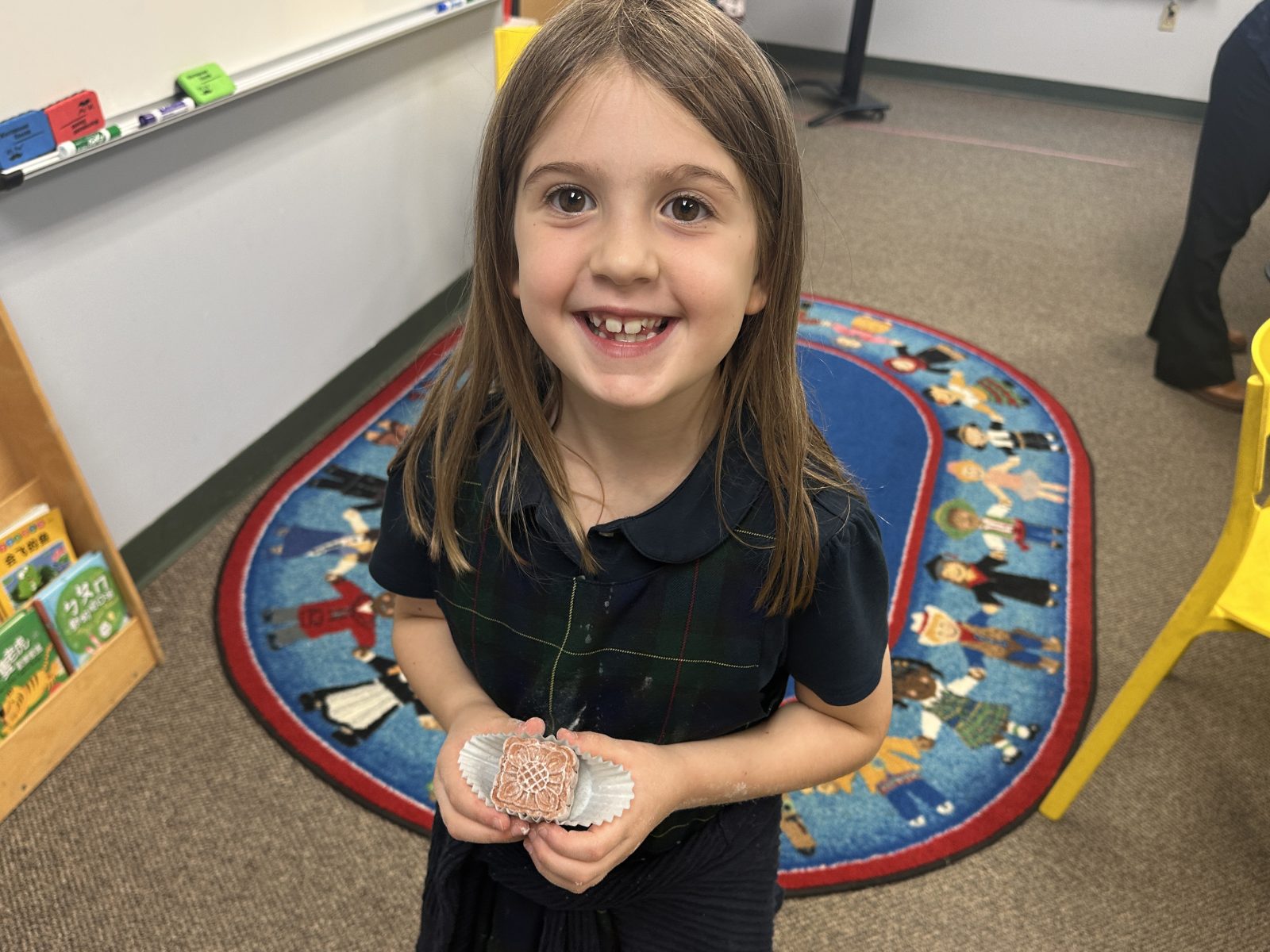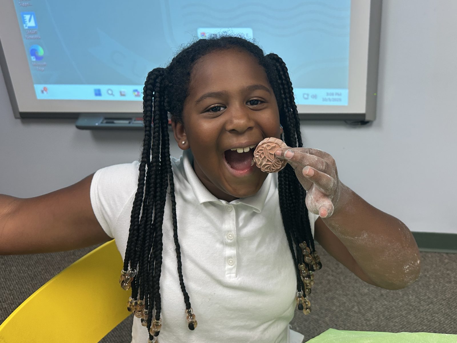 This year, students used clay instead of real dough to press into the mooncake molds. They could choose from two shapes — square or round — and everyone was excited to see their own creations emerge from the mold. They loved this cultural class and hands-on activity. Some students even said they were going to bring their clay mooncakes home to trick their siblings and parents into taking a bite!