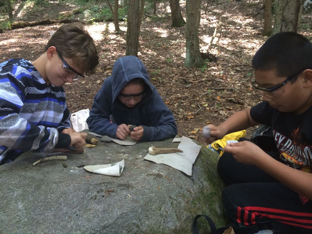 Posted by Craig KnebelAt the bottom of Tory Cave lie wondrous karst formations: water cut mable curtains and mud tubes. The sixth graders braved a narrow sinkhole entrance to explore Earth Science up close. A large central chamber was the site for the telling of the story of the Tory that may still haunt Torie’s cave. Lower level explorations brought students to the tight formation called Worm Hole and the former waterfall cut Throne Room. Back outside students had the opportunity to make their own arrowheads and carving flints under the guidance of an excellent primitive technologist.