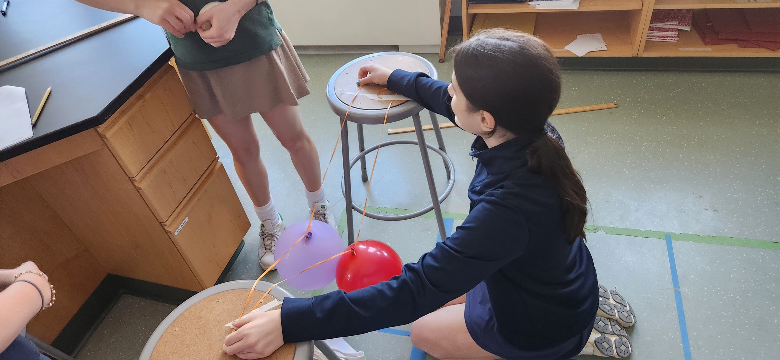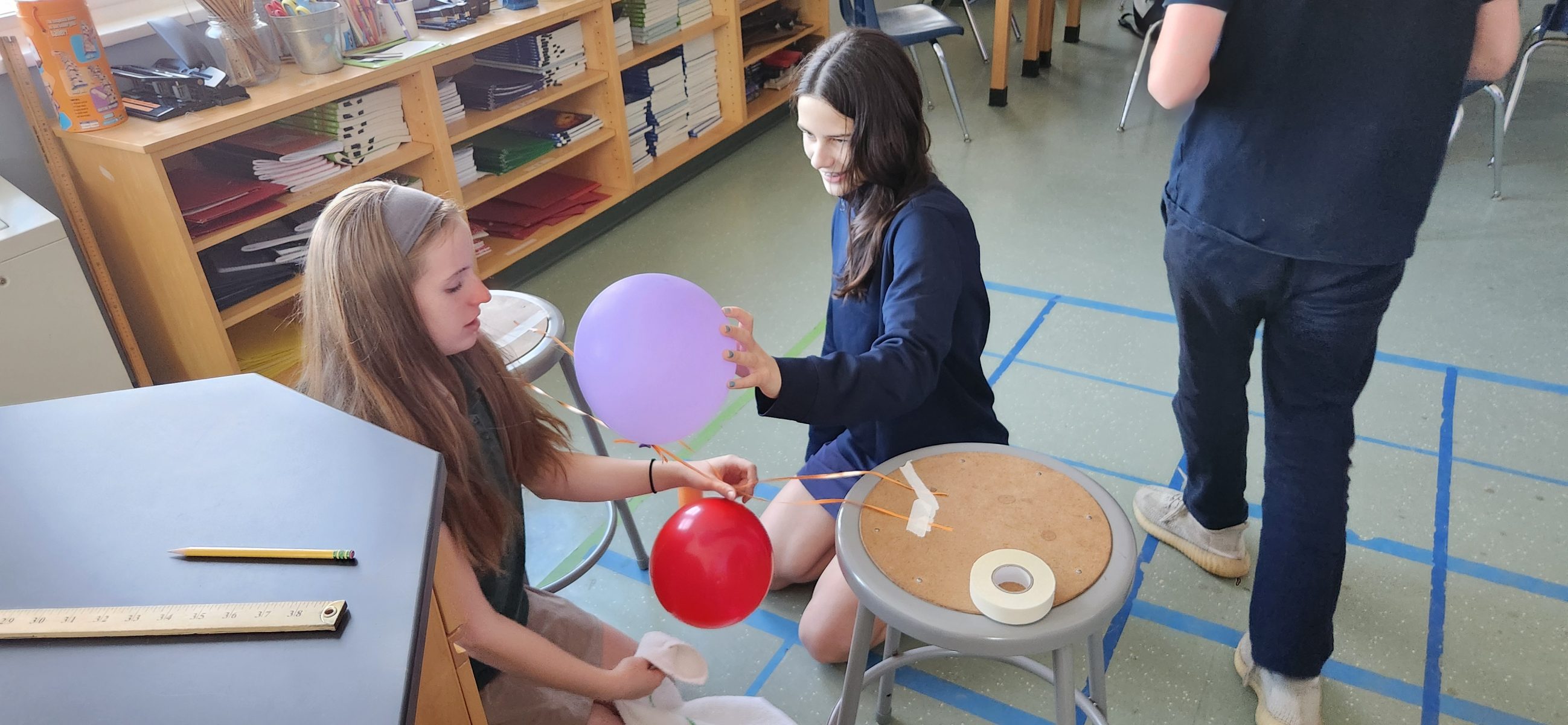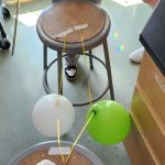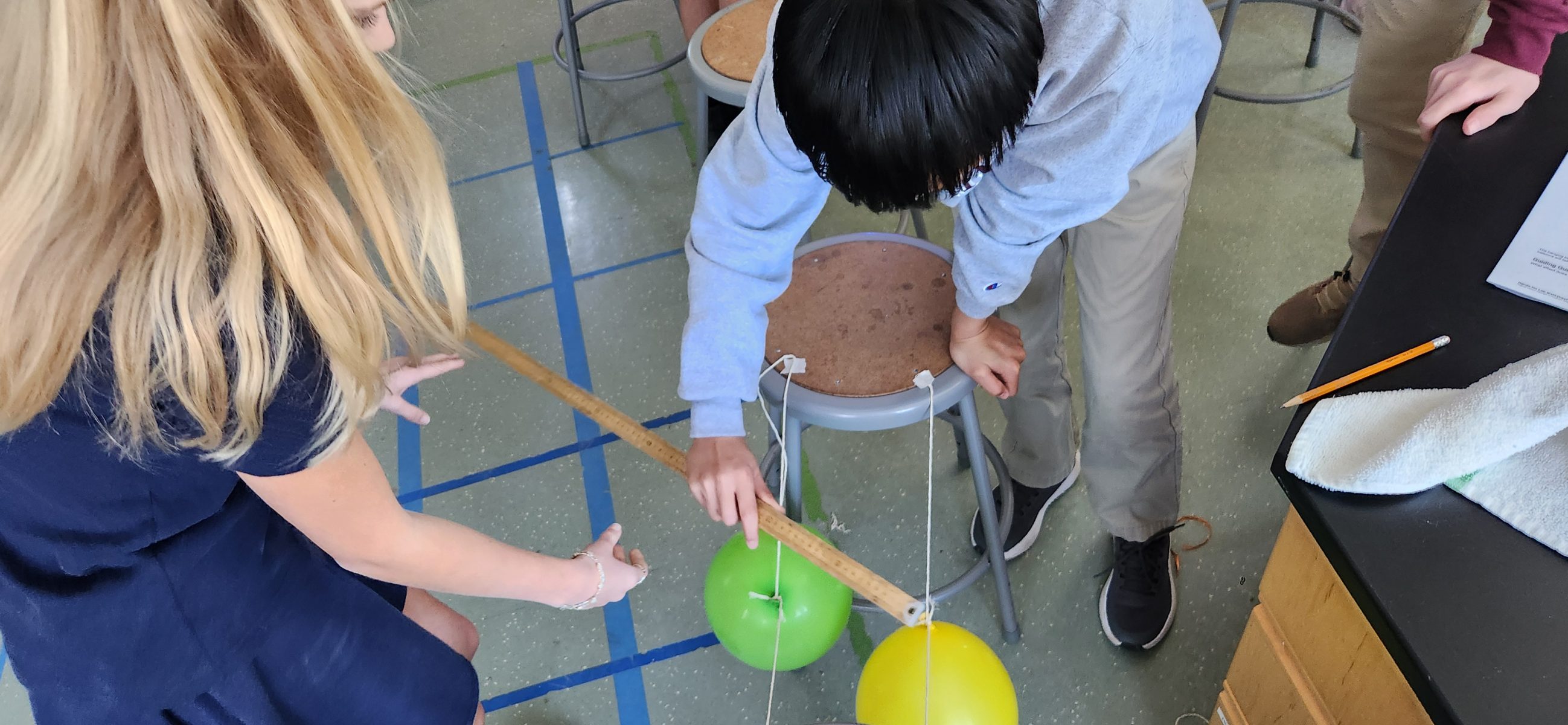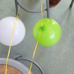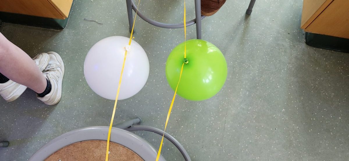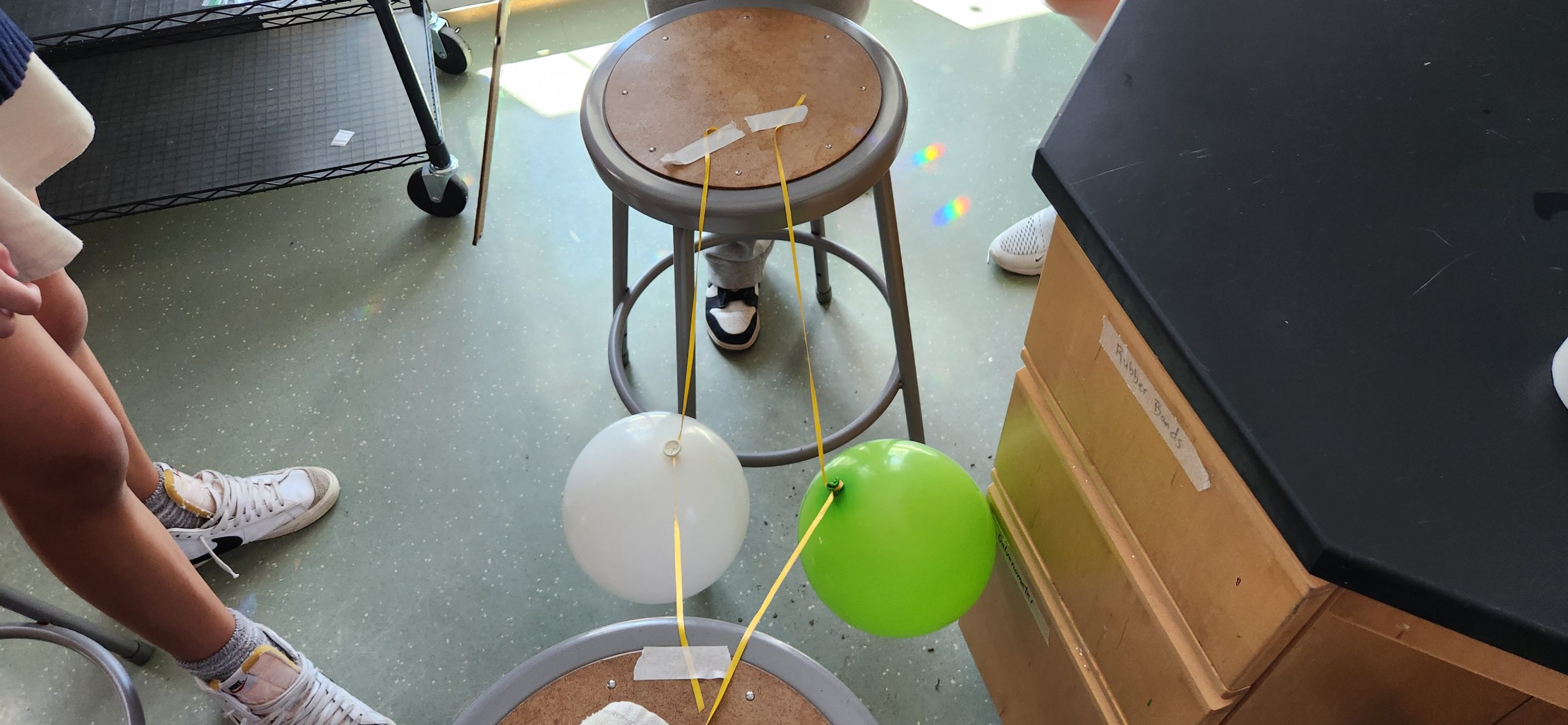 During this experiment, students were given string, 2 balloons and a wool cloth. For the first part of the lab, students tied one balloon with the string over the lab table so it would hang freely. Next, the students would rub the hanging balloon and the balloon they are holding with the wool cloth (or their hair!) an equal amount of times (for example, if they rub the hanging balloon ten times, they then rubbed the balloons they are holding ten times as well). Next, students would hold the balloon in their hands close to the balloon that is hanging over the lab table and record their observations. It was noted that due to the balloons having the same charges, they were trying to push away from each other. In the second part of the lab, both balloons were tied to separate strings and then taped in-between lab stools. When they were free-hanging they should be touching each other. Next, students rubbed each balloon with the cloth the same amount of times and they would measure the distance using a meter stick, that the balloons were repelling each other. Students repeated this 5 times and they would increase the number of rubs for each trial. The students then plotted their number of rubs vs balloon repel distance on a graph so a trend could be observed. It was concluded that the more the balloons were rubbed, the more of a charge they gained, thus the further away they would repel each other.