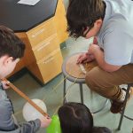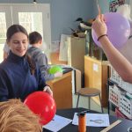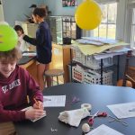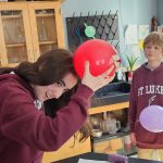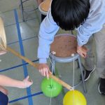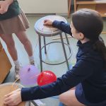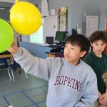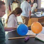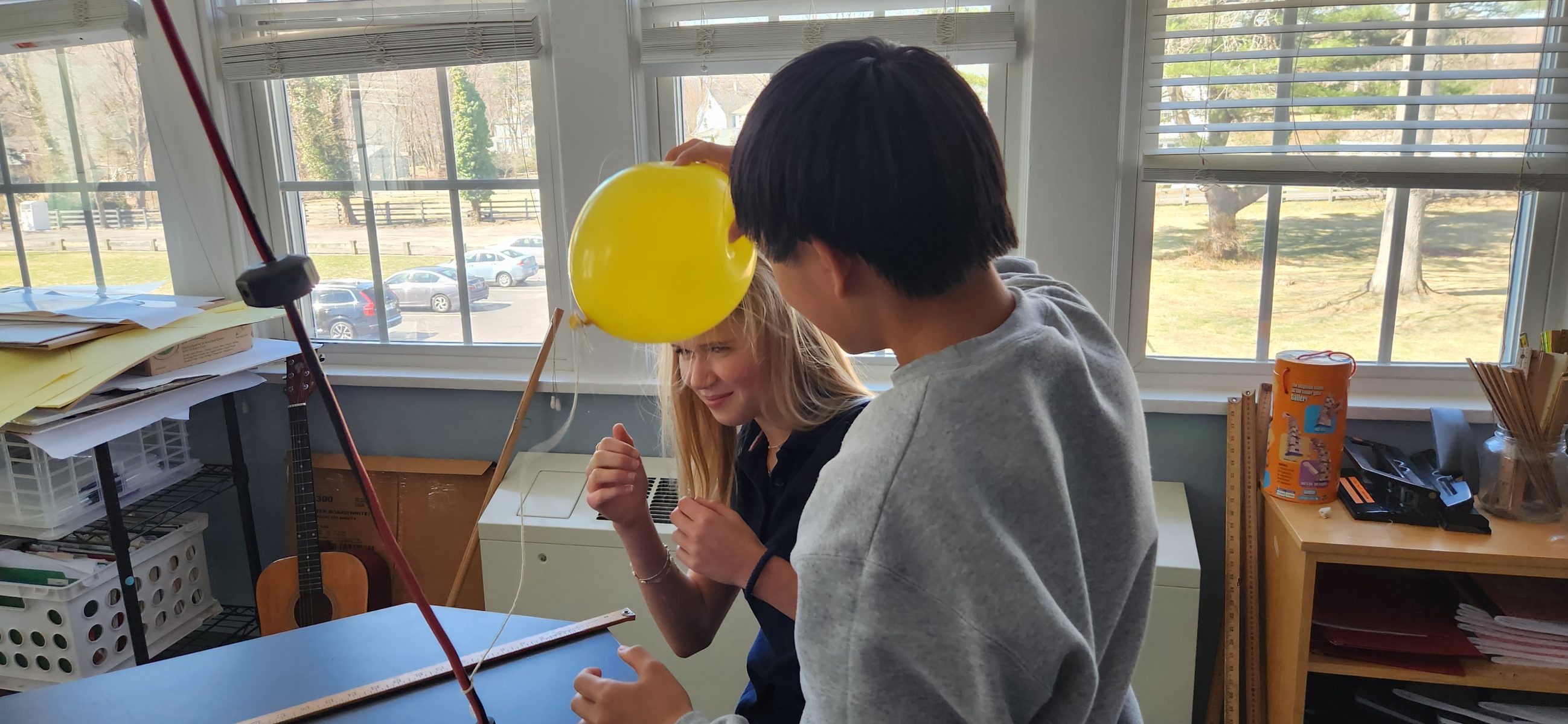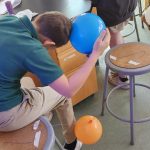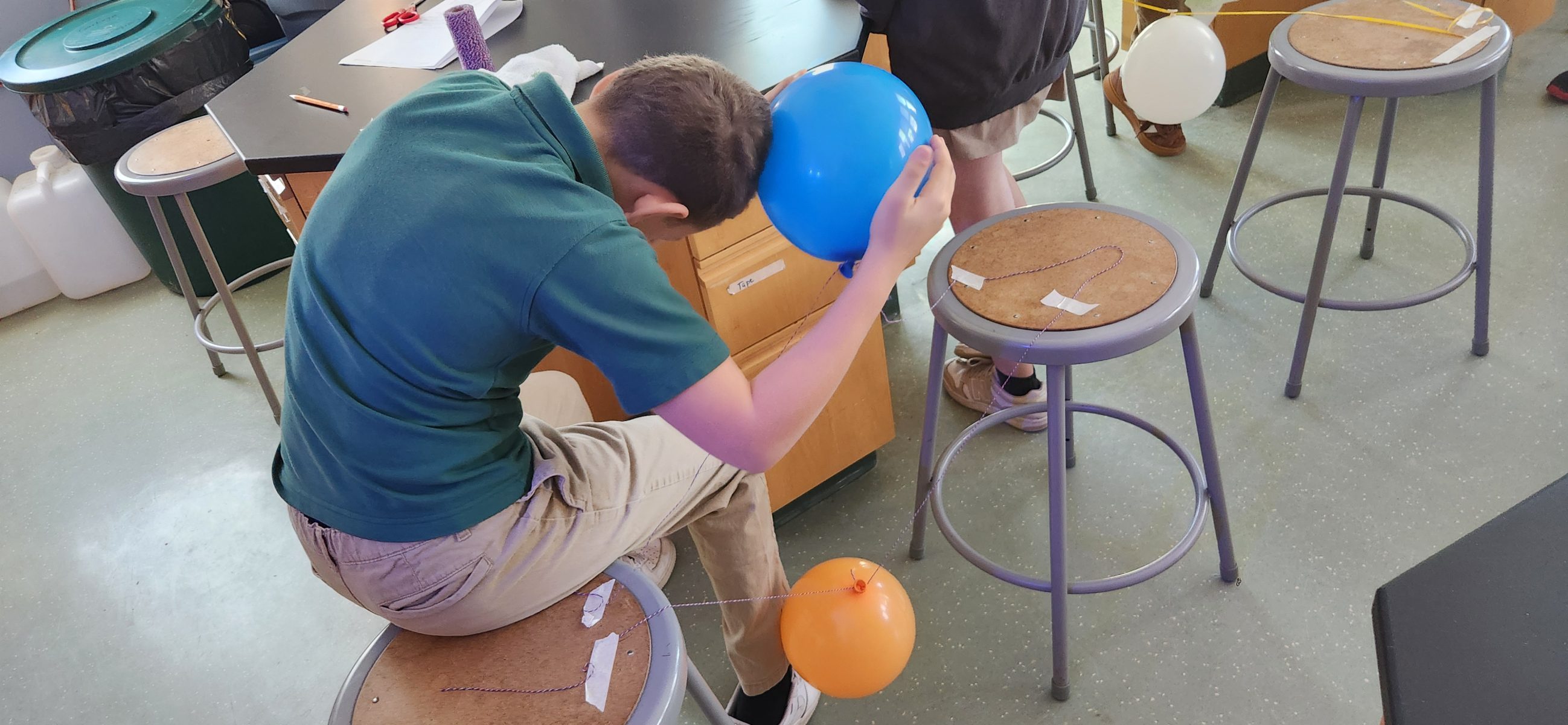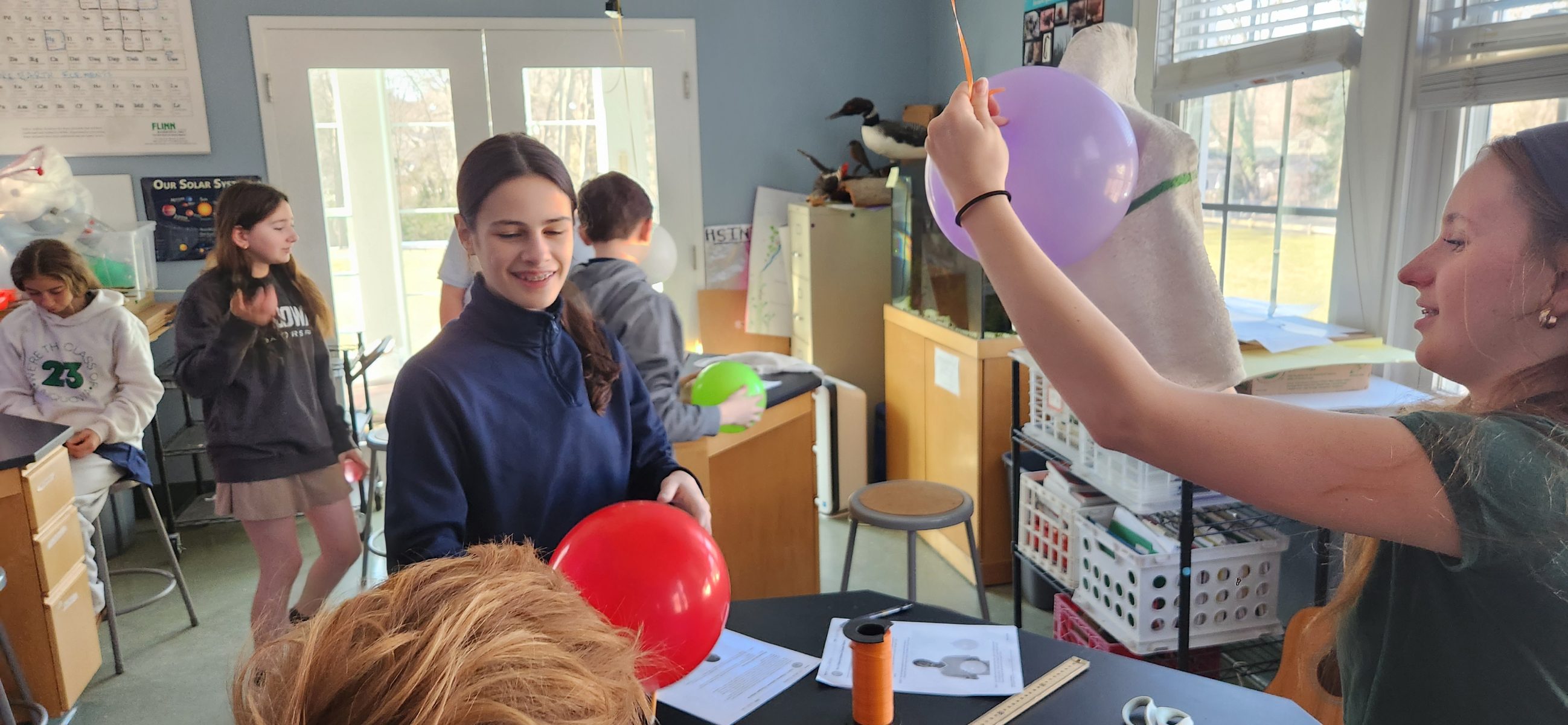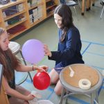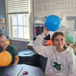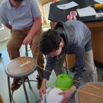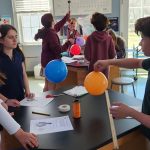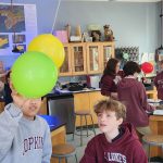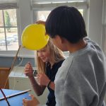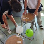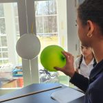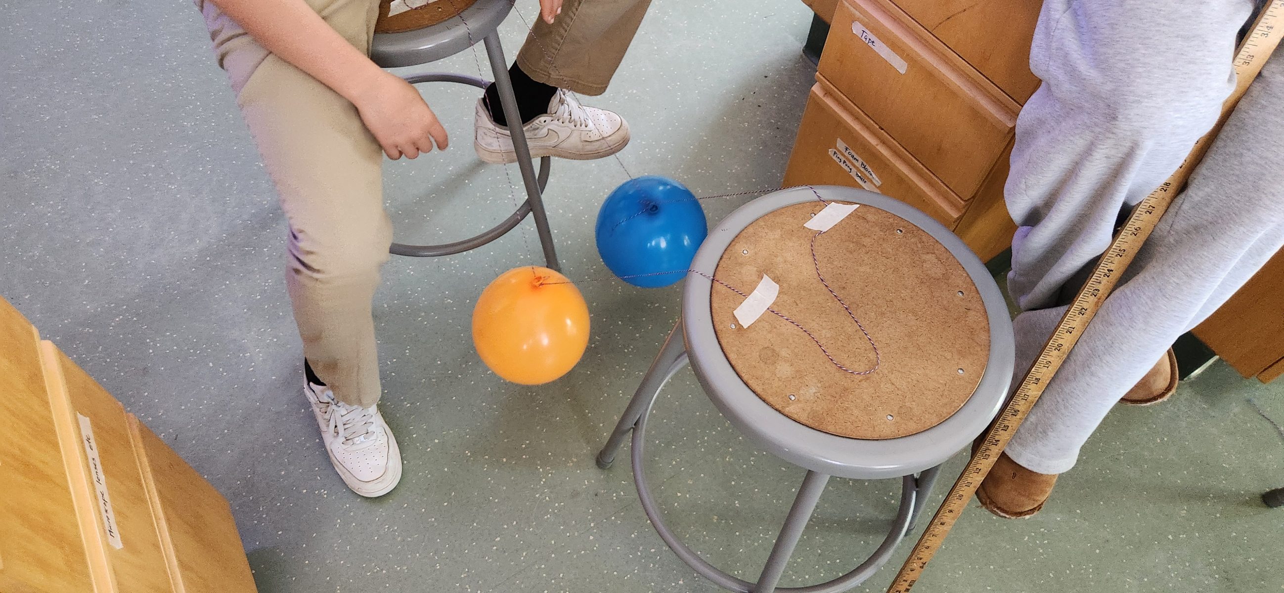 During this experiment, students were given string, 2 balloons and a wool cloth. For the first part of the lab, students tied one balloon with the string over the lab table so it would hang freely. Next, the students would rub the hanging balloon and the balloon they are holding with the wool cloth (or their hair!) an equal amount of times (for example, if they rub the hanging balloon ten times, they then rubbed the balloons they are holding ten times as well). Next, students would hold the balloon in their hands close to the balloon that is hanging over the lab table and record their observations. It was noted that due to the balloons having the same charges, they were trying to push away from each other. In the second part of the lab, both balloons were tied to separate strings and then taped in-between lab stools. When they were free-hanging they should be touching each other. Next, students rubbed each balloon with the cloth the same amount of times and they would measure the distance using a meter stick, that the balloons were repelling each other. Students repeated this 5 times and they would increase the number of rubs for each trial. The students then plotted their number of rubs vs balloon repel distance on a graph so a trend could be observed. It was concluded that the more the balloons were rubbed, the more of a charge they gained, thus the further away they would repel each other.