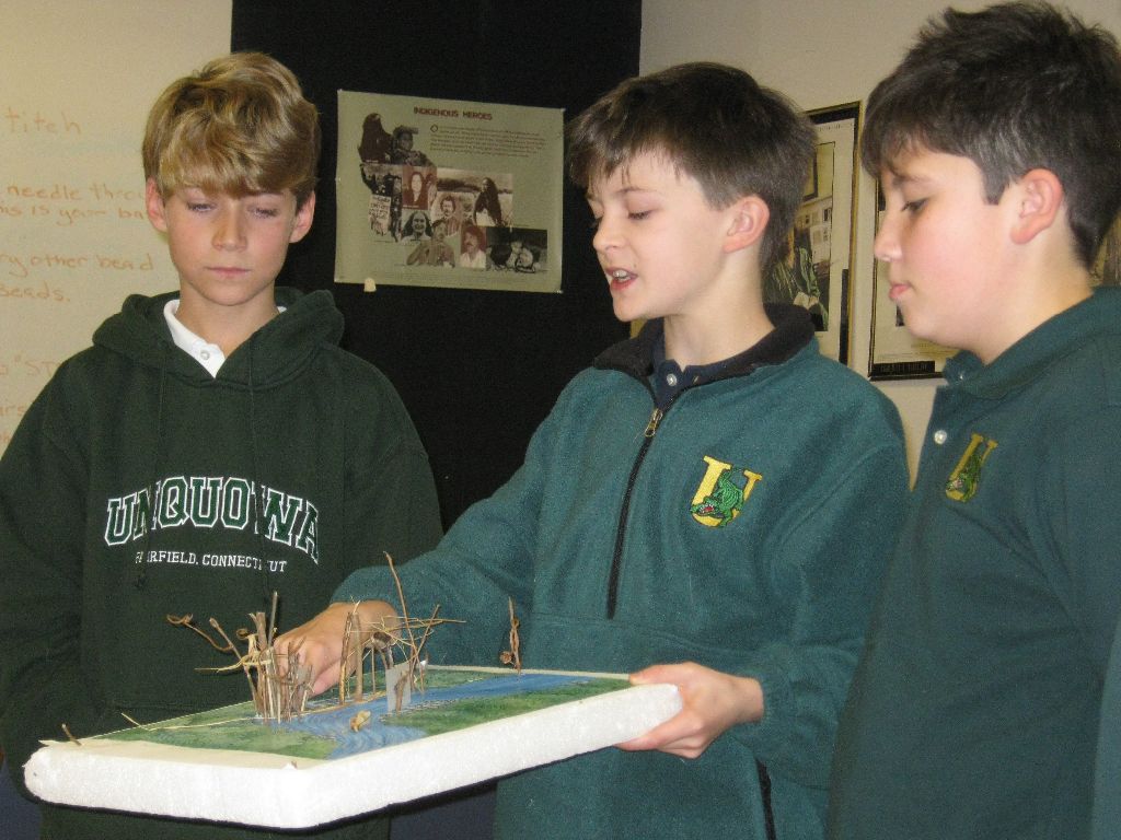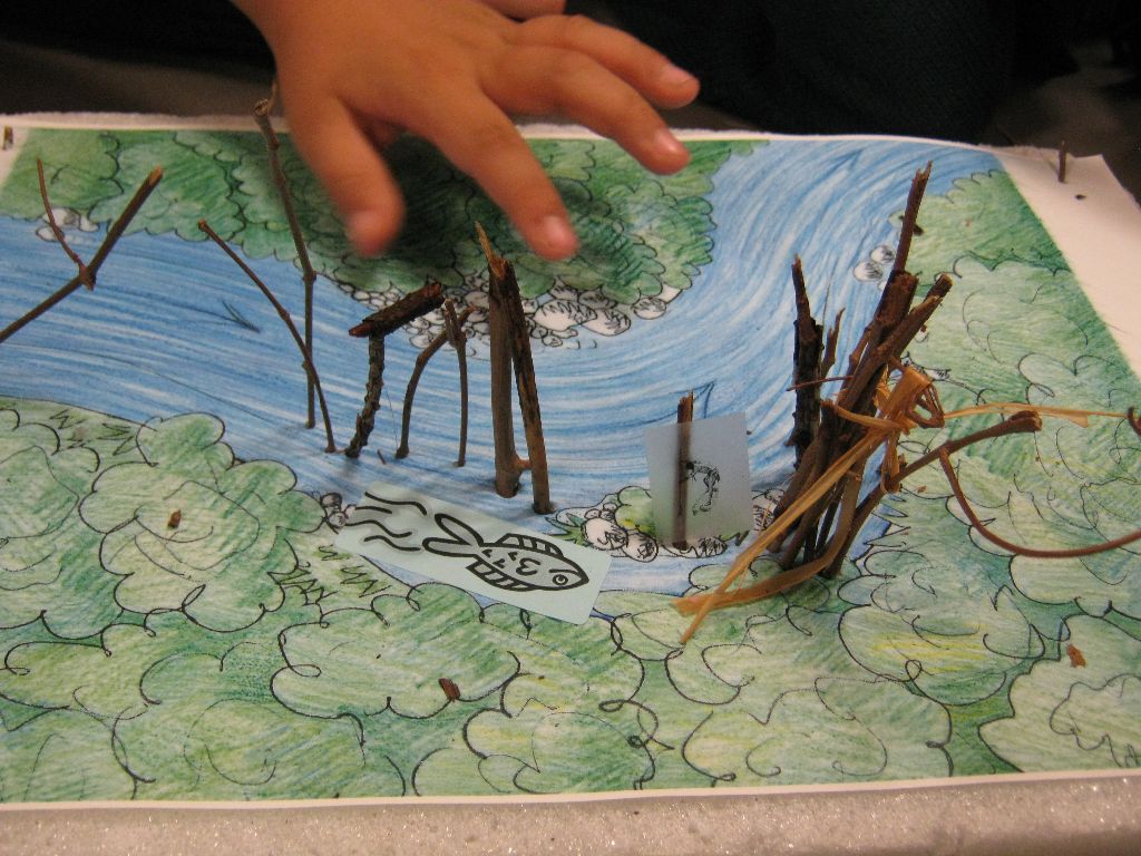 Posted by Mary FaulknerThe fifth grade class visited the Mashantucket Pequot Museum and Research Center. While there, they attended a workshop where they learned about the resources available to the Pequot Indians who lived along the Connecticut coast and learned about some of the ways they would have hunted and fished. They were then given the opportunity to construct a wier. Weirs were structures made along rivers used to trap fish. During this activity groups needed to keep in mind the direction of currents, how tides would effect the rivers and that rivers were also used for transportation. When the activity was complete, each group presented their finished projects to their peers.