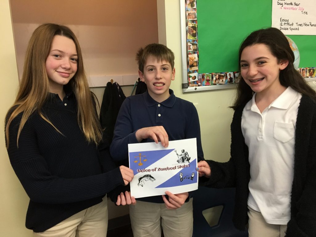 Similar to Model U.N., students represented one of the seven countries on the fictional continent of Lostralia. Provided with a unique history, social structure, religious beliefs, intelligence secrets, and objectives, students had to improve the previously set factor totals reflecting the strengths or weaknesses of each country (e.g., food stability, infrastructure, military power, etc.). Three students, a minister of press, a diplomat, and a head of state, represented each nation. Now, this sounds too complex for a group of seventh graders, right? Not for our scholarly students! They threw themselves into the game with all the vigor and exuberance we could have hoped for, creating flags, national anthems, detailed maps, even passports! Each country produced press releases that used persuasion techniques, including propaganda; they scheduled diplomatic meetings and negotiated trade and military defense treaties.