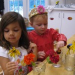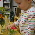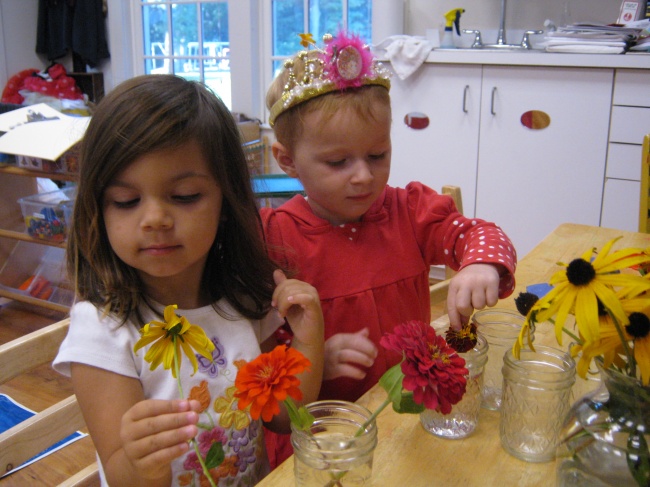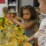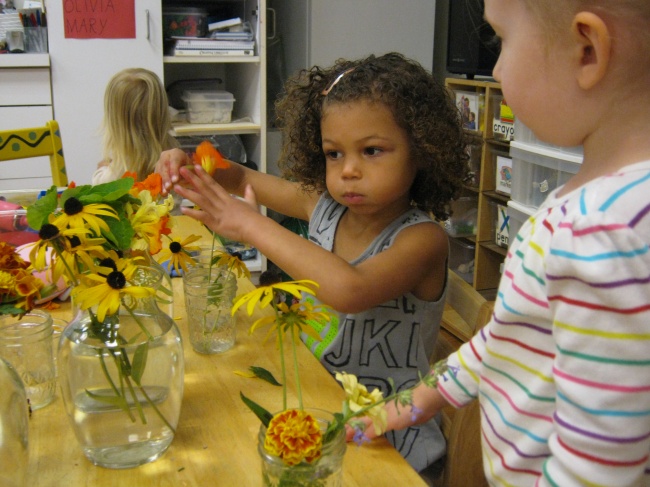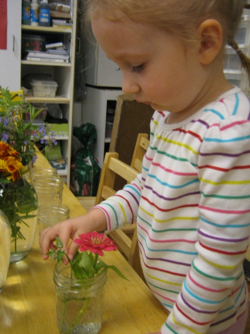 Posted by Janice ShannonThe children had a wonderful experience arranging flowers in vases for the dining room this week. Each child had picked out their favorite colors and shapes of the flowers in the gardens here at Unquowa. Pouring the water and cutting the flowers to just the right height brought a new awareness to the children. The conversation was “I need a pink one” and “Can you give me the orange one?”. They were so proud of the vases and liked seeing them on the tables. They really brightened up the dining room.