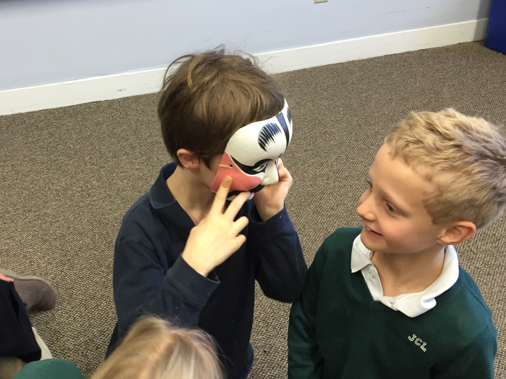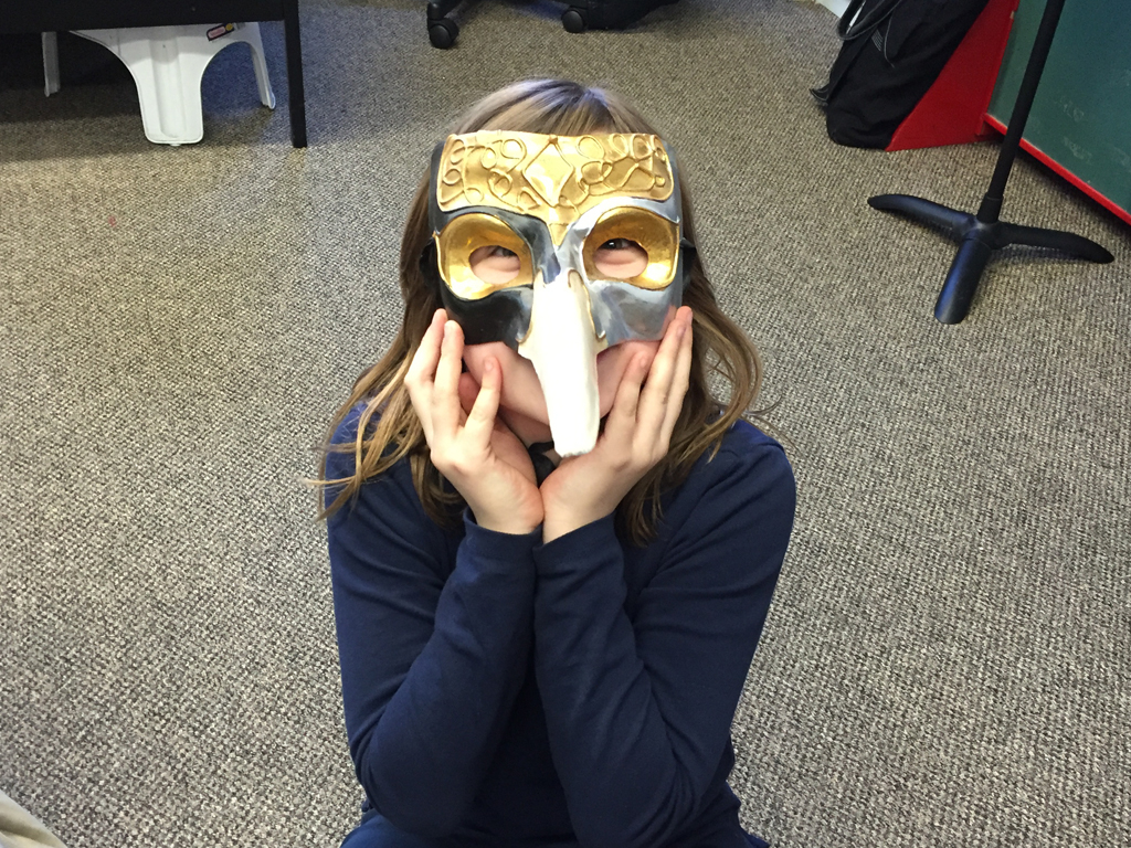 Posted by Alyson CahillThird grade drama students have begun learning all about masks, specifically, how to use them as an actor! So far, we have become different characters and beings by using only the masks found in the drama classroom. Students took turns wearing traditional Venetian and Chinese masks, and then used somewhat silly stick masks to create short scenes. Over the next few weeks we plan on exploring mask work in various forms, which will include making our own masks and even playing with clown noses! Our goal is to see what happens to our bodies and voices when we wear different types of masks.