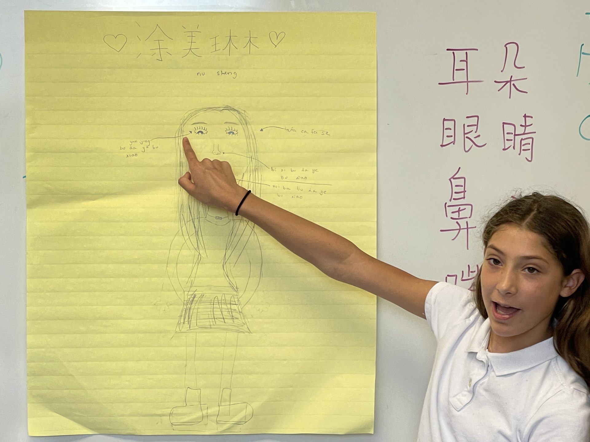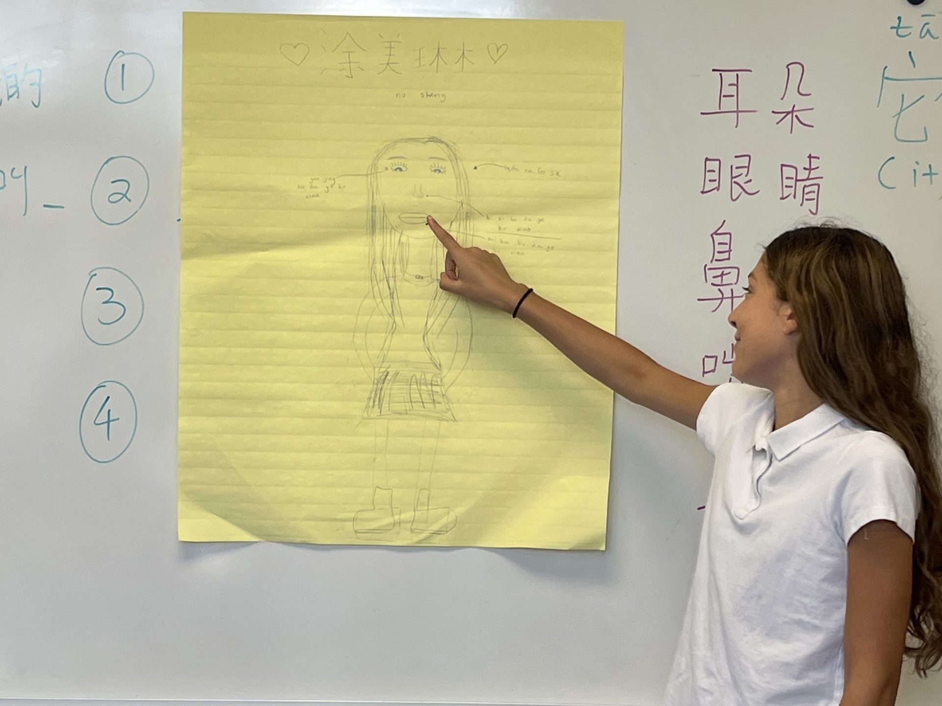Posted by Carina BlackwellSeventh Grade Mandarin students have been learning adjectives to describe body parts and their attire. In the class they designed made up friends, or real friends on a poster and wrote all different adjectives for the different parts. When done, students presented their portraits to the class and had to come up with sentences to complete the “show and tell”. They had fun making the portraits, learning the adjectives and also showing how we have some excellent artists!