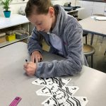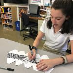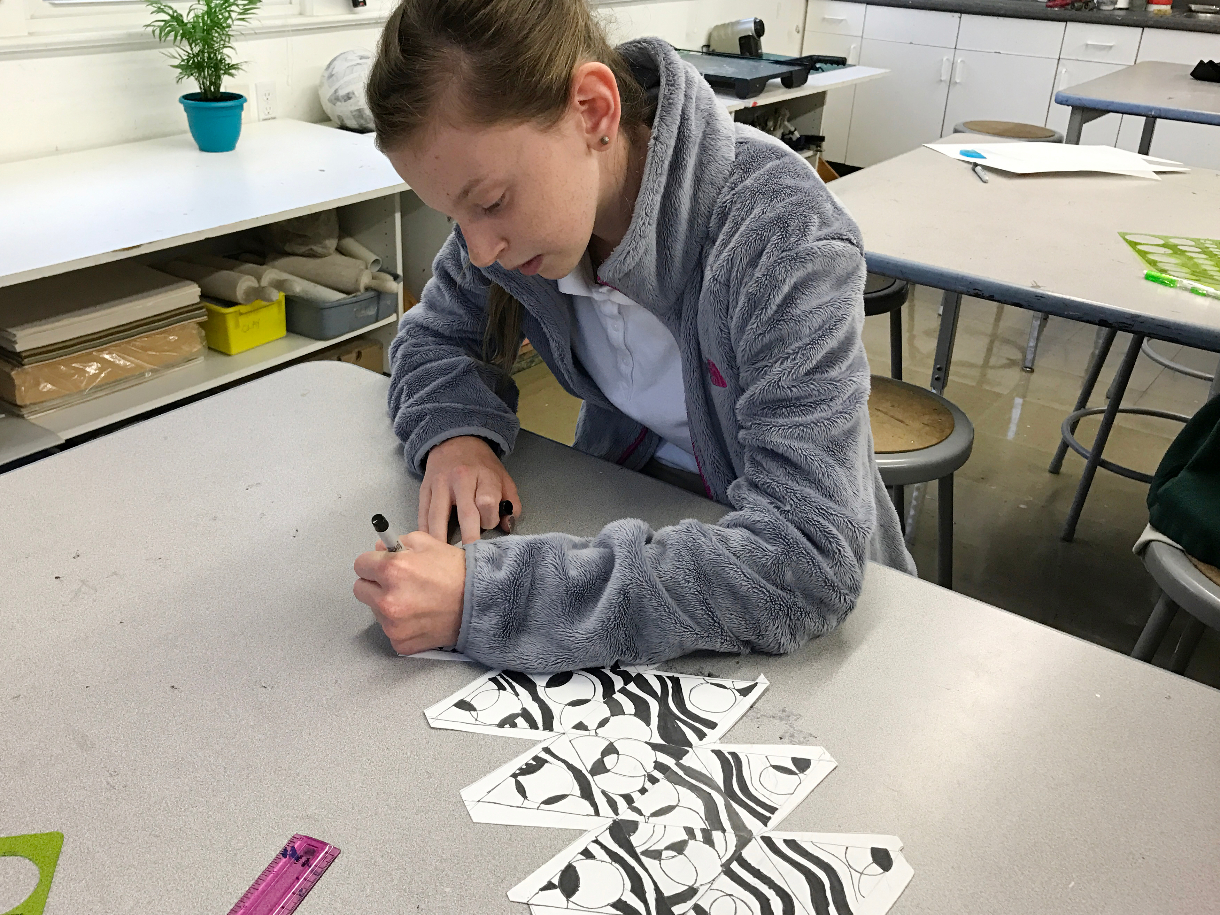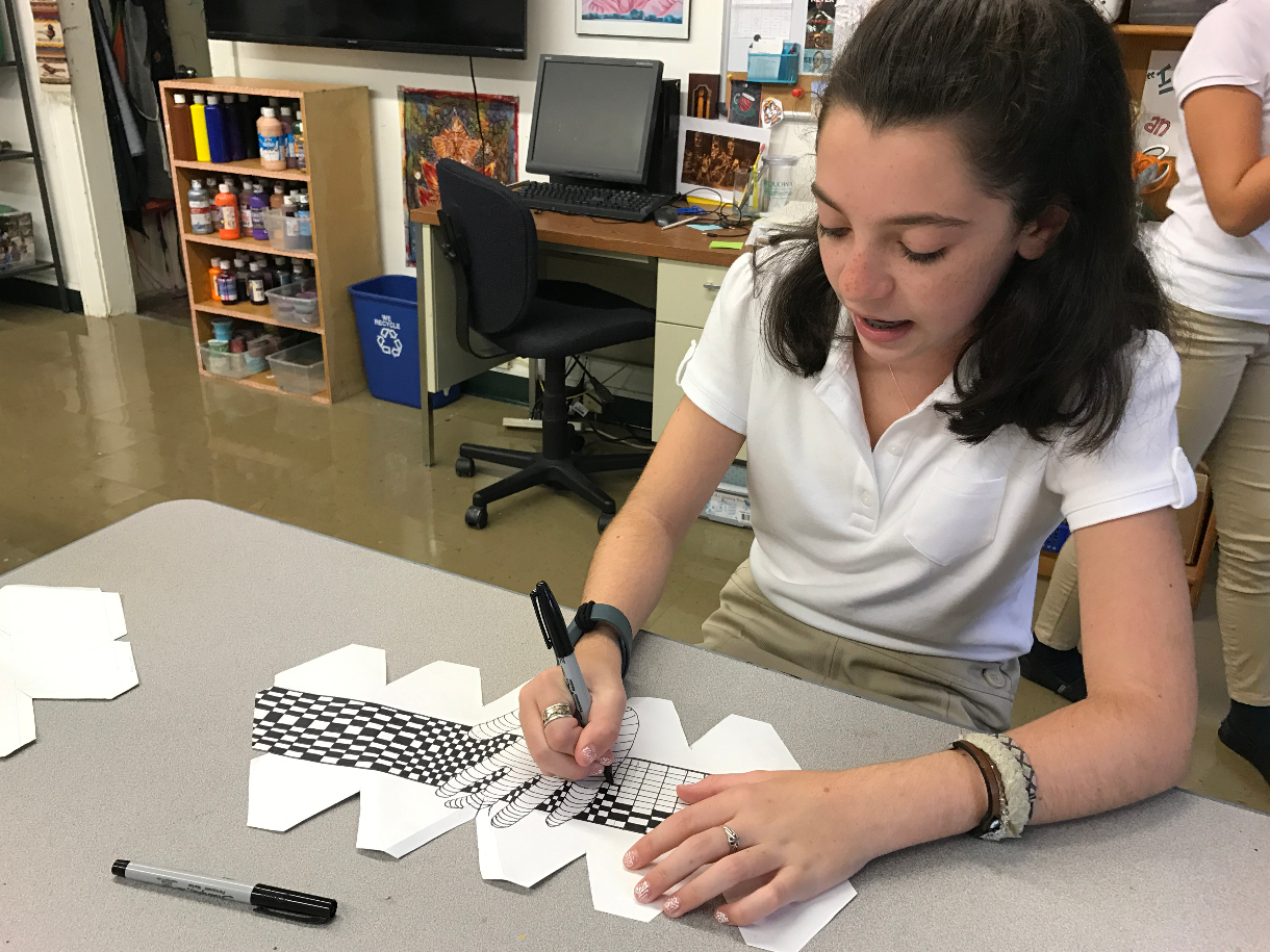 Posted by Krissy PondenBridget Riley was one of the most influential artists of the Op Art movement of the 1960’s. She painted large scale optical illusions, first using only black and white, to create complex images that tricked the eye. Soon the bold and vibrant designs caught on and became a part of the mod aesthetic of the era, and Op Art was seen everywhere from fashion to advertising. The seventh graders looked at examples of Riley’s art and then learned how to create their own illusions. We then combined this idea with a geometry concept by drawing our illusions on a three dimensional shape called an icosahedron, a polyhedron composed of 20 equilateral triangular faces. The students created a template from a single sheet of paper and then decorated it in black and white optical art designs. Look for them hanging from the art room ceiling soon!